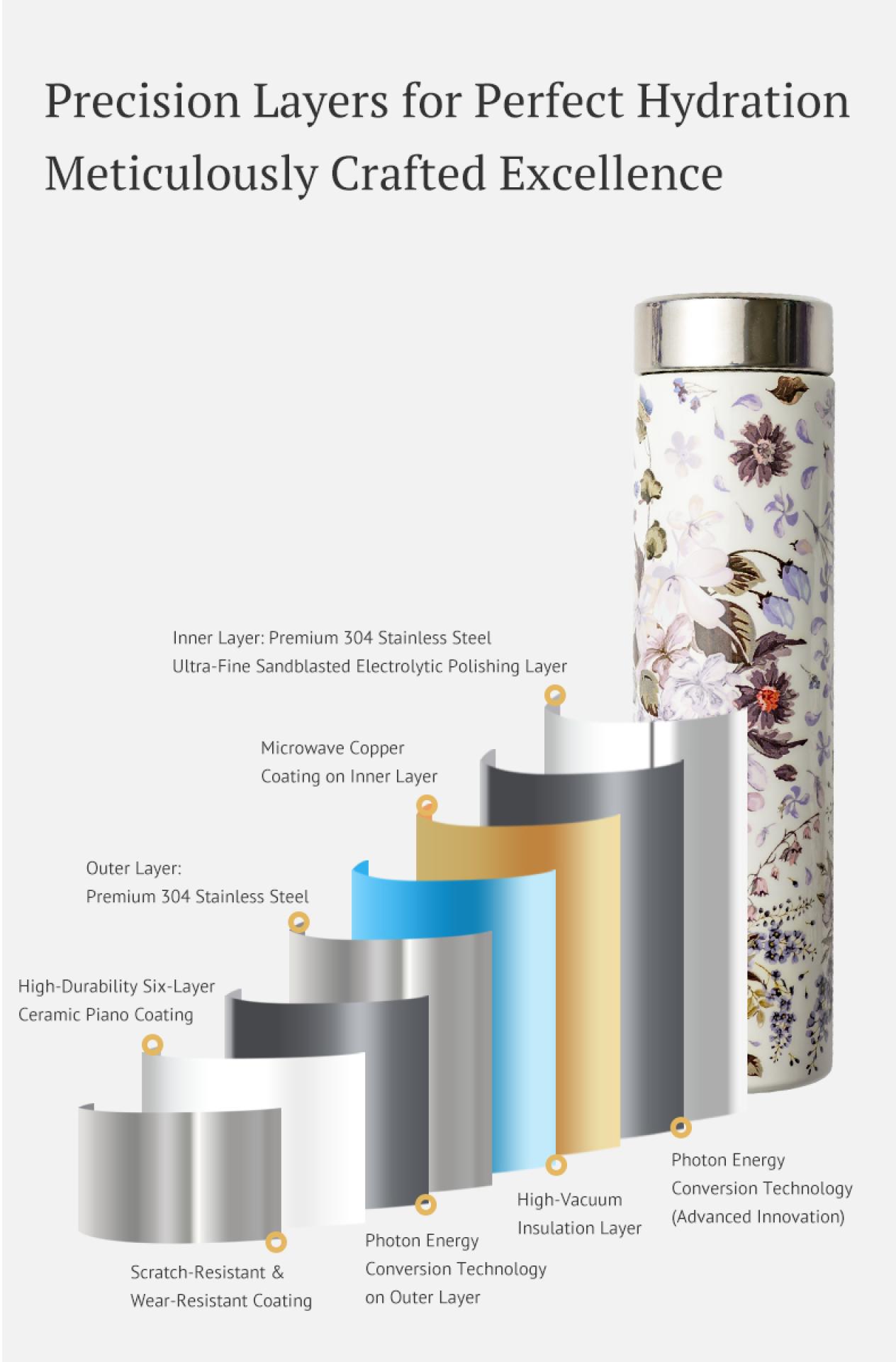 This innovative bottle showcases an advanced processing method, skillfully combining both inner and outer layers made from high-quality materials. The inner layer features a meticulously sandblasted and electrolytically polished 304 stainless steel, enhanced with cutting-edge light wave energy conversion technology. Beneath this, there is a copper-plated microwavable layer, complemented by a high-vacuum insulation layer that ensures optimal temperature retention. As far as the outer layer is concerned, it too is crafted from durable 304 stainless steel and employs light wave energy conversion technology. However, what truly sets this bottle apart is its exquisite finishing—a high-hardness, six-layer ceramic piano lacquer that not only provides a luxurious texture but also boasts remarkable scratch and wear resistance.