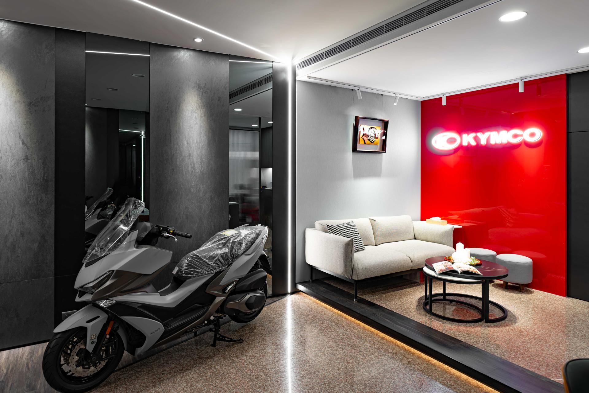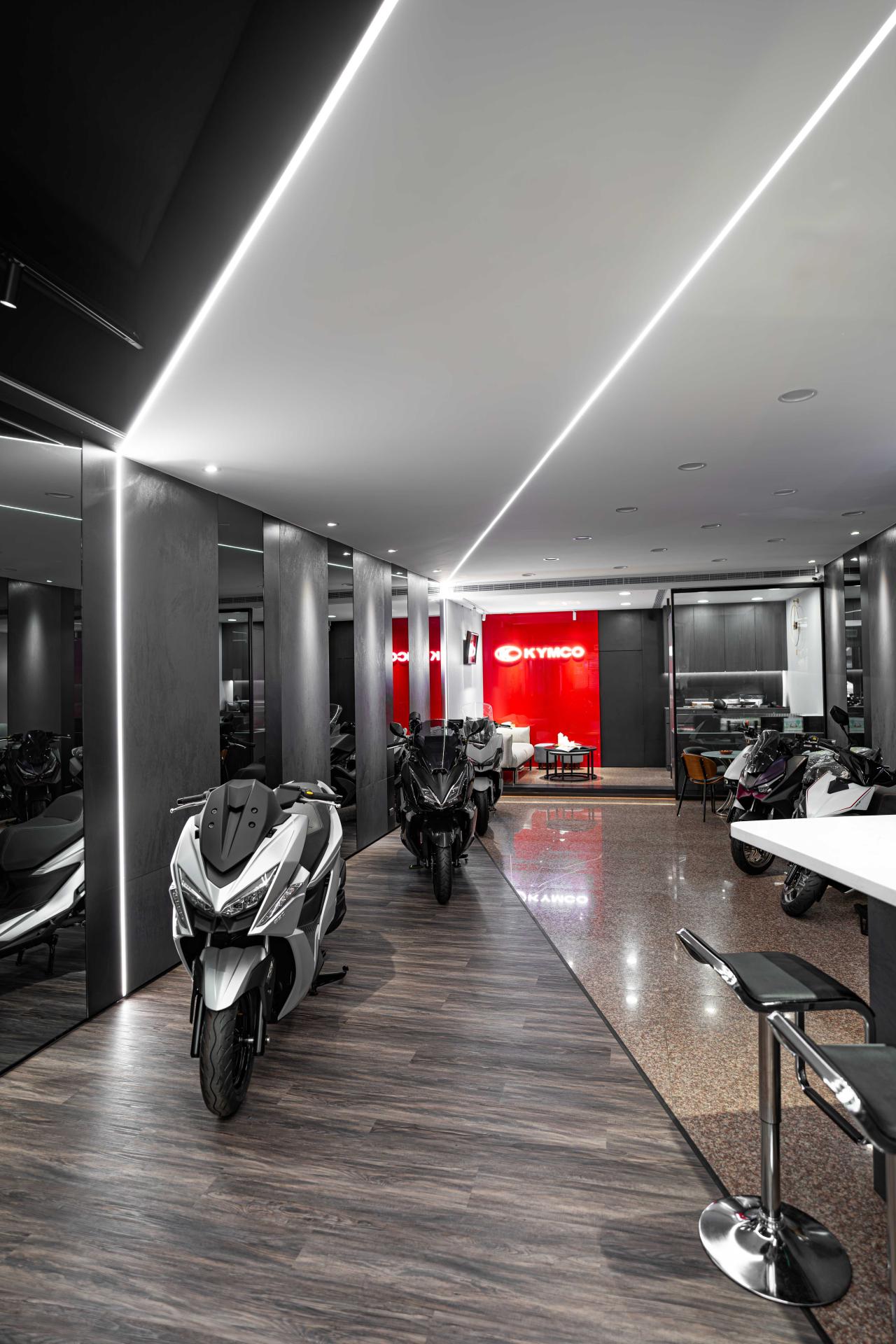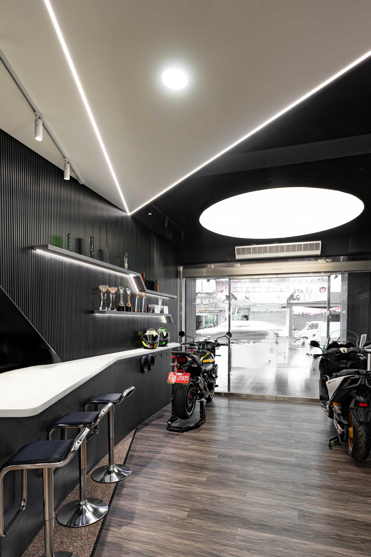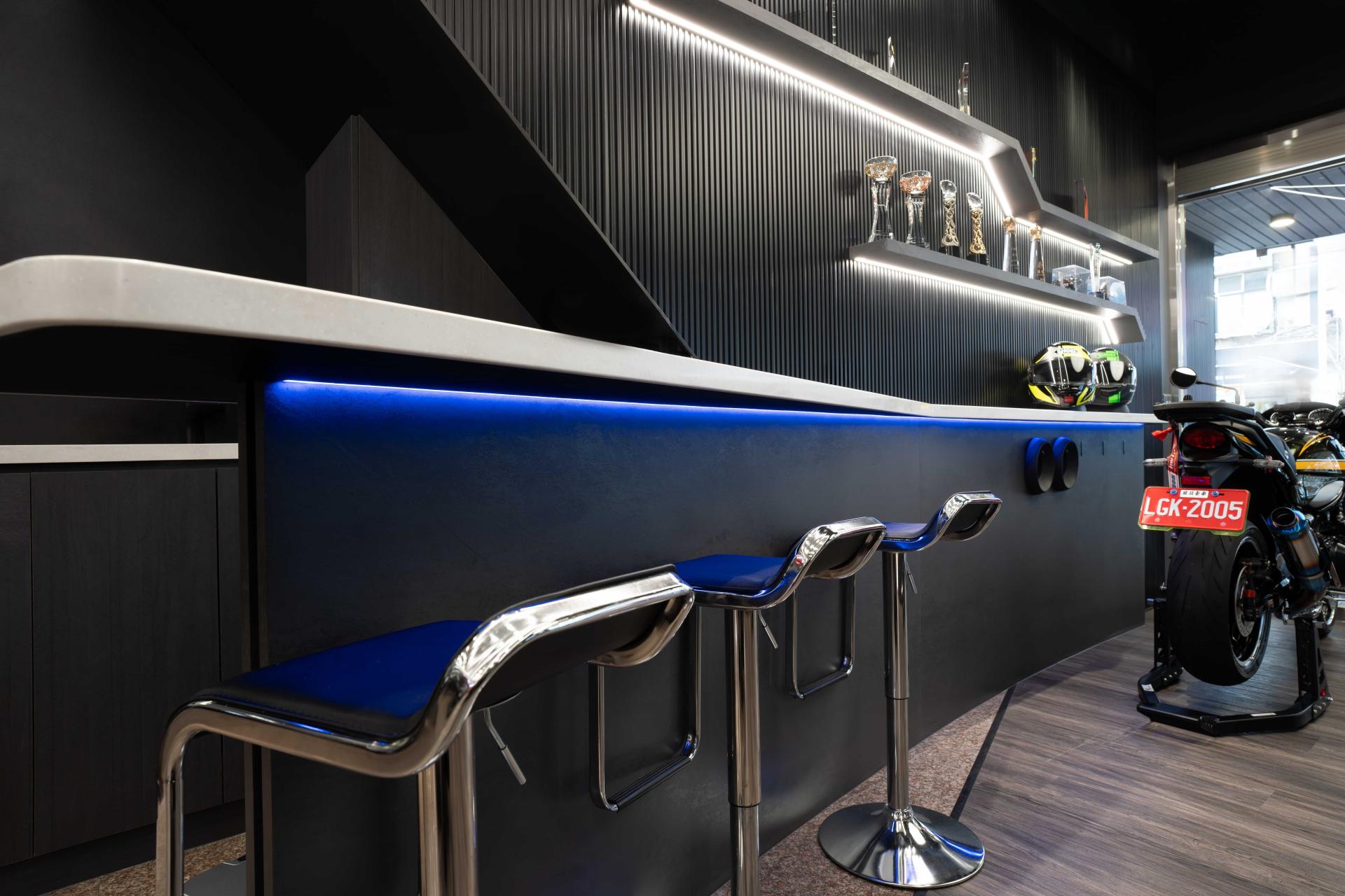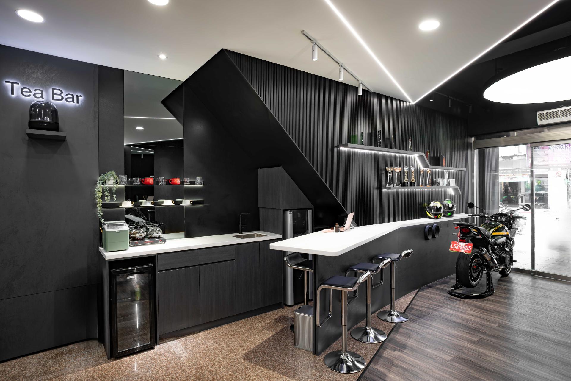 Responding to the linear nature of the site, the space is divided into three progressive zones (front, middle, and rear) each layered with evolving visual elements such as color blocking, directional lines, and material transitions. A 220 cm suspended circular light installation at the entrance becomes a visual focal point, crafted with a custom combination of a metallic frame, light-sensitive fabric, and LED strips. This feature not only draws attention like a storefront display but also offers energy-efficient, diffused lighting that accentuates the showcased vehicles. Along the front walls, a brand Wall of Honor and a diagonally angled bar counter define the entry sequence. Functional elements such as an interactive digital whiteboard and a perforated metal backdrop wall are framed in metallic finishes, merging brand expression with utility.