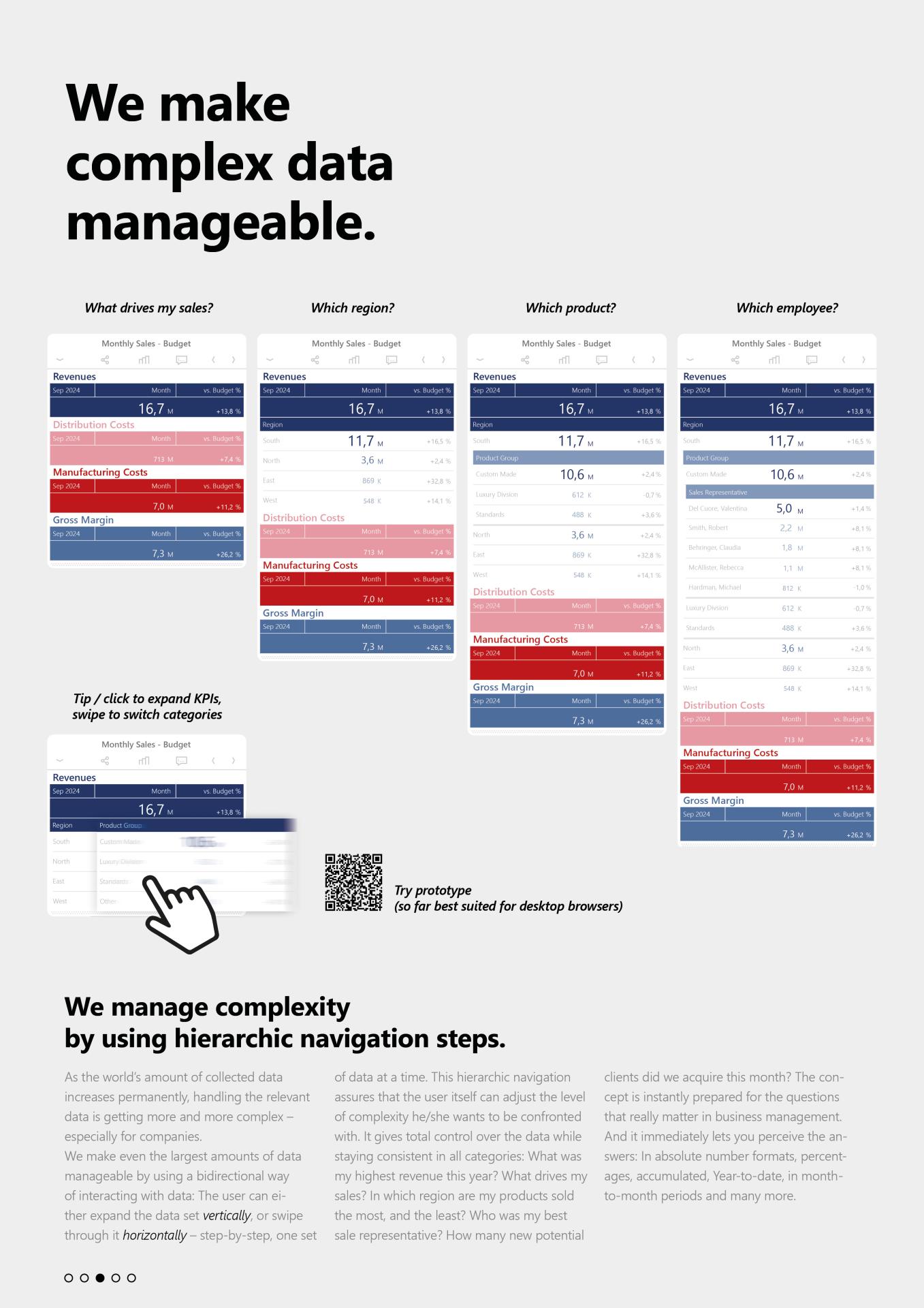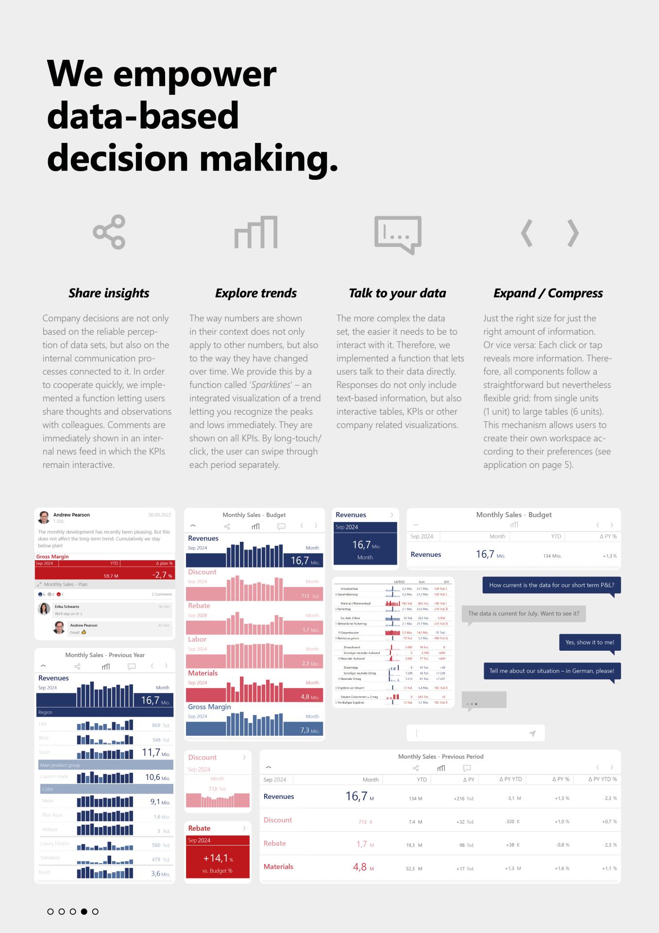Addressing the growing complexity and volume of enterprise data, DeltaApp empowers users with hierarchical navigation. With intuitive gestures, they can zoom from high-level summaries to granular details, or expand horizontally for broader context—always maintaining coherence and control. Sparklines embedded in key performance indicators offer quick at-a-glance trend analysis, minimizing the need to switch screens or modules.