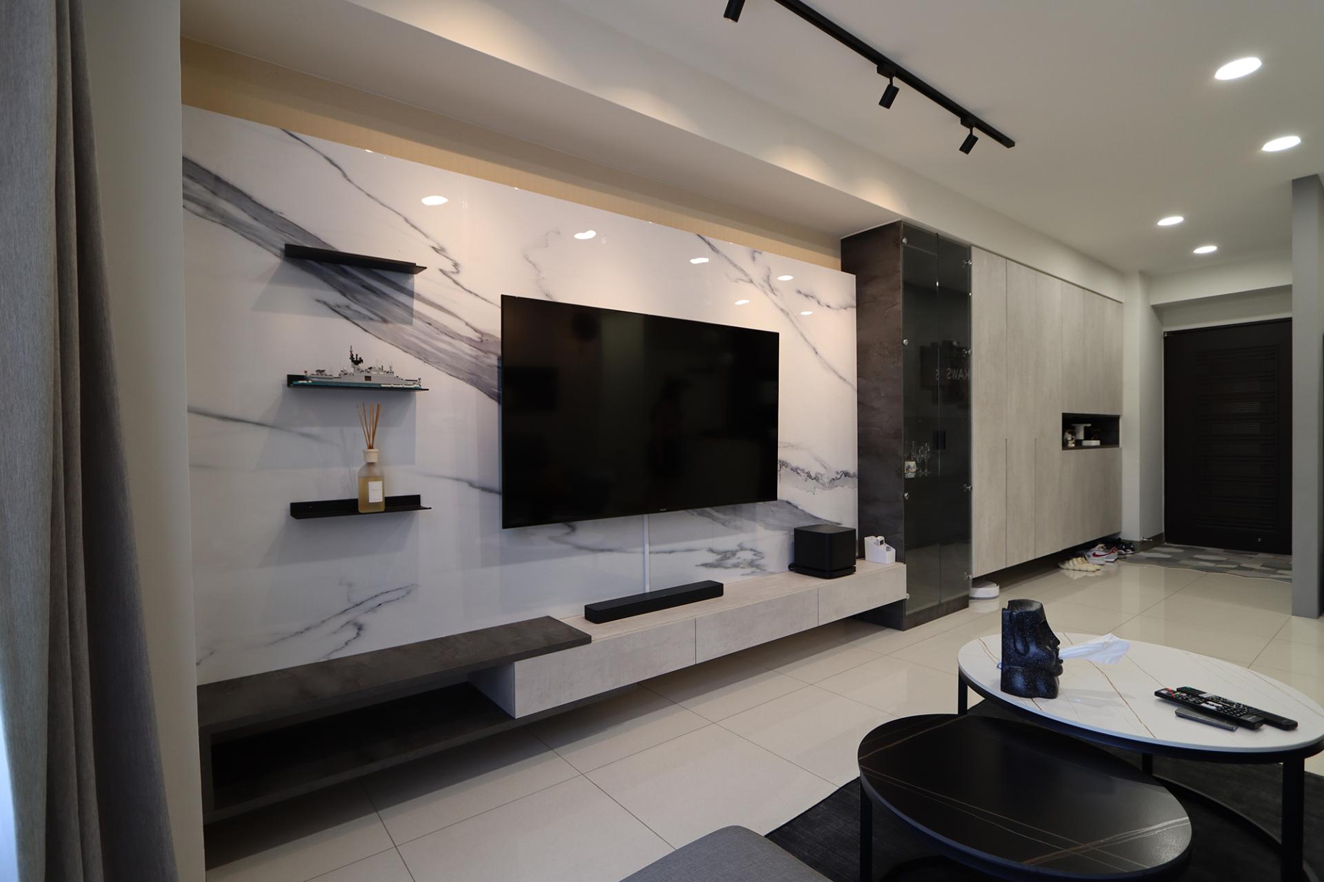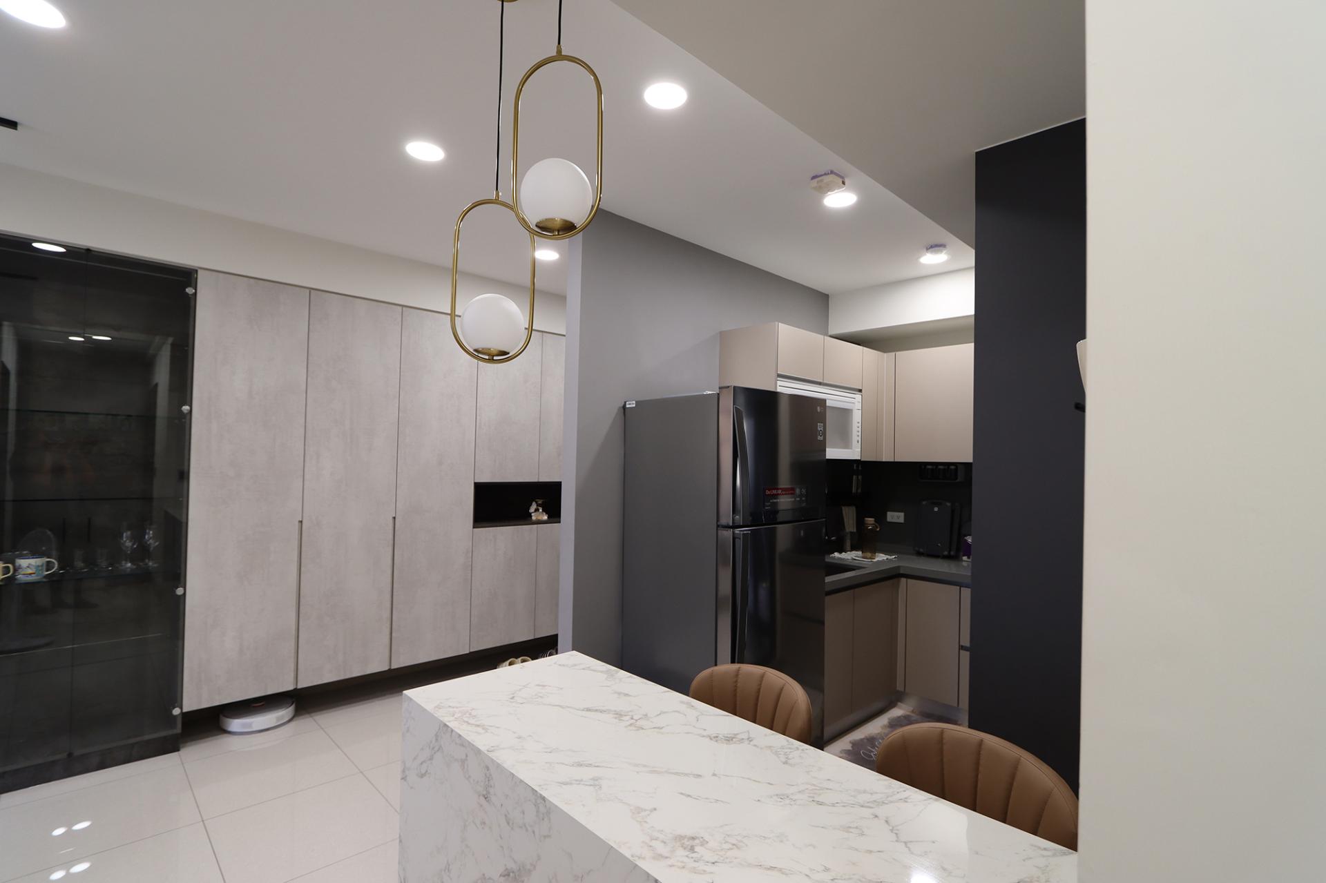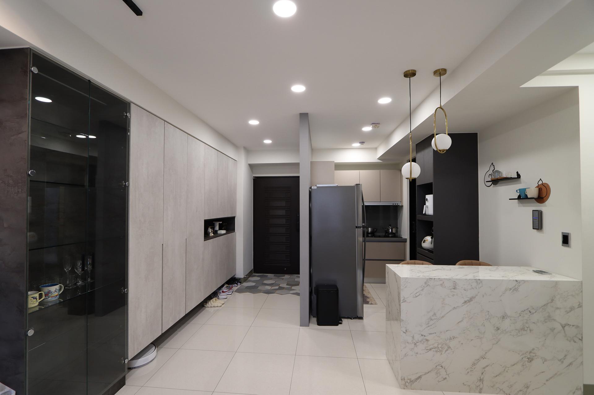 Moreover, cleverly delineating the living room from the kitchen, a stylish bar counter adds both function and flair, preserving the open feel of the layout while distinctly defining each area. The walls are predominantly adorned with elegant white marble and raw concrete panels. Their light-hued textures not only create a sense of visual expansion but also enhance the spatial hierarchy, drawing the eye upward and outward.