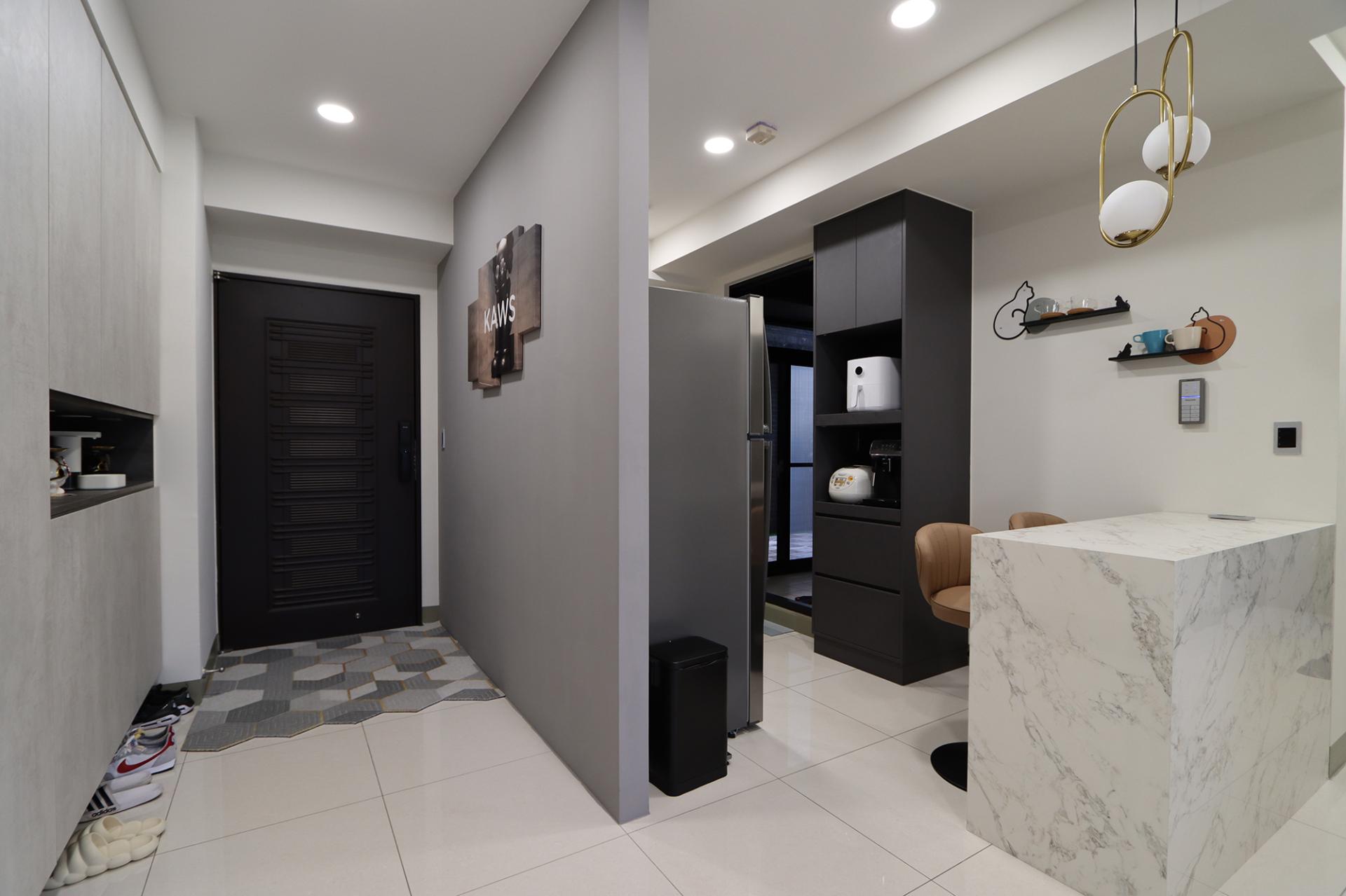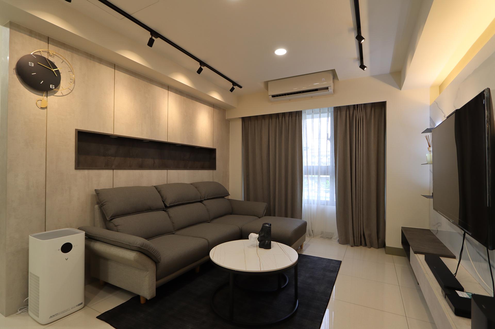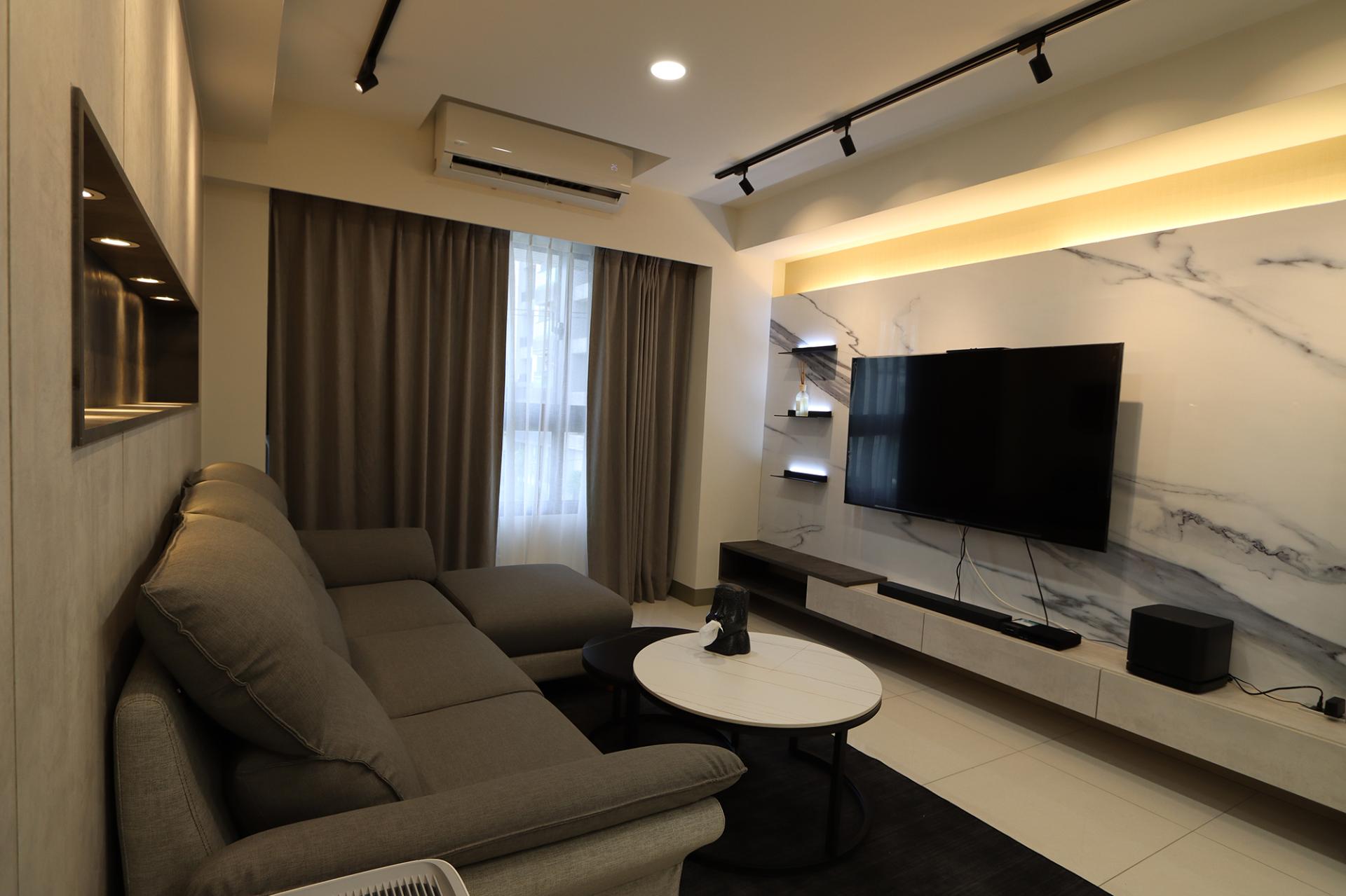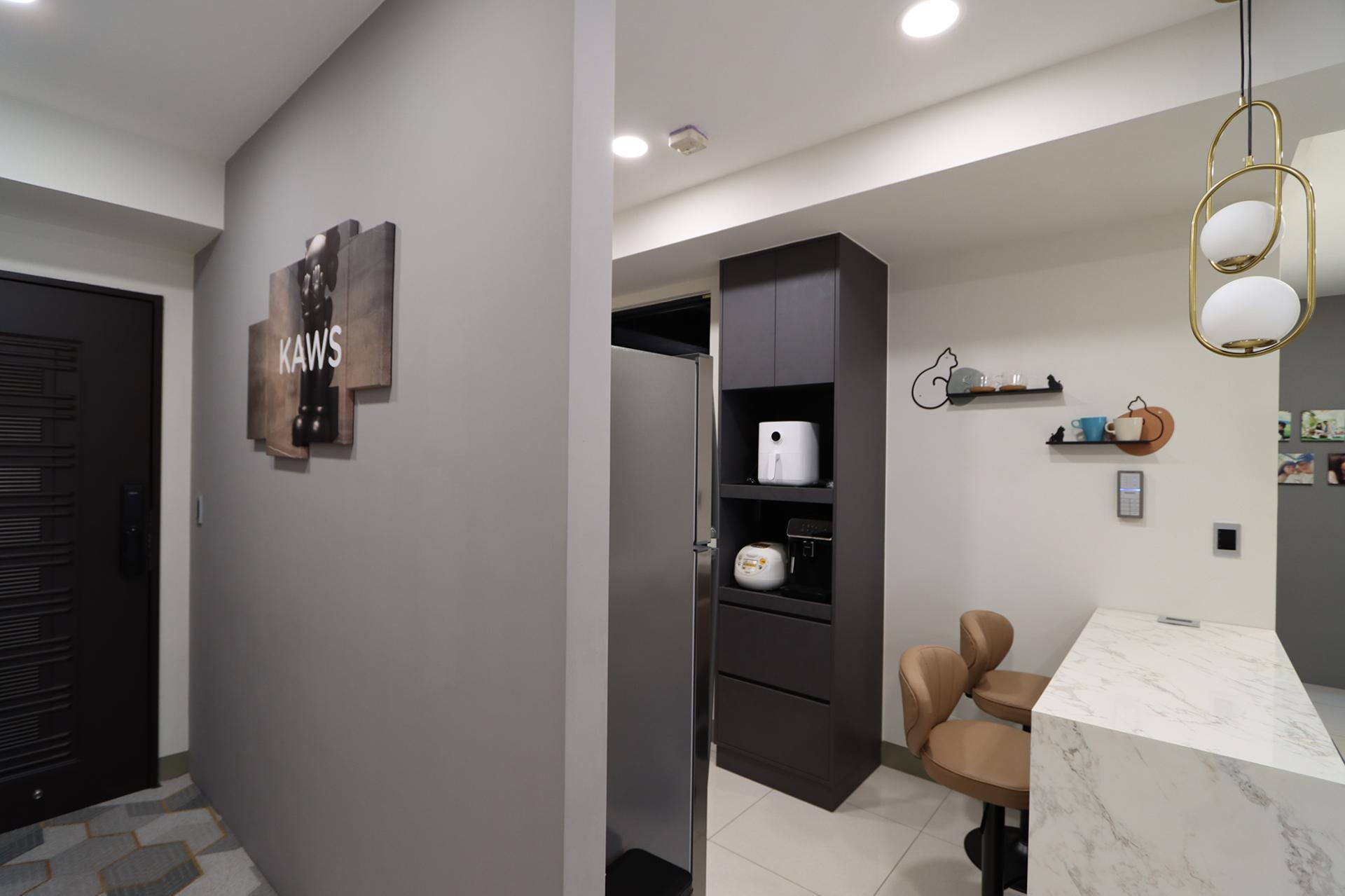 At the entryway, one will immediately be greeted by the designer’s exquisite integration of built-in cabinets, which not only offers generous storage solutions but also enhances the sense of spaciousness. This thoughtful design helps to avoid the often-cramped feeling associated with many interiors. Transitioning into the shared living space, one will soon discover a remarkably spacious living room that serves as the heart of the home. On the other hand, large glass windows flood the space with natural light, allowing air and light to circulate freely, creating an inviting atmosphere.