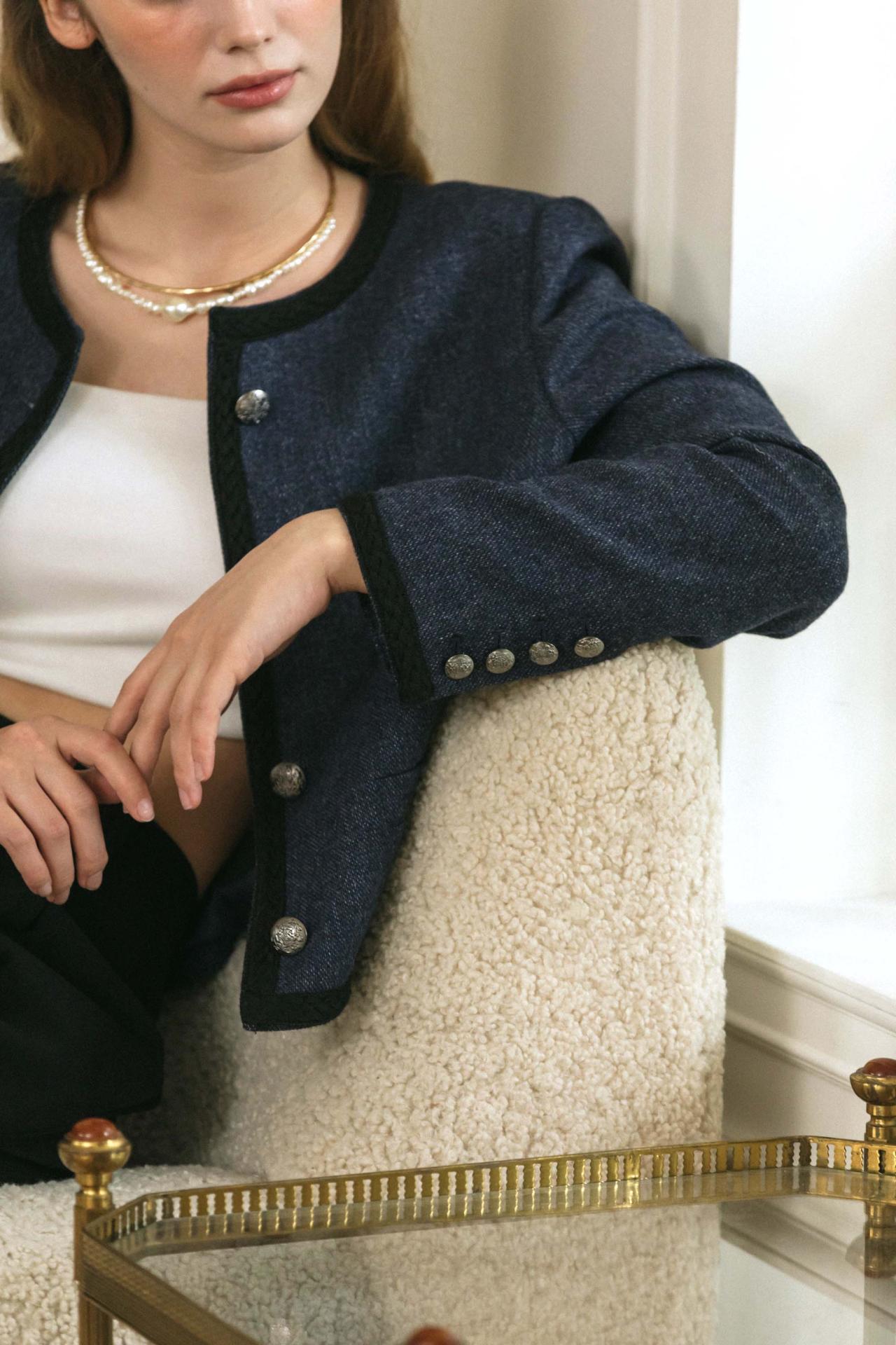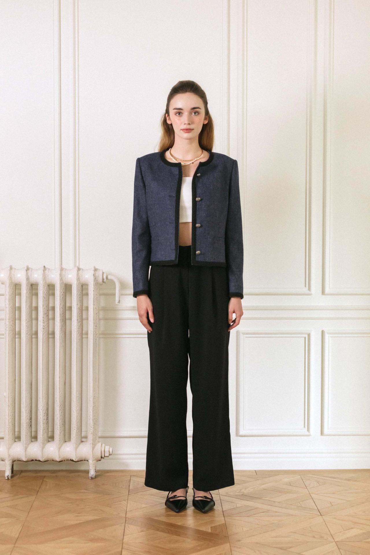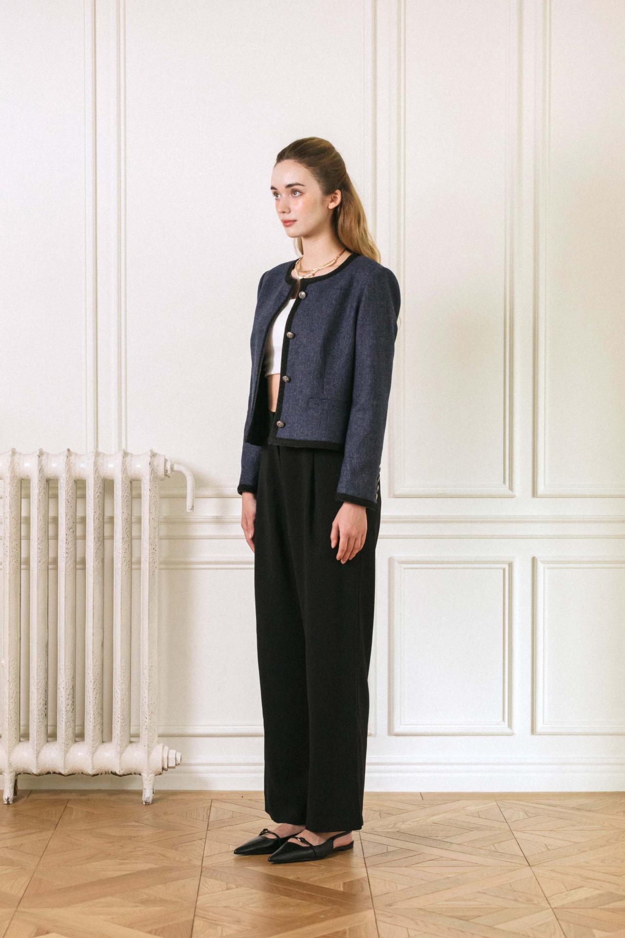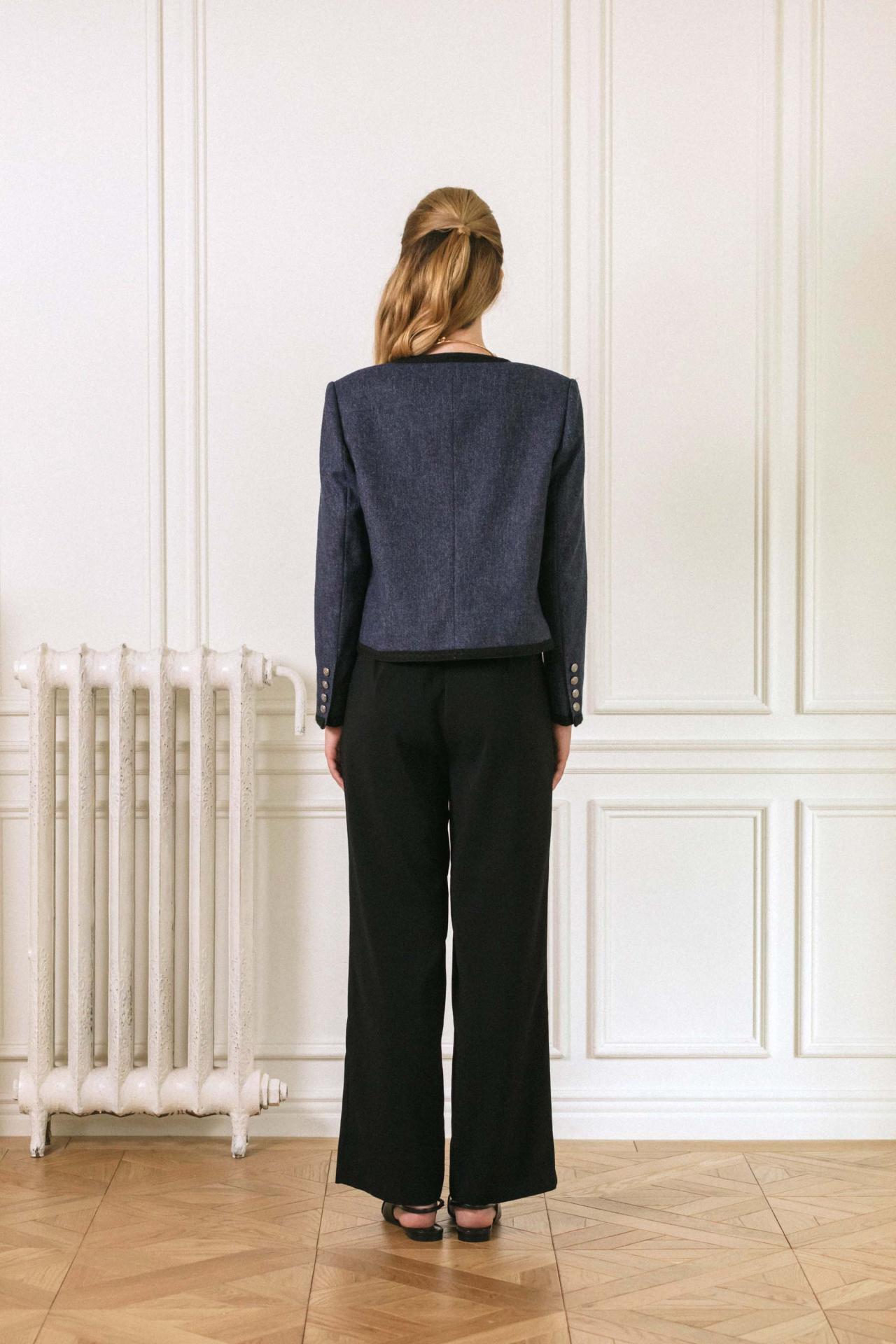 Functionally designed for transitional weather, the jacket uses a fully lined interior for insulation without bulk and is secured with subtly integrated recycled button closures. The cropped body and strong neckline create a harmonious silhouette that complements both professional and casual wardrobes, offering stylistic versatility with an architectural edge.