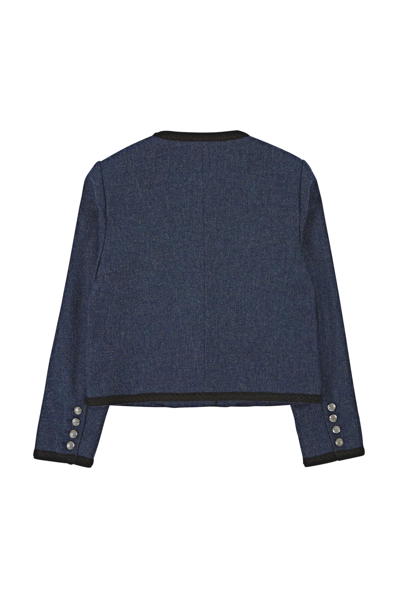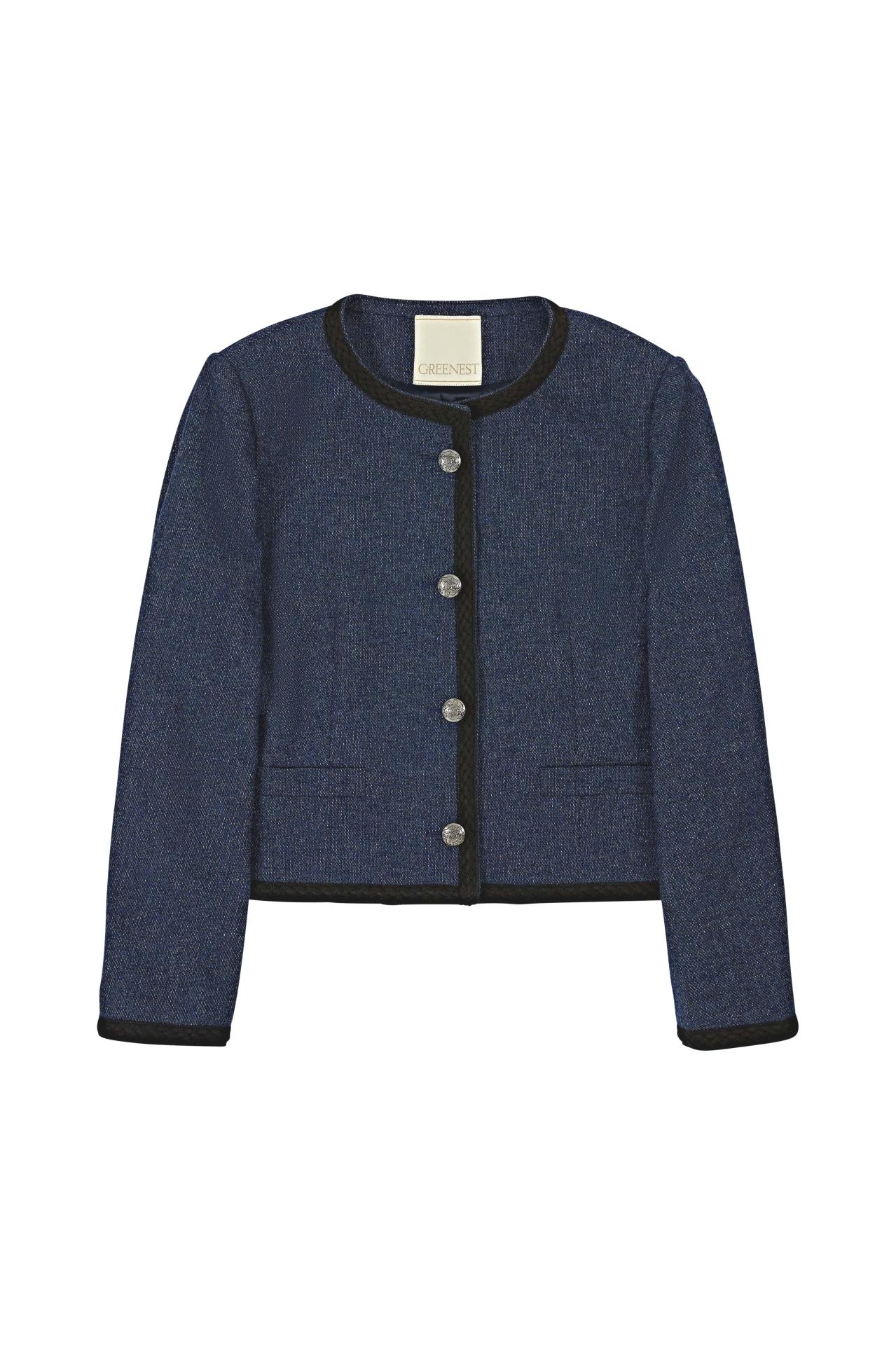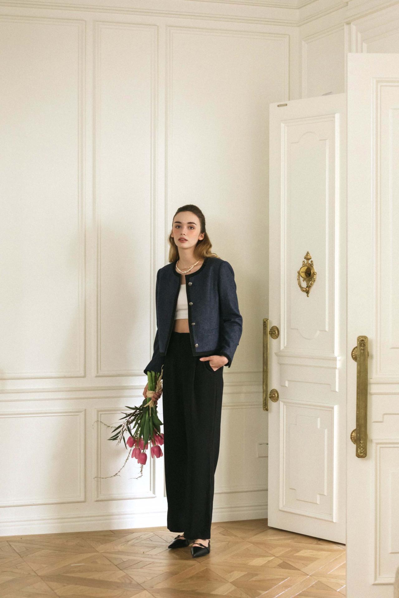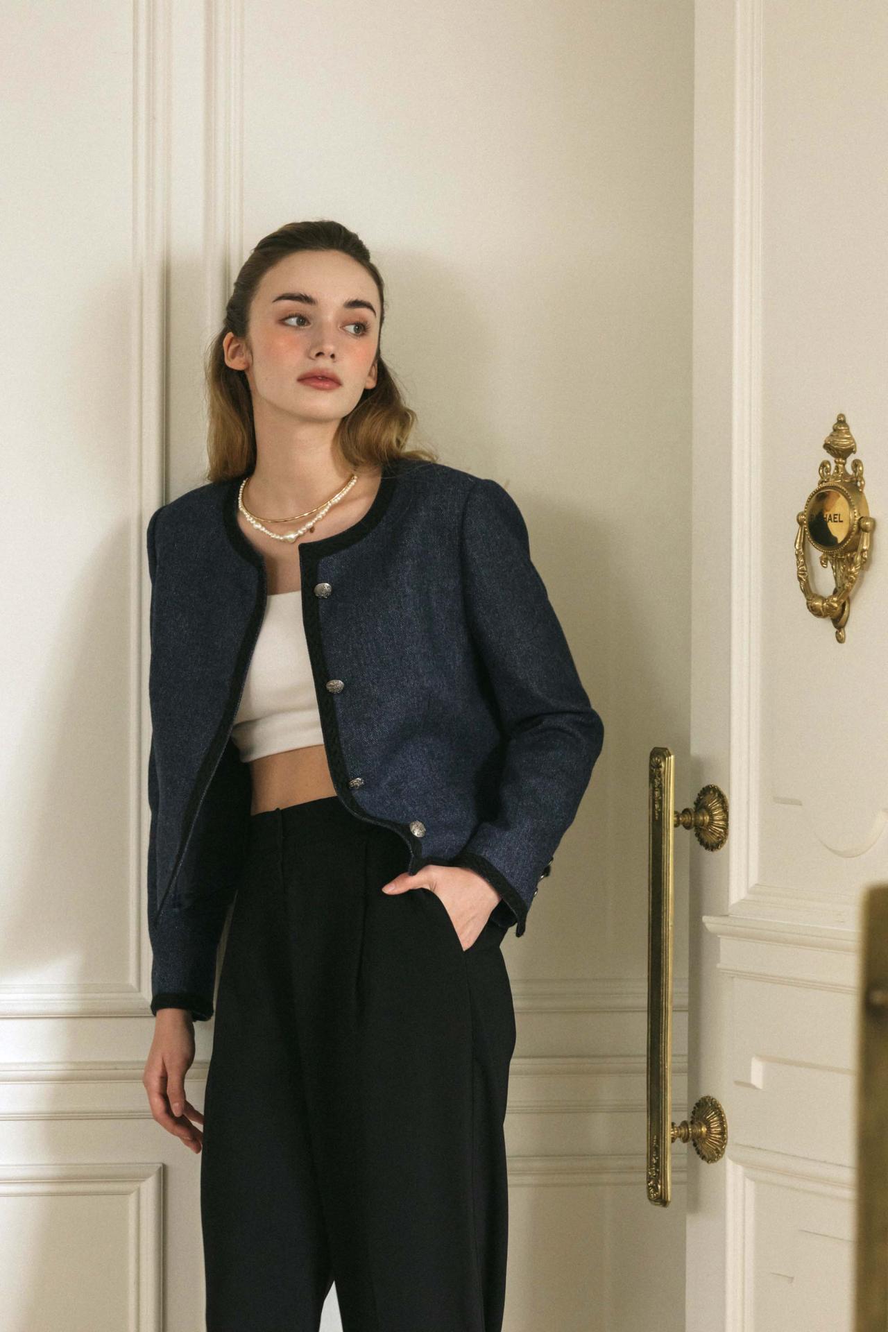 Functionally designed for transitional weather, the jacket uses a fully lined interior for insulation without bulk and is secured with subtly integrated recycled button closures. The cropped body and strong neckline create a harmonious silhouette that complements both professional and casual wardrobes, offering stylistic versatility with an architectural edge.