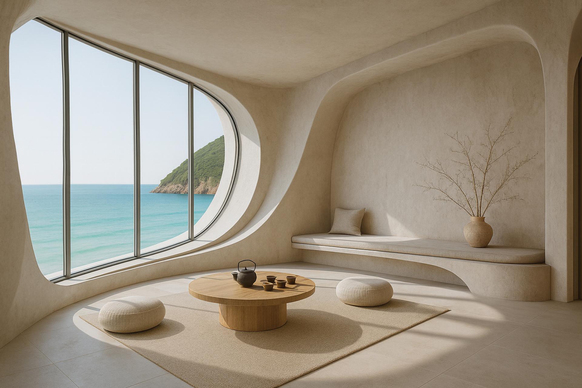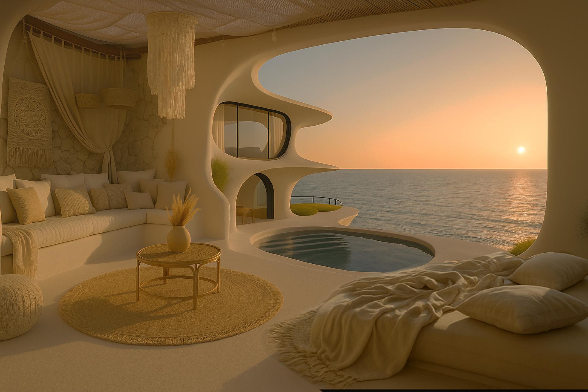 Golden Hour Retreat envisions a serene interface between natural coastal landscapes and human comfort. The project seeks to evoke emotional tranquility and sensual immersion through the integration of soft spatial geometries, organic material textures, and curated environmental elements.