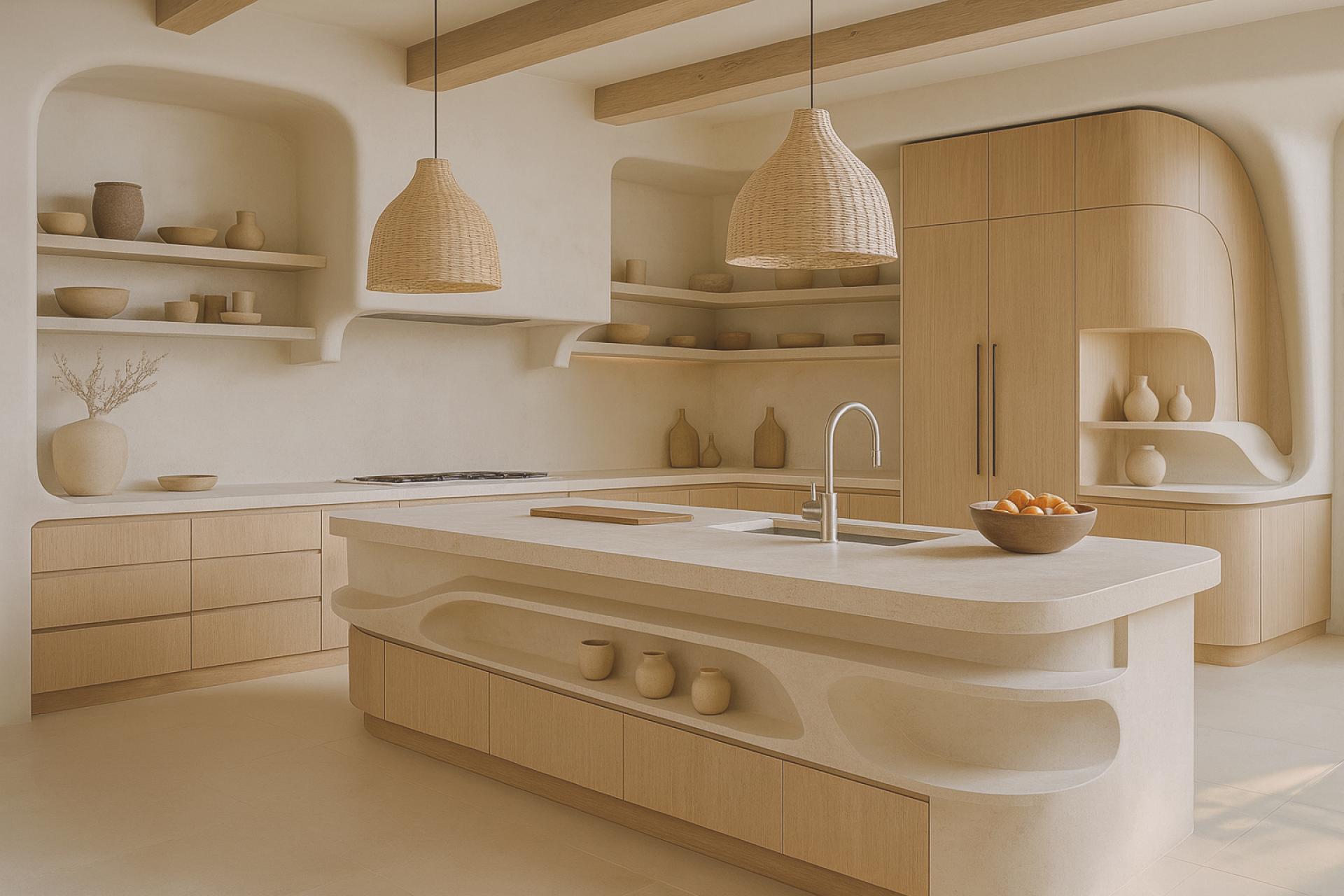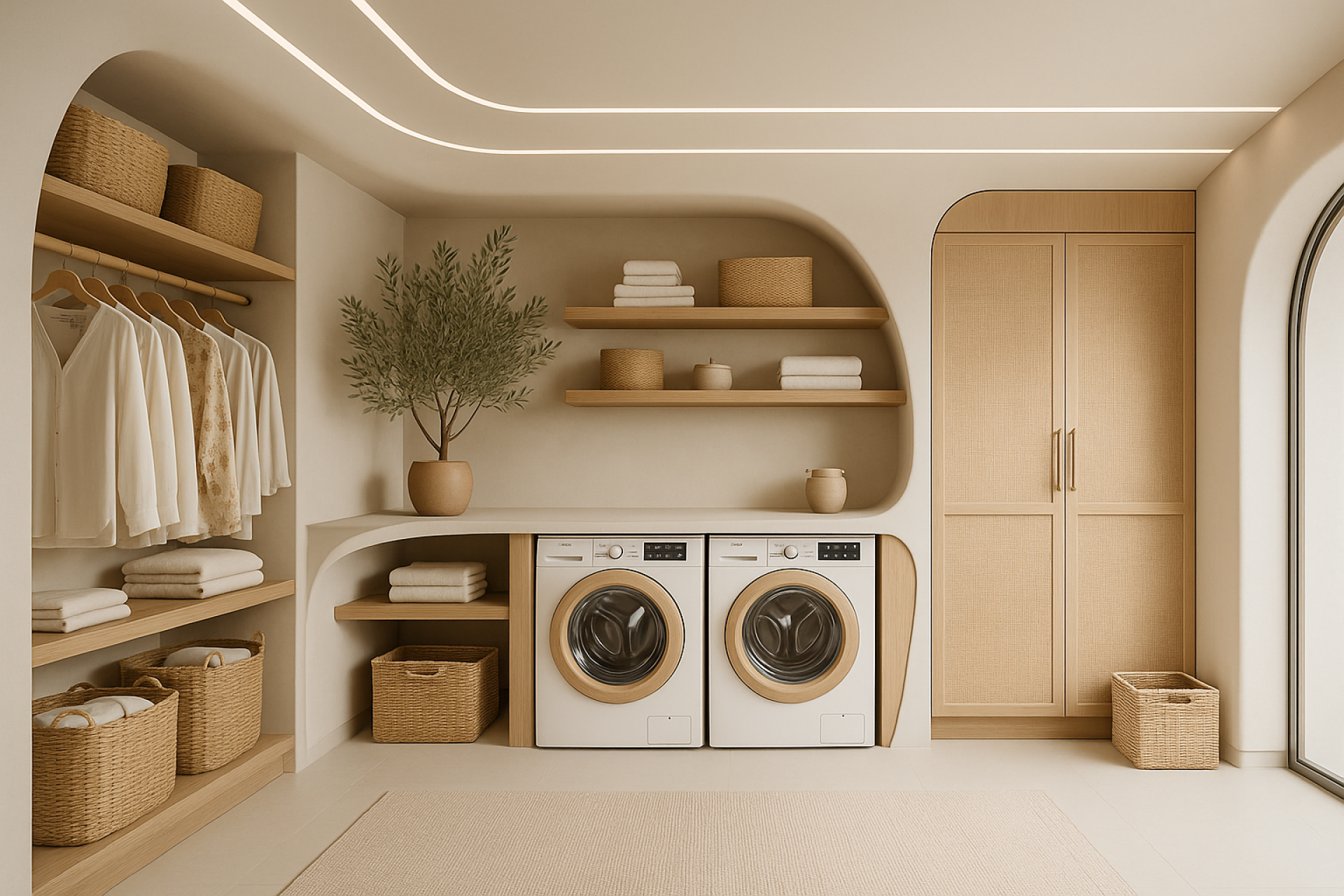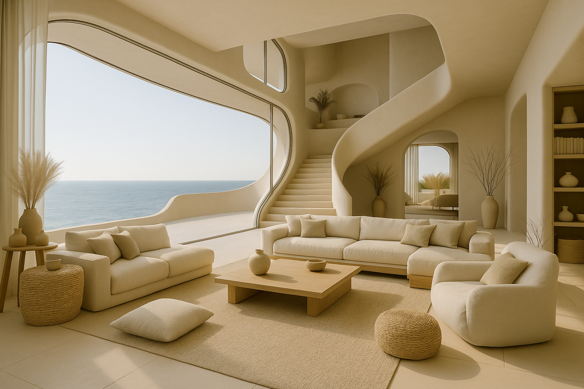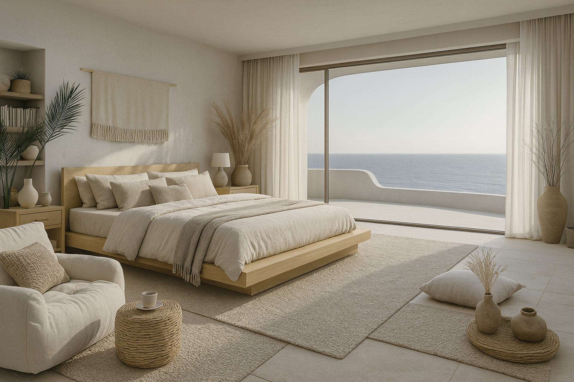 Sweeping white plaster surfaces soften the structure’s presence while woven textures, wooden elements, and natural textiles cultivate a sense of warmth. Flowing curtains, integrated seating, and loose fabric arrangements create a layered, tactile environment that feels both relaxed and refined.