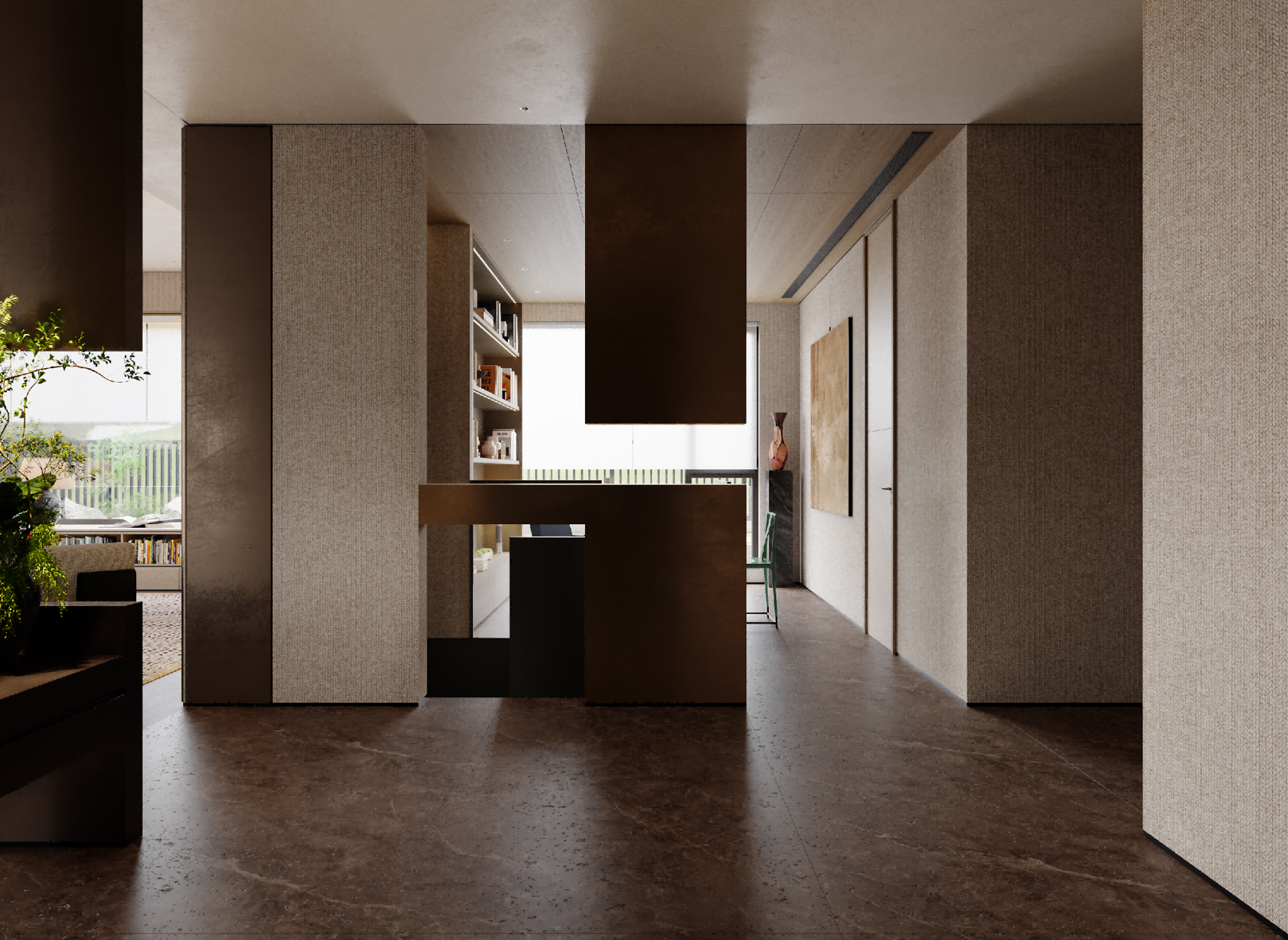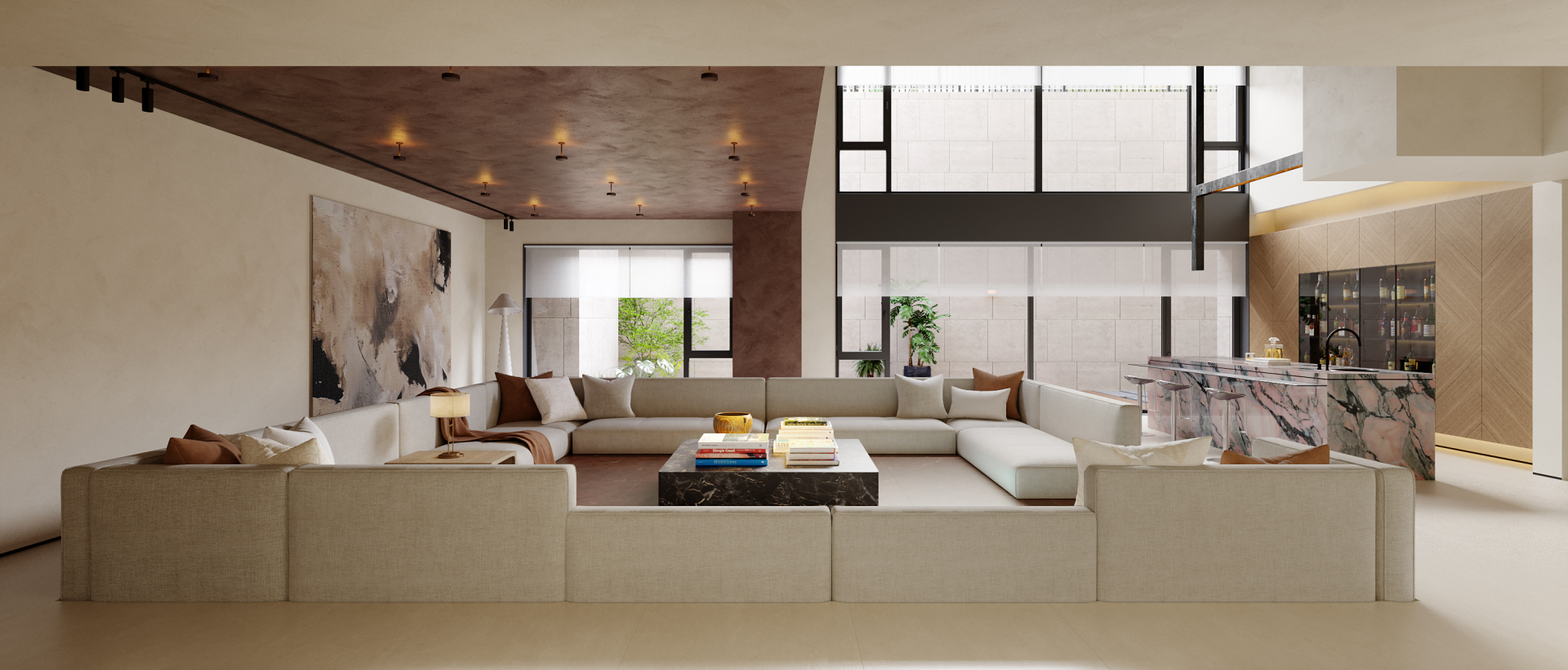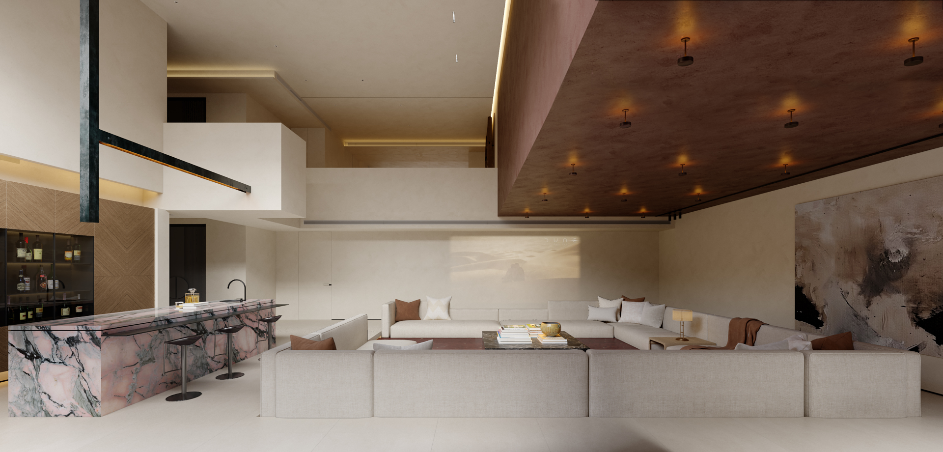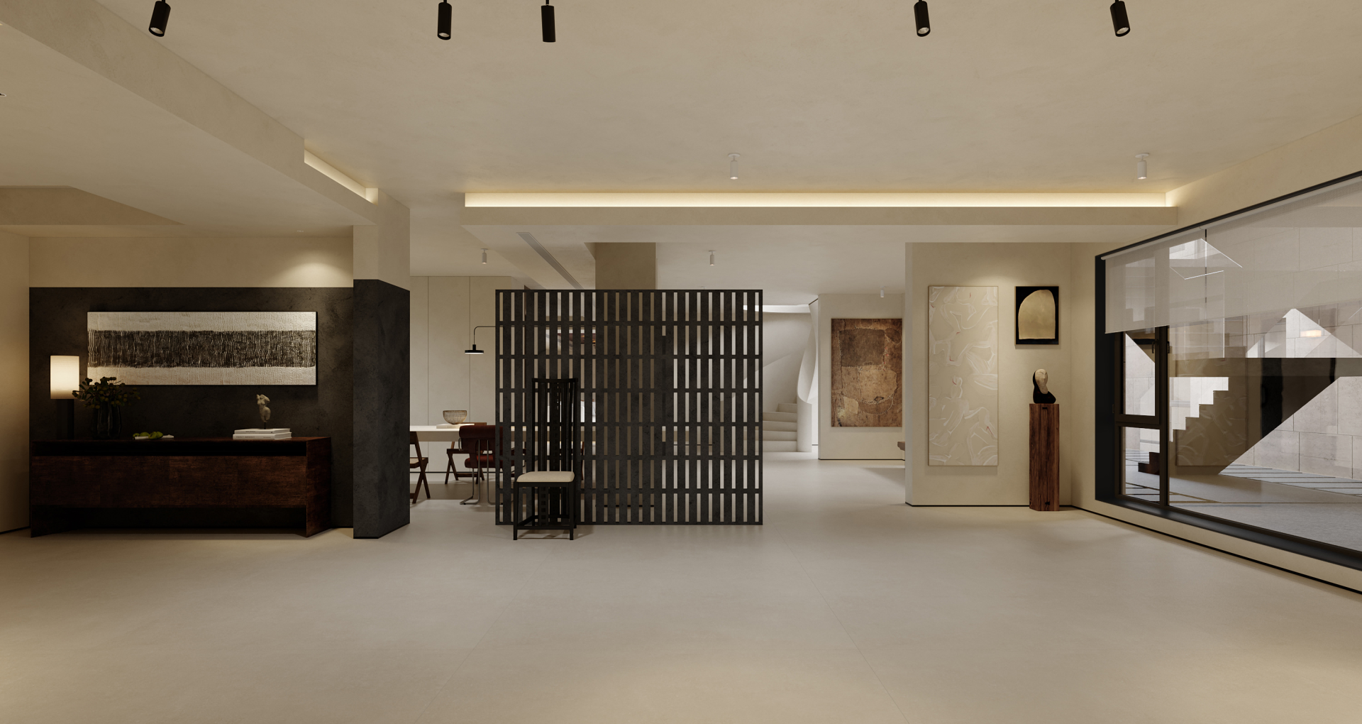 It is centered on a sunken courtyard as the pivotal hub, the layout employs “gray spaces” to connect public and private zones. Open areas feature large-span composite designs, where material zoning maintains visual continuity; private quarters utilize oak-clad walls and sheer curtains to soften boundaries, balancing tranquility with permeability. A commitment to authenticity guides the material strategy: textured plaster contrasts with natural stone, while wooden elements bridge nature and culture. Earth tones form the base, punctuated by burgundy red and matte black accents, with value gradations sculpting emotional depth. Natural and artificial lighting are orchestrated. Daylight floods vertically through skylights and diffuses via the sunken courtyard’s reflective surfaces; after dark, a layered system (recessed strips, spotlights, track lights) balances functionality and ambiance, blurring day-night divisions. Spiral staircases and marble bars transform leisure into artistic social hubs, while installations and paintings intensifies spatial storytelling.
