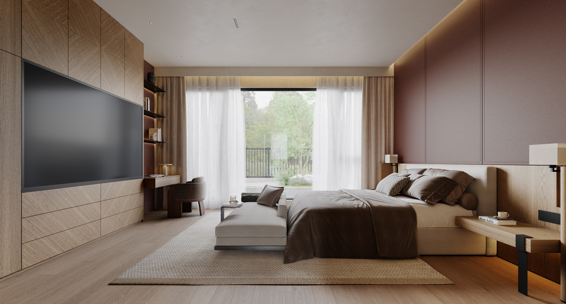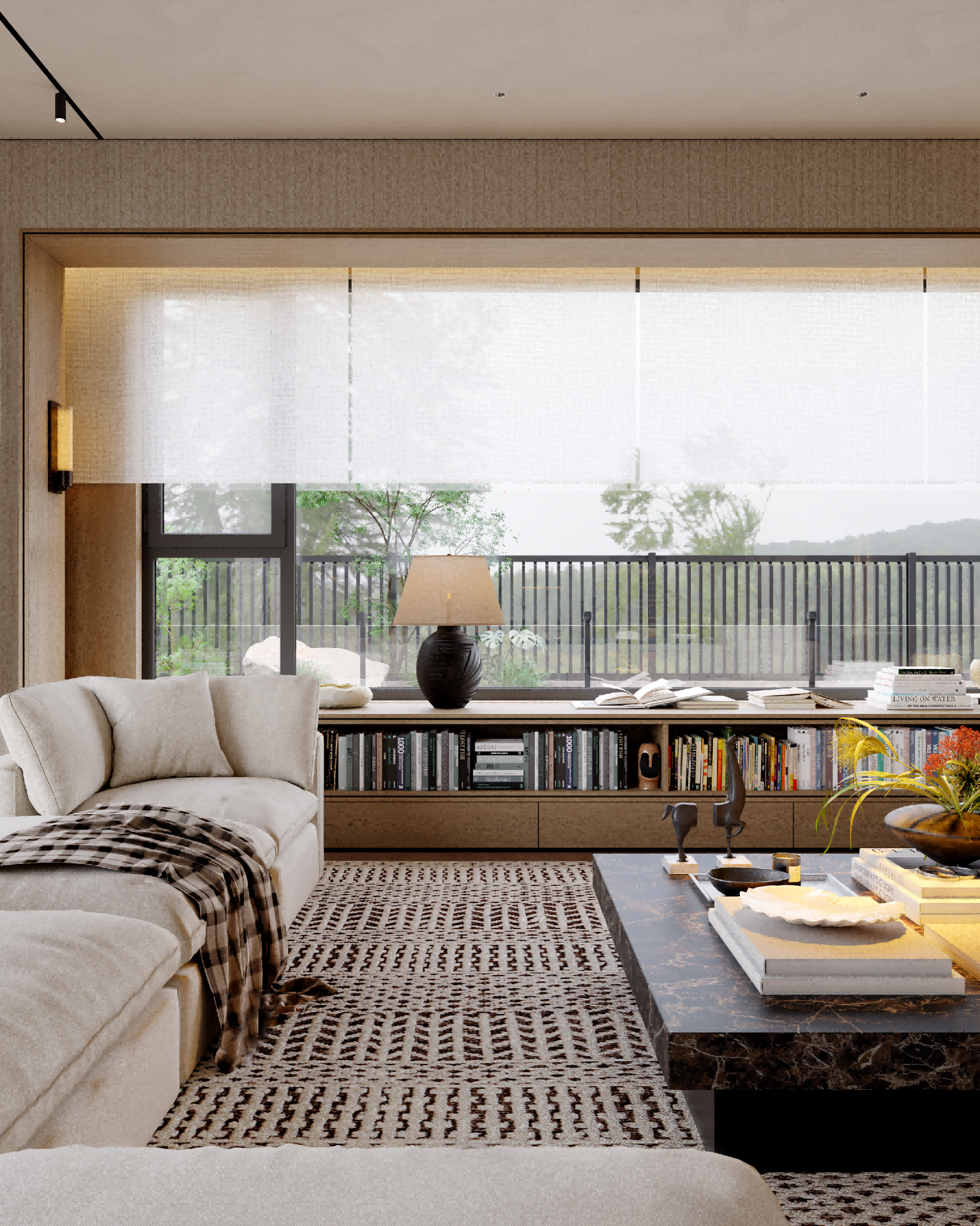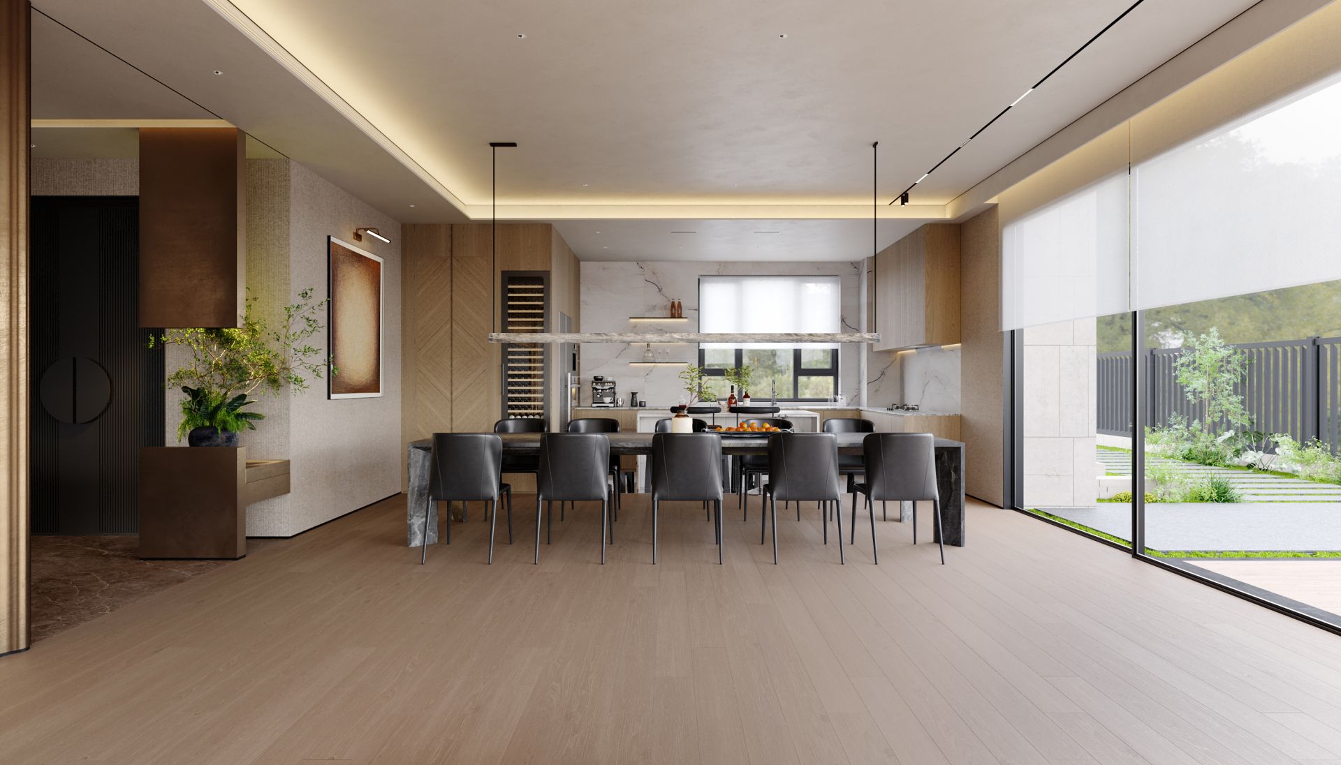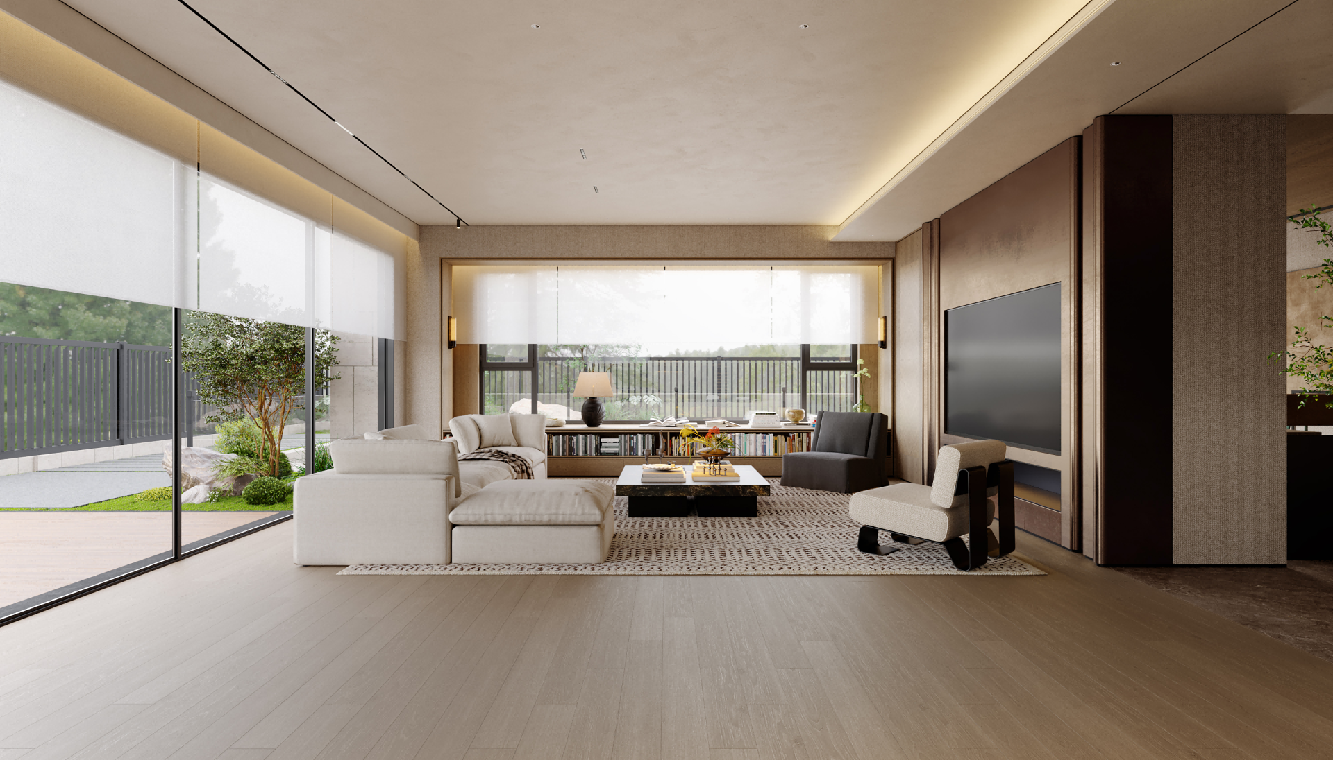 It is centered on a sunken courtyard as the pivotal hub, the layout employs “gray spaces” to connect public and private zones. Open areas feature large-span composite designs, where material zoning maintains visual continuity; private quarters utilize oak-clad walls and sheer curtains to soften boundaries, balancing tranquility with permeability. A commitment to authenticity guides the material strategy: textured plaster contrasts with natural stone, while wooden elements bridge nature and culture. Earth tones form the base, punctuated by burgundy red and matte black accents, with value gradations sculpting emotional depth. Natural and artificial lighting are orchestrated. Daylight floods vertically through skylights and diffuses via the sunken courtyard’s reflective surfaces; after dark, a layered system (recessed strips, spotlights, track lights) balances functionality and ambiance, blurring day-night divisions. Spiral staircases and marble bars transform leisure into artistic social hubs, while installations and paintings intensifies spatial storytelling.
