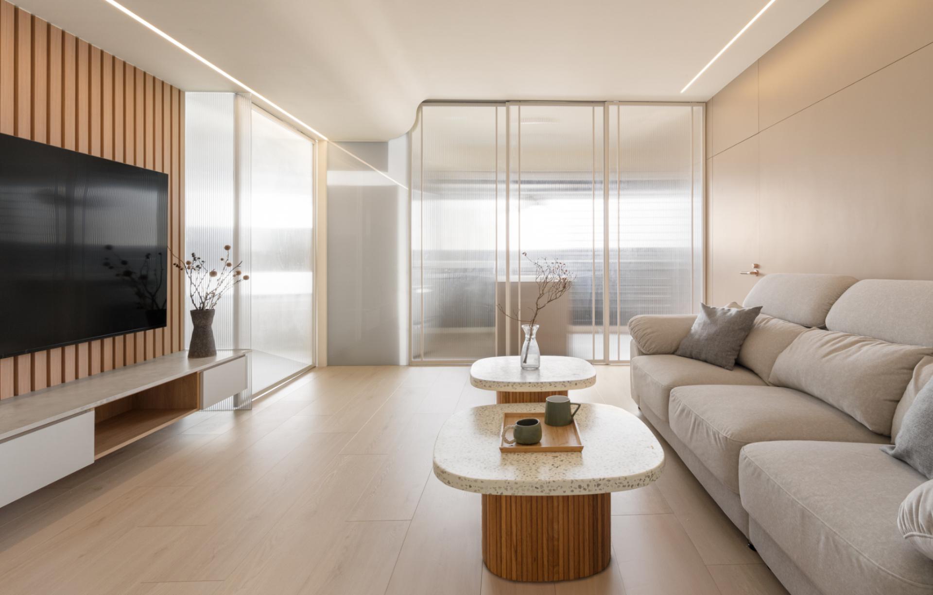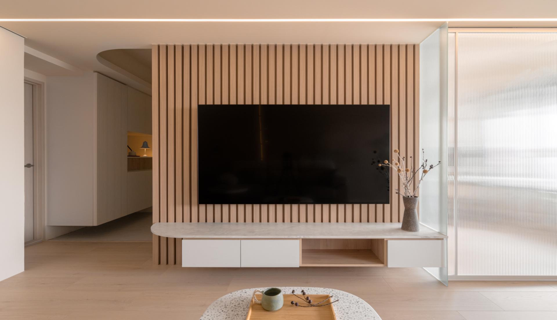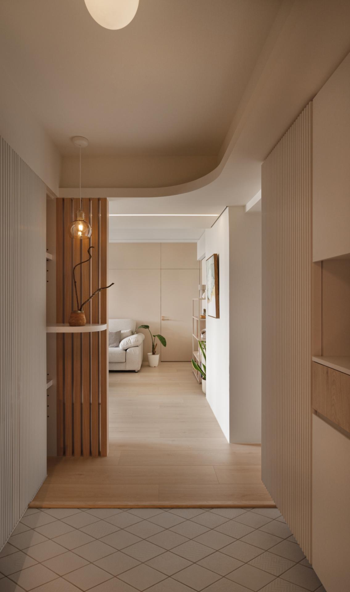 The intervention responds directly to the shifting atmosphere of the skyline, allowing the interior to mirror the natural light and rhythm of the high-altitude horizon through a warm, neutral palette. The vertical linear language of the wooden grilles establishes a rhythmic order that guides the eye, while the strategic placement of crackle-glazed ceramic vessels bearing the creator’s fingerprints dissolves the generic coldness of standardized housing. These handcrafted artifacts, with their unique patina, establish a resonance with the panoramic urban landscape, transforming a residential unit into a grounded sanctuary of quietude. By ritualizing the intersection of materiality and memory, the dwelling filters out urban noise, creating an interface where light and shadow support the emotional growth of a family. This narrative approach goes beyond mere style, offering a physical manifestation of a spiritual journey and the enduring strength required to cultivate a home in the sky.
