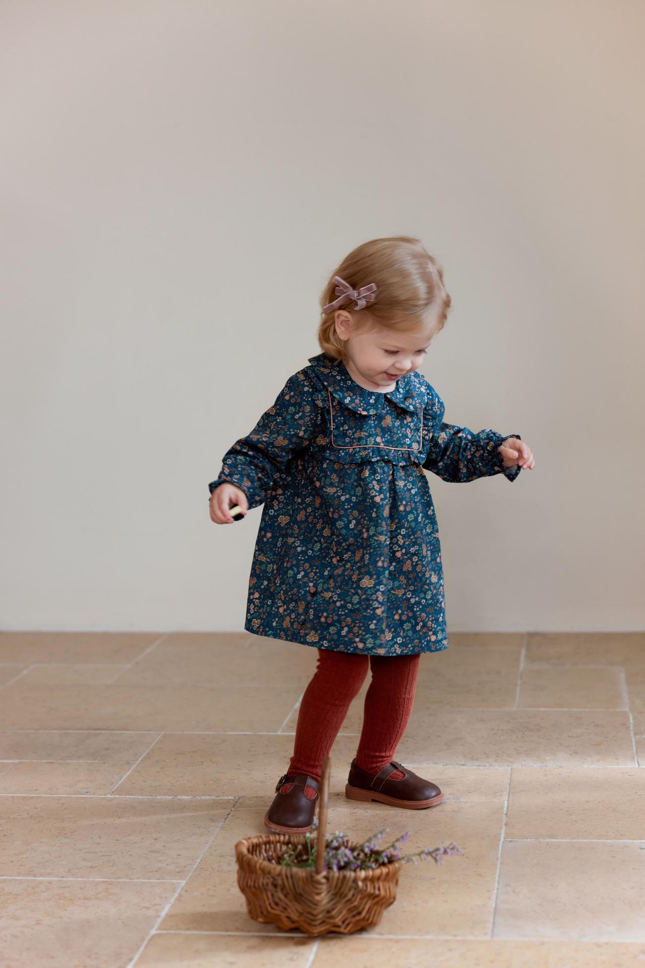 Drawing inspiration from the serene landscapes of southern France, where nature and architecture coexist in harmony, the designer reimagines stone wall lines, plant shapes, and patterns of light and shadow into dress silhouettes, relaxed fit, and soothing tones, giving it a sense of ease and elegance. Drawing on classical art, the folds seen in ancient Greek sculpture are incorporated into the pinafore dress, giving it a three-dimensional shape that feels both lively and structured. The color palette draws from the muted hues of classical still-life paintings, with deep blue as the foundation, accented by floral motifs in warm brown, pink, and beige. This combination captures the gentle warmth of an oil painting, giving the clothing a fresh, pastoral romance that feels playful, refined, and elegantly vintage.