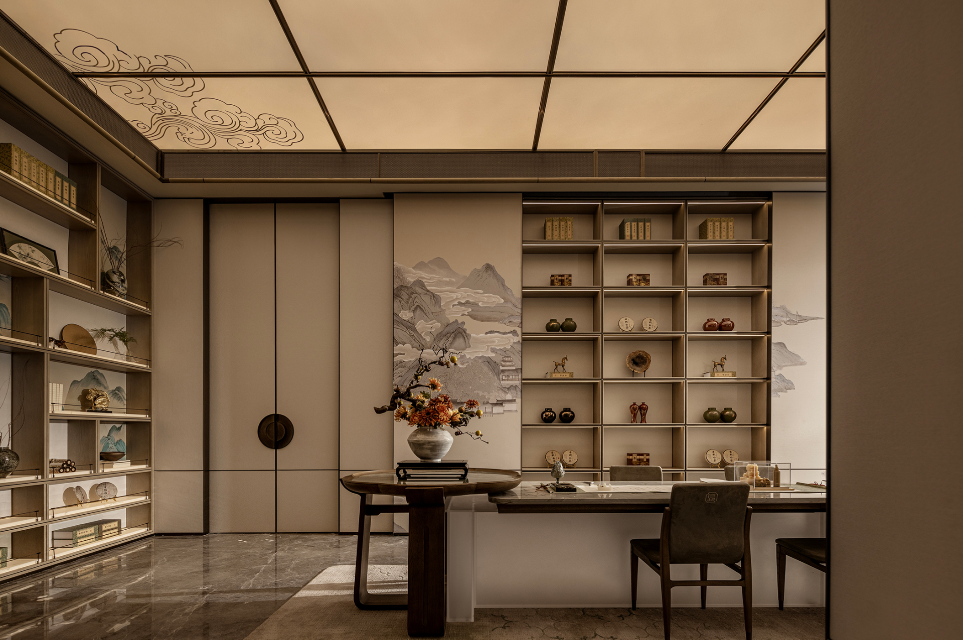 In the living room and tea area, a serene foundation is established through warm wood tones. The furniture, elegant and refined, is complemented by carefully curated natural greenery, crafting a tranquil setting ideal for tea appreciation, calligraphy, and painting. The gentle wood hue, soft as morning light, casts a serene glow over every detail, allowing the space to radiate an understated yet timeless character.