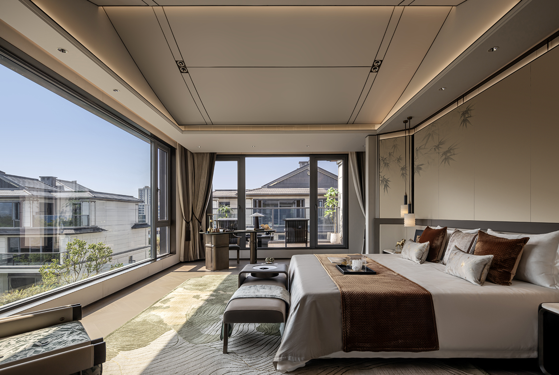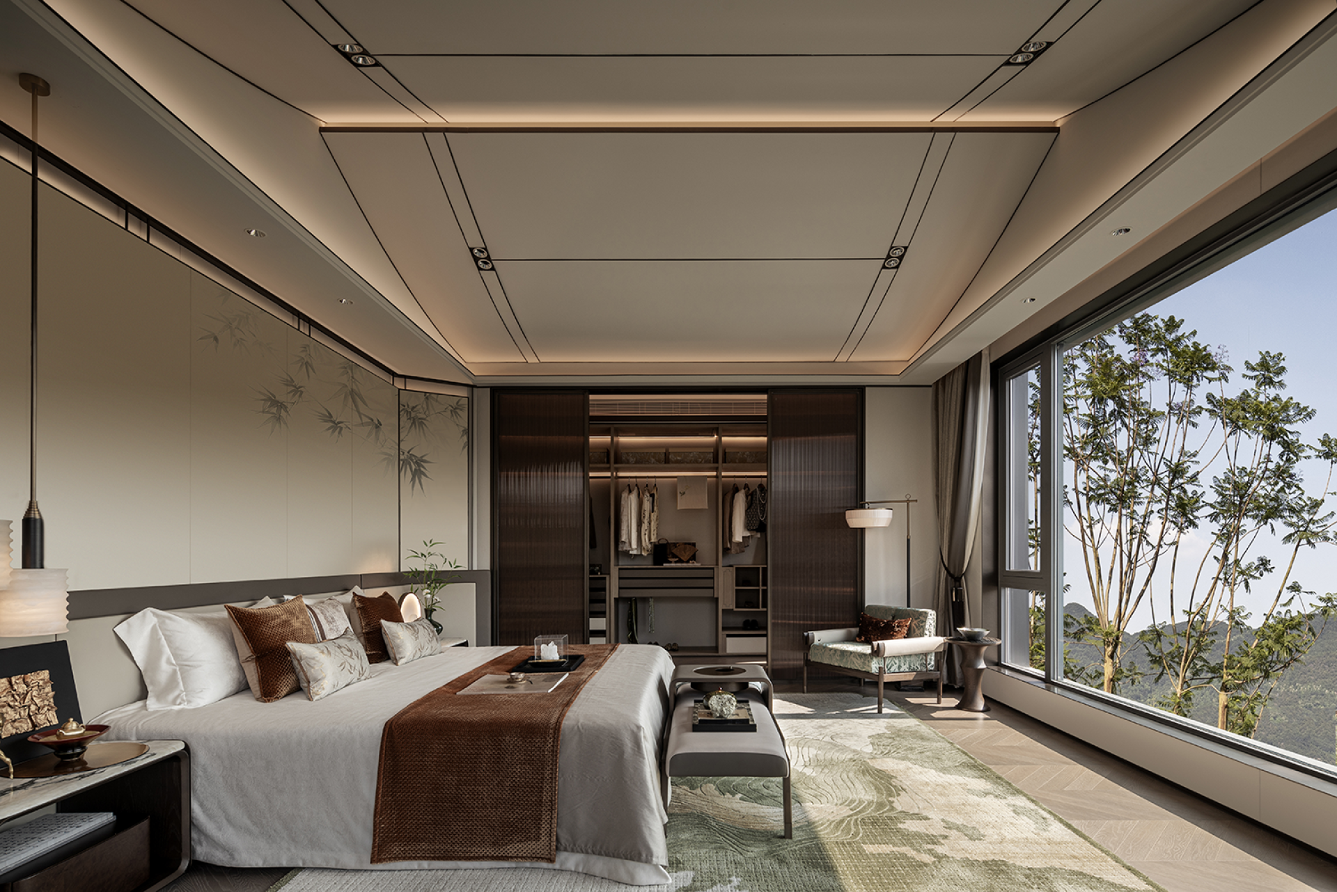 The master bedroom continues the tranquil theme, incorporating bamboo cultural elements and natural scenery to evoke a leisurely and peaceful Eastern ambiance. Here, residents feel as though they are nestled deep within a bamboo forest, finding relaxation for both body and mind.