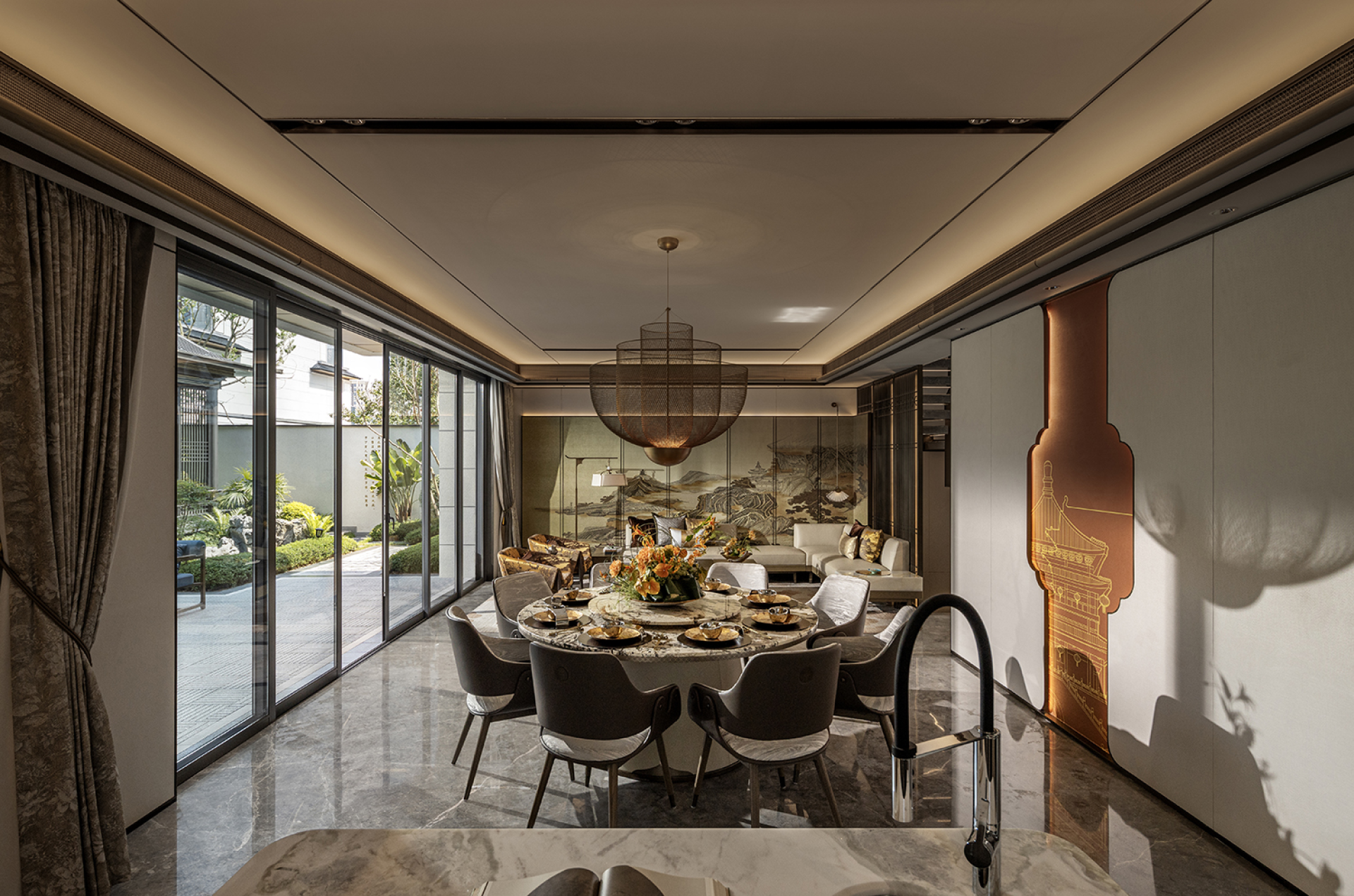 The overall space is grounded in warm tones, accented with amber yellow and Forbidden City red, exuding sophistication and warmth within a solemn yet elegant ambiance. Inspired by traditional Chinese lanterns, the pendant lights not only illuminate the space but also evoke a sense of belonging—"Among countless glowing lights, there is always one waiting for you."