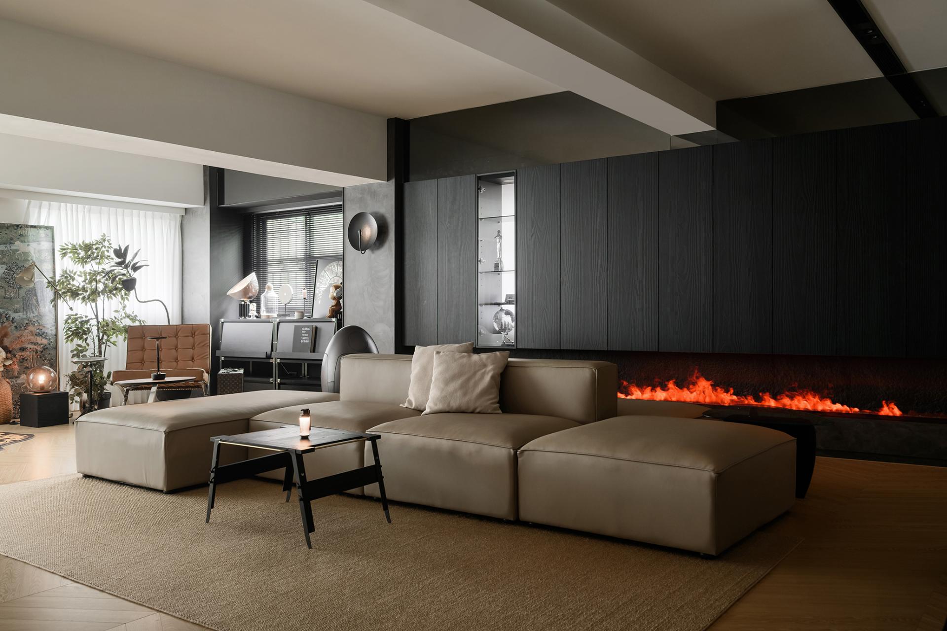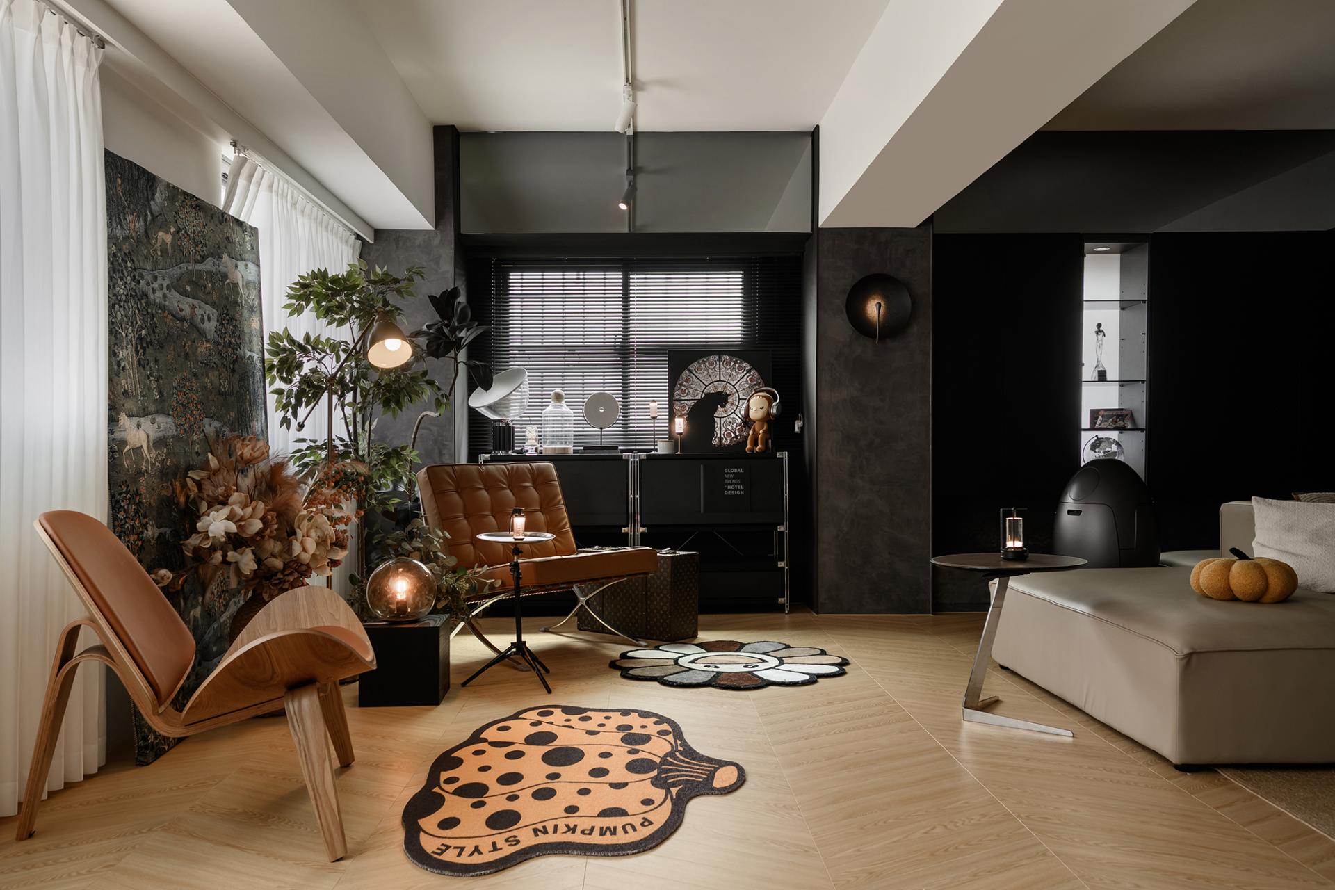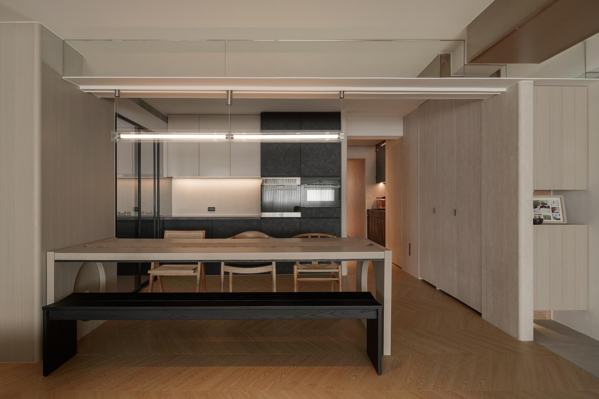 Given the limited ceiling height typical of older structures, mirrored finishes were applied to the living room cabinetry and beams to extend visual depth and alleviate the sense of compression. A dark color palette was employed to create visual balance and accentuate spatial layering, refining the long, narrow proportions of the living and dining areas. The former guest room was removed and converted into an open kitchen, subtly defined by cabinetry and glass sliding doors that merge the kitchen and dining zones into one fluid continuum. A linear pendant light beneath the beam both delineates function and visually lightens its presence. Beyond functional improvement, the design introduces light as a gentle thread that ties the family’s daily life together, transforming the interior into a tranquil, cohesive home filled with warmth, stability, and quiet reassurance.