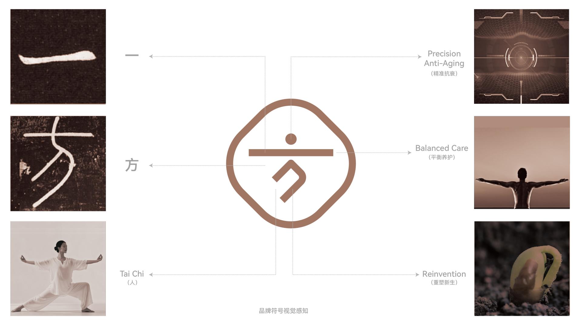 The brand symbol of Yifang Anti-Aging is rooted in the Chinese character “方”. It builds a modern visual system infused with Eastern wisdom. A rounded-diamond outer contour evokes the ancient cosmology of “round sky, square earth”. Inside, the character “方” is re-imagined as an open, stretching human figure, declaring a people-first philosophy. The dot above stands for a living cell; the balance scale below stands for precision science—together they spark a dialogue between “Dao” and “ technique”. This concise language conveys the brand’s unique promise: marrying TCM’s balance wisdom with Western precision technology. Simplicity carries depth; balance radiates vitality, injecting new humanistic and tech DNA into the traditional medical-aesthetics field. These elements form a flexible, extensible core gene that systematically delivers the value of “Eastern wisdom as Dao, Western science as technique.”