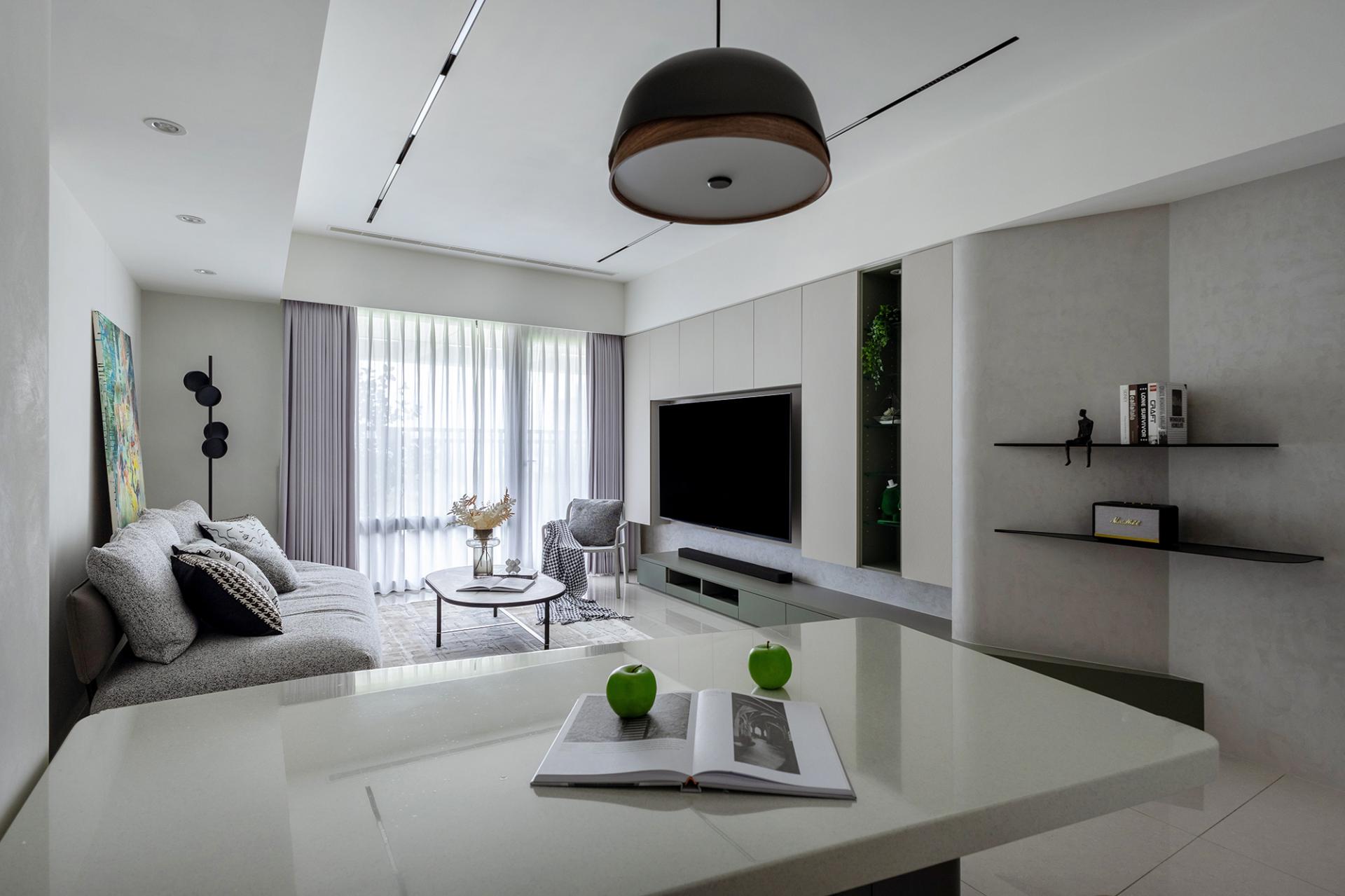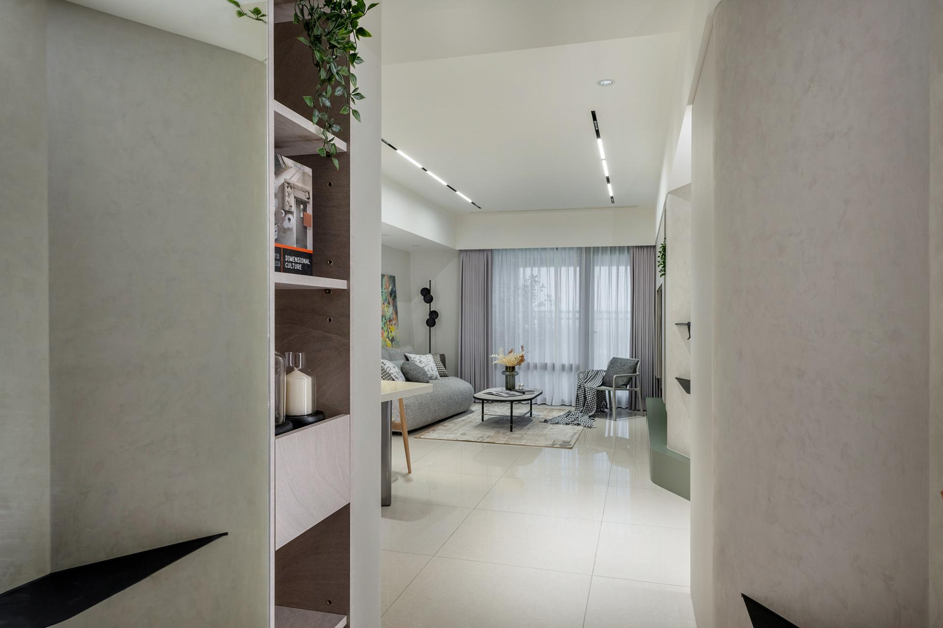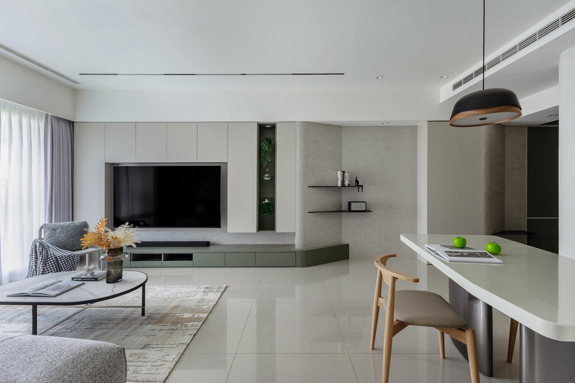 The entryway is elegantly defined by a striking floor-to-ceiling shoe cabinet. Its mirrored surfaces, complemented by soft green accents, evoke a serene and inviting atmosphere perfect for welcoming guests. Furthermore, linear light strips are thoughtfully integrated into the ceiling and walls, guiding both movement and light throughout the space. Transitioning into the open-plan public area, one will be met with light-colored polished floor tiles that not only enhance the aesthetic but also create a sense of spaciousness. The walls, adorned in a unique beige-gray paint, showcase the rustic beauty of hand-applied strokes, artfully reflecting the dynamic play of natural light as it shifts throughout the day. In the dining area, one’s attention will be drawn to a stunning rounded artificial stone table supported by sleek silver cylindrical legs. This piece serves as a captivating focal point, inviting shared meals and conversations. Meanwhile, the living room features a sophisticated TV wall, highlighted by a floating light-colored cabinet system resting on a gray-green base. Paired with plush fabric sofas and modern track lighting, this arrangement fosters a bright, comfortable corner that is ideal for relaxation and socialization.