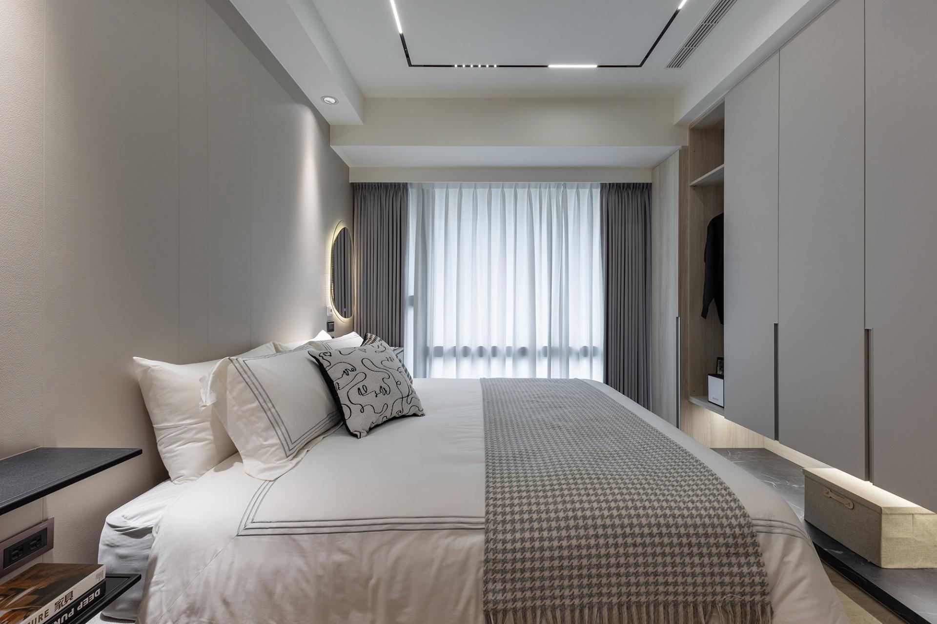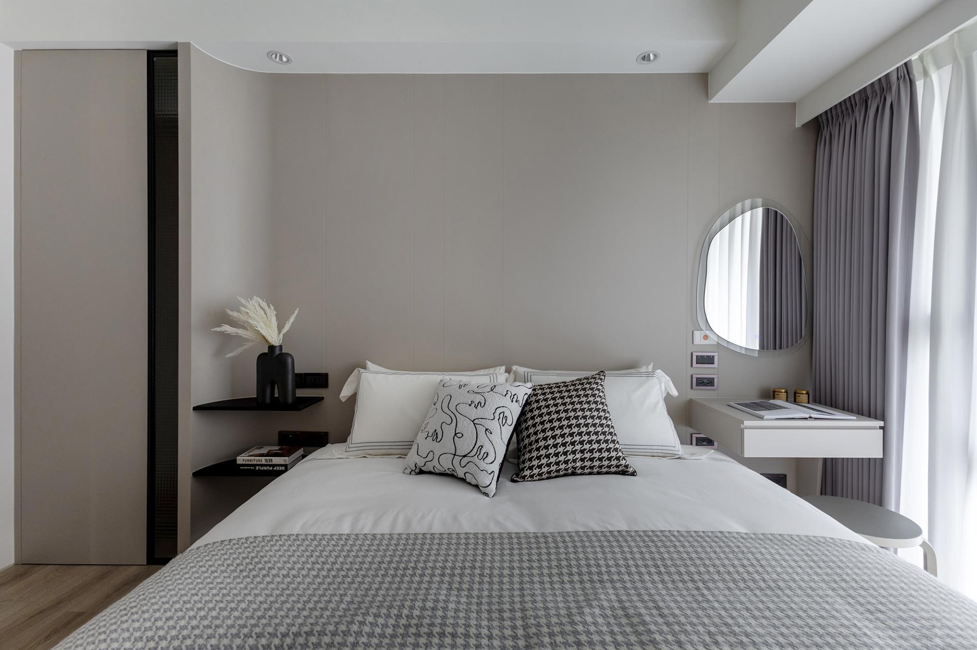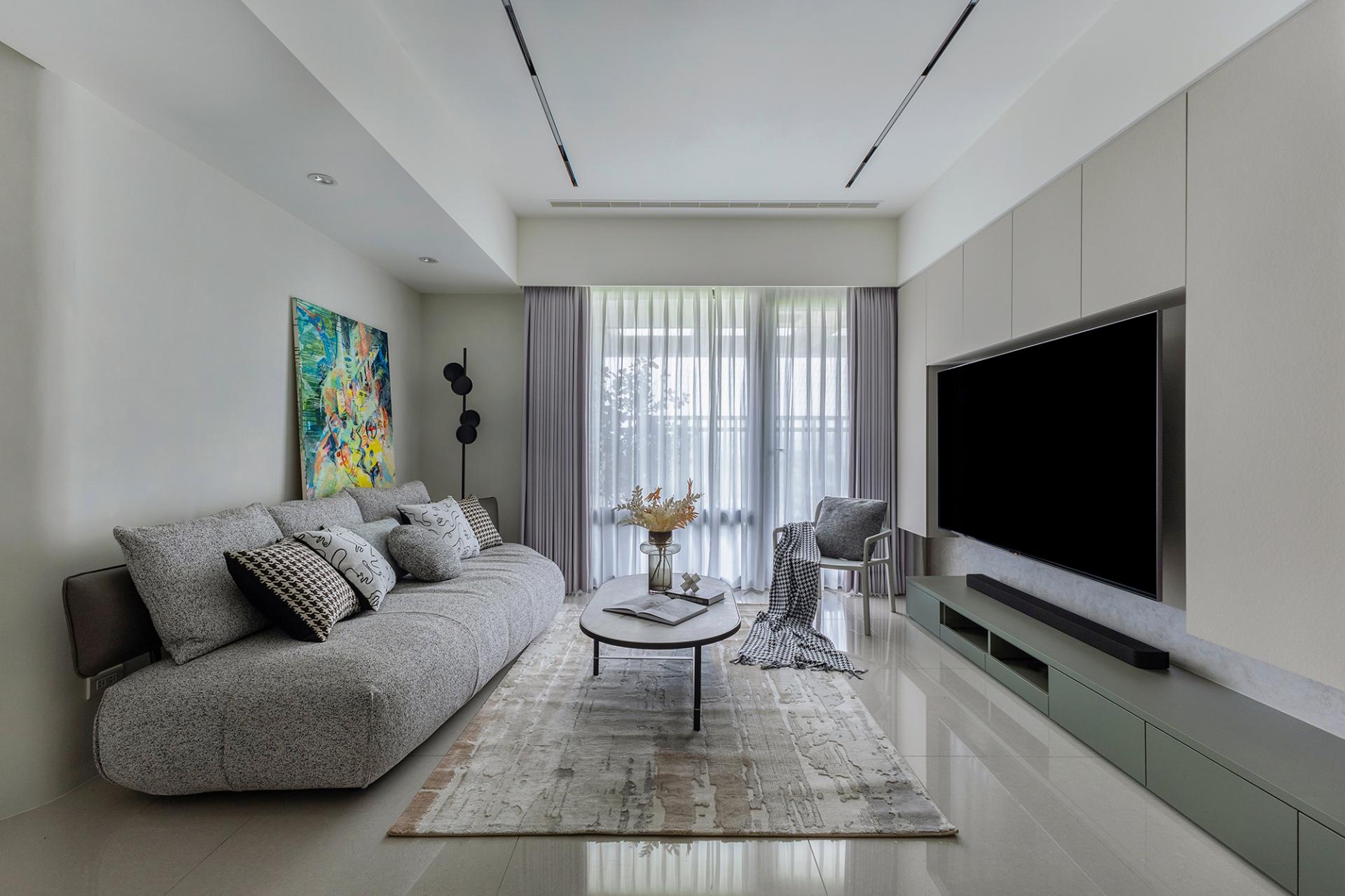 The entryway is elegantly defined by a striking floor-to-ceiling shoe cabinet. Its mirrored surfaces, complemented by soft green accents, evoke a serene and inviting atmosphere perfect for welcoming guests. Furthermore, linear light strips are thoughtfully integrated into the ceiling and walls, guiding both movement and light throughout the space. Transitioning into the open-plan public area, one will be met with light-colored polished floor tiles that not only enhance the aesthetic but also create a sense of spaciousness. The walls, adorned in a unique beige-gray paint, showcase the rustic beauty of hand-applied strokes, artfully reflecting the dynamic play of natural light as it shifts throughout the day. In the dining area, one’s attention will be drawn to a stunning rounded artificial stone table supported by sleek silver cylindrical legs. This piece serves as a captivating focal point, inviting shared meals and conversations. Meanwhile, the living room features a sophisticated TV wall, highlighted by a floating light-colored cabinet system resting on a gray-green base. Paired with plush fabric sofas and modern track lighting, this arrangement fosters a bright, comfortable corner that is ideal for relaxation and socialization.