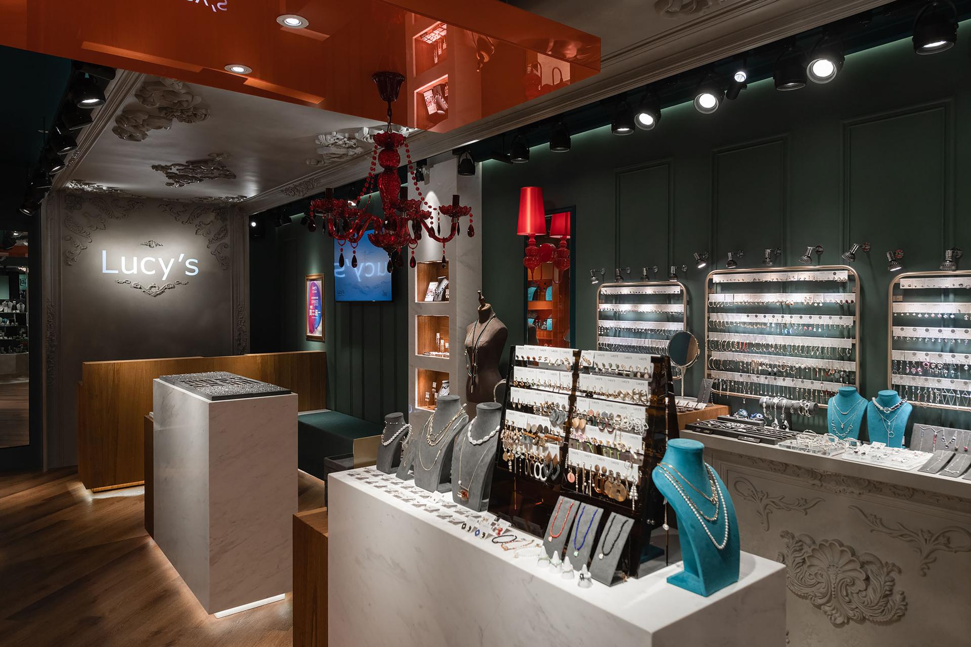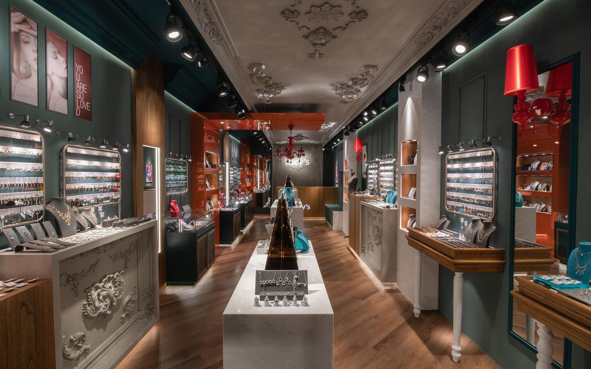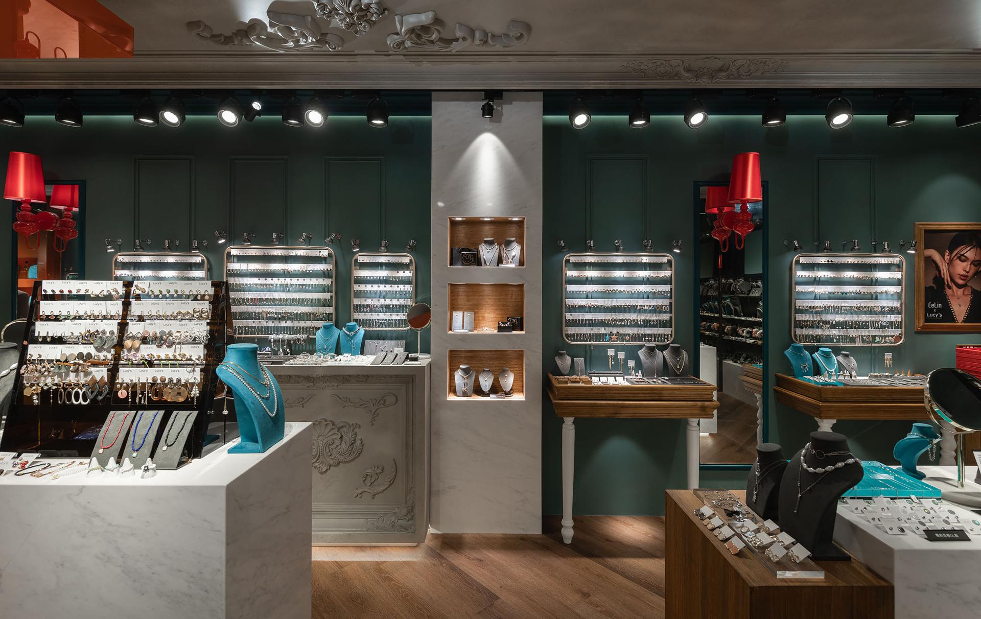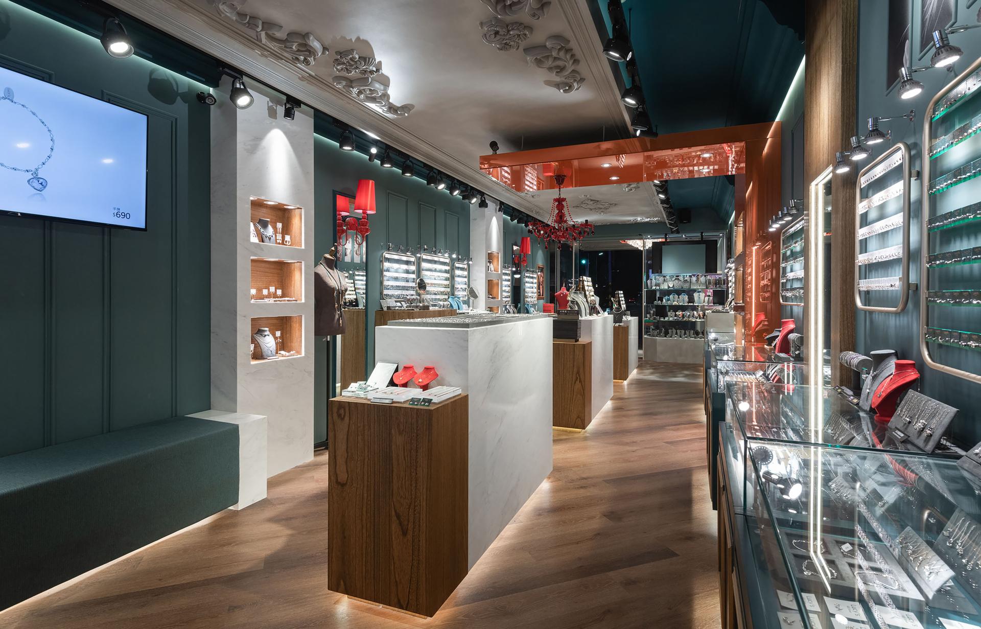 Anchored by a base palette of deep cyan and misty gray, the space presents a composed, boutique-style atmosphere, subtly embellished with vibrant accents of warm orange-red. This decisive color strategy precisely meets visual impact and long-term appeal. Ornamental moldings on the walls and ceiling, paired with crystal chandeliers, function like theatrical scenery. Along with focused track lighting, they create dedicated zones of illumination where each metal, gemstone, or crystal accessory reveals its most brilliant refractions. Matte wood veneer, marble countertops, and high-gloss lacquered cabinetry in the display areas further enhance the interplay of material textures, expressing the brand’s understated yet elegant character through refined detail.