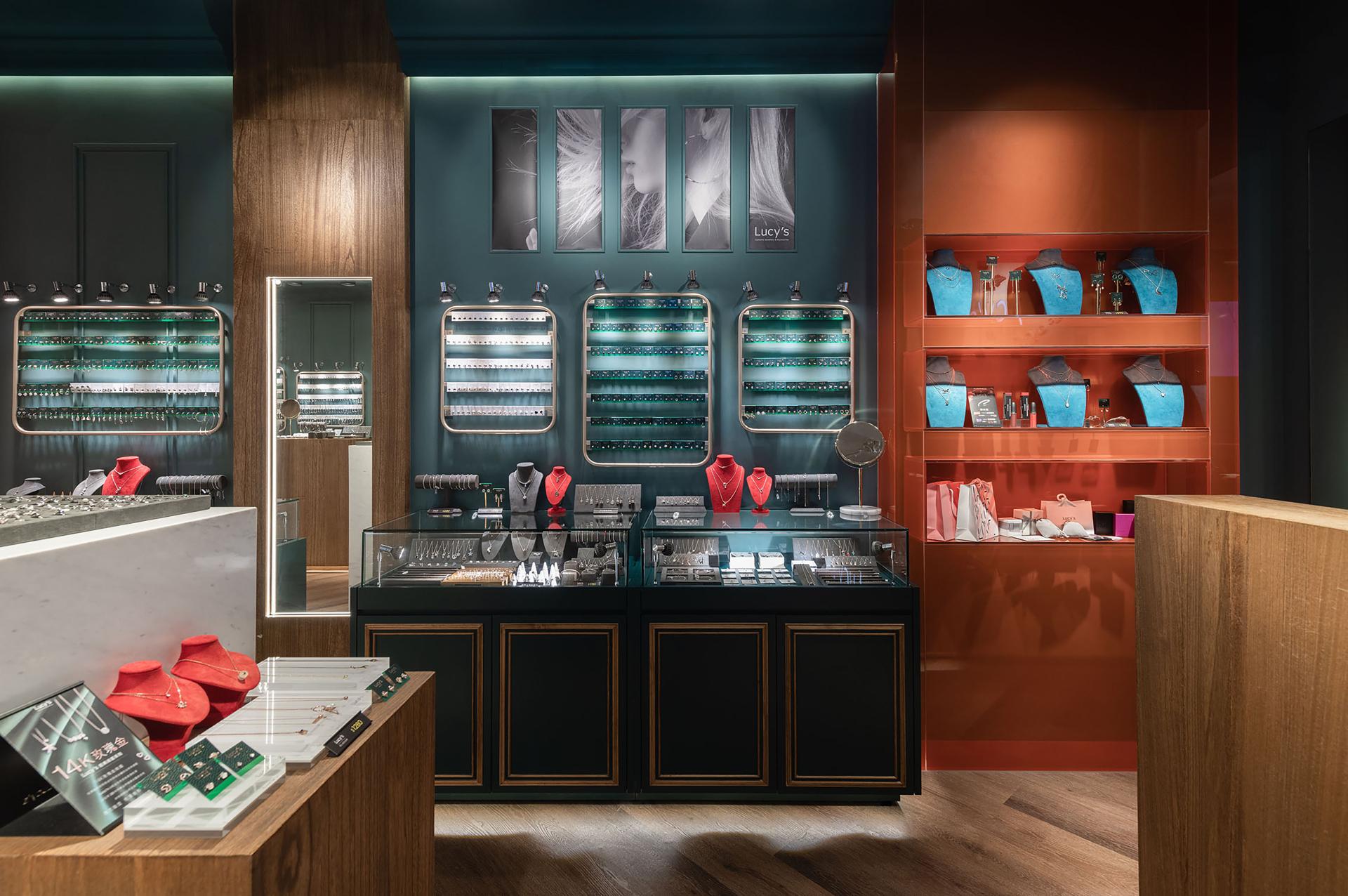 A full-height glass storefront lets passersby glimpse the main feature wall at the rear of the shop, creating a strong visual anchor that draws attention from the street. Inside, the space is organized around a central island, linking symmetrical display walls on either side to form a smooth, looping circulation path. This layout gently guides customers through a curated sequence of earrings, necklaces, and rings, ensuring each category receives equal visibility. Along the route, mirrored walls and try-on counters invite visitors to style, photograph, and share their selections within a carefully staged setting of light and atmosphere. The shopping experience becomes highly interactive, naturally extending into social media engagement and transforming retail into a fashion-forward experience.