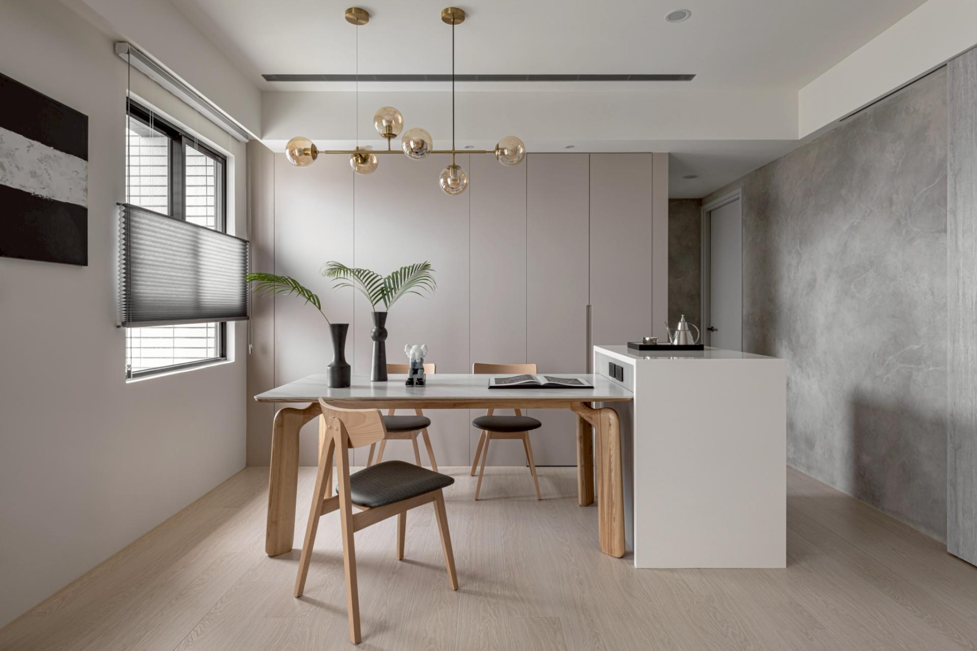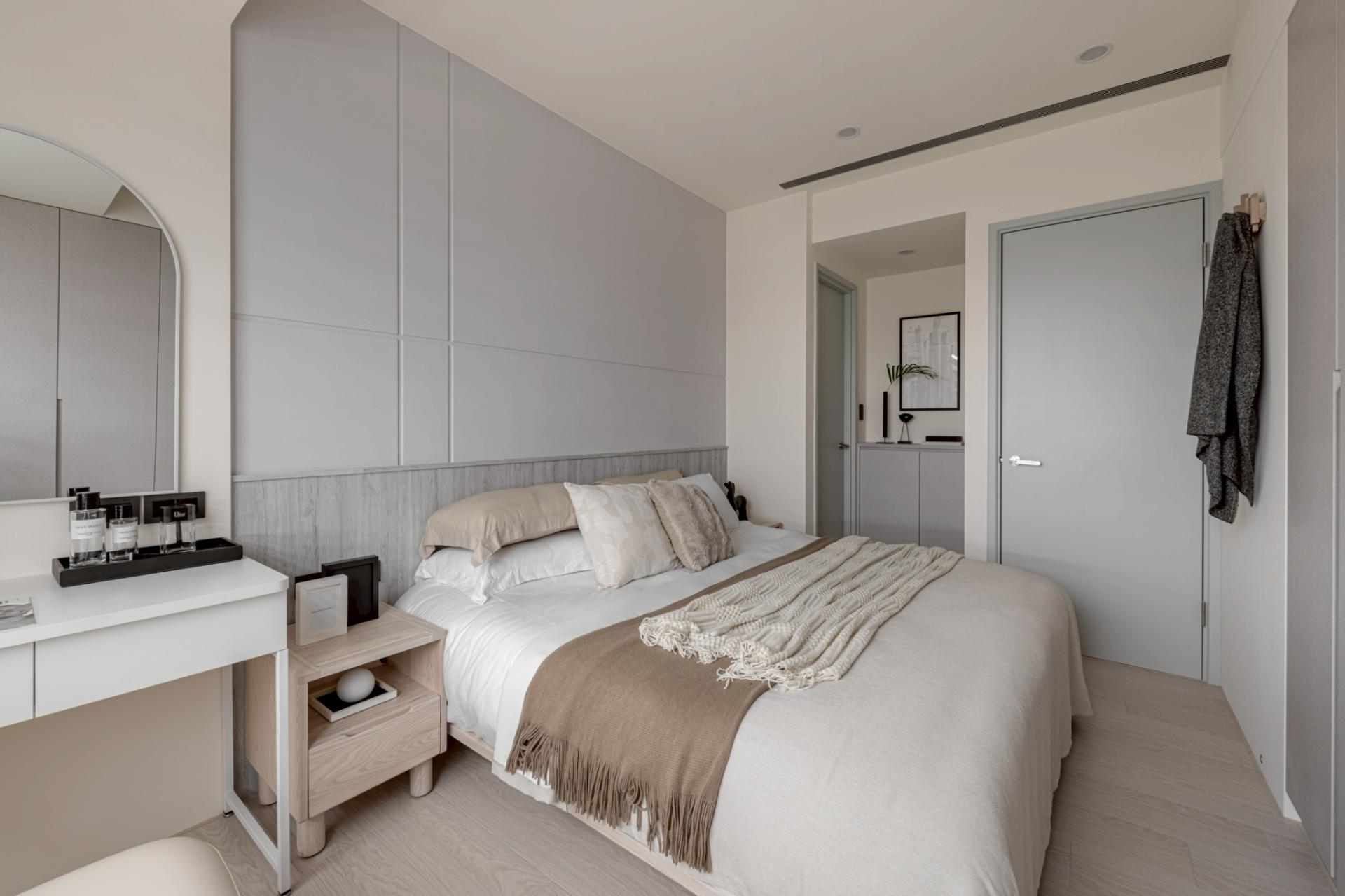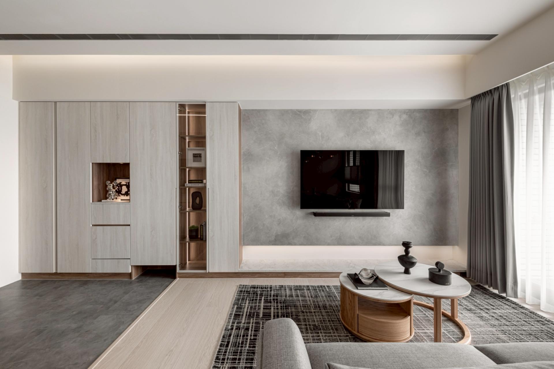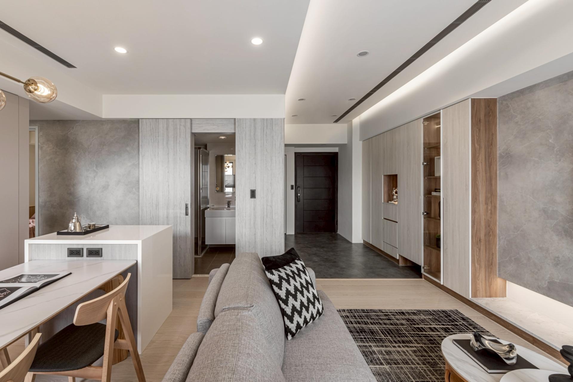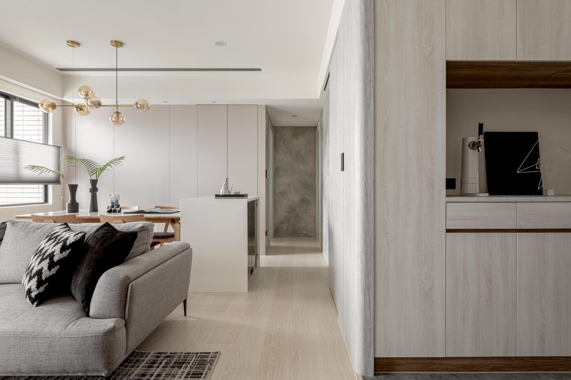 This expansive public domain not only maximizes natural light from the high-rise setting, but also allows the kitchen island and living room to function as a continuous platform for family interaction. The primary visual axis extends from the TV wall to the corridor’s end view. Instead of heavy natural stone, handcrafted artistic coatings create seamless, cloud-like stone pattern. Through layered processes that trace mineral veins, joint lines are eliminated, allowing the walls to express calm, grounded textures under shifting light. Curved ceiling forms mitigate the visual pressure of beams and equipment, while wood flooring weaves balance into the overall composition.