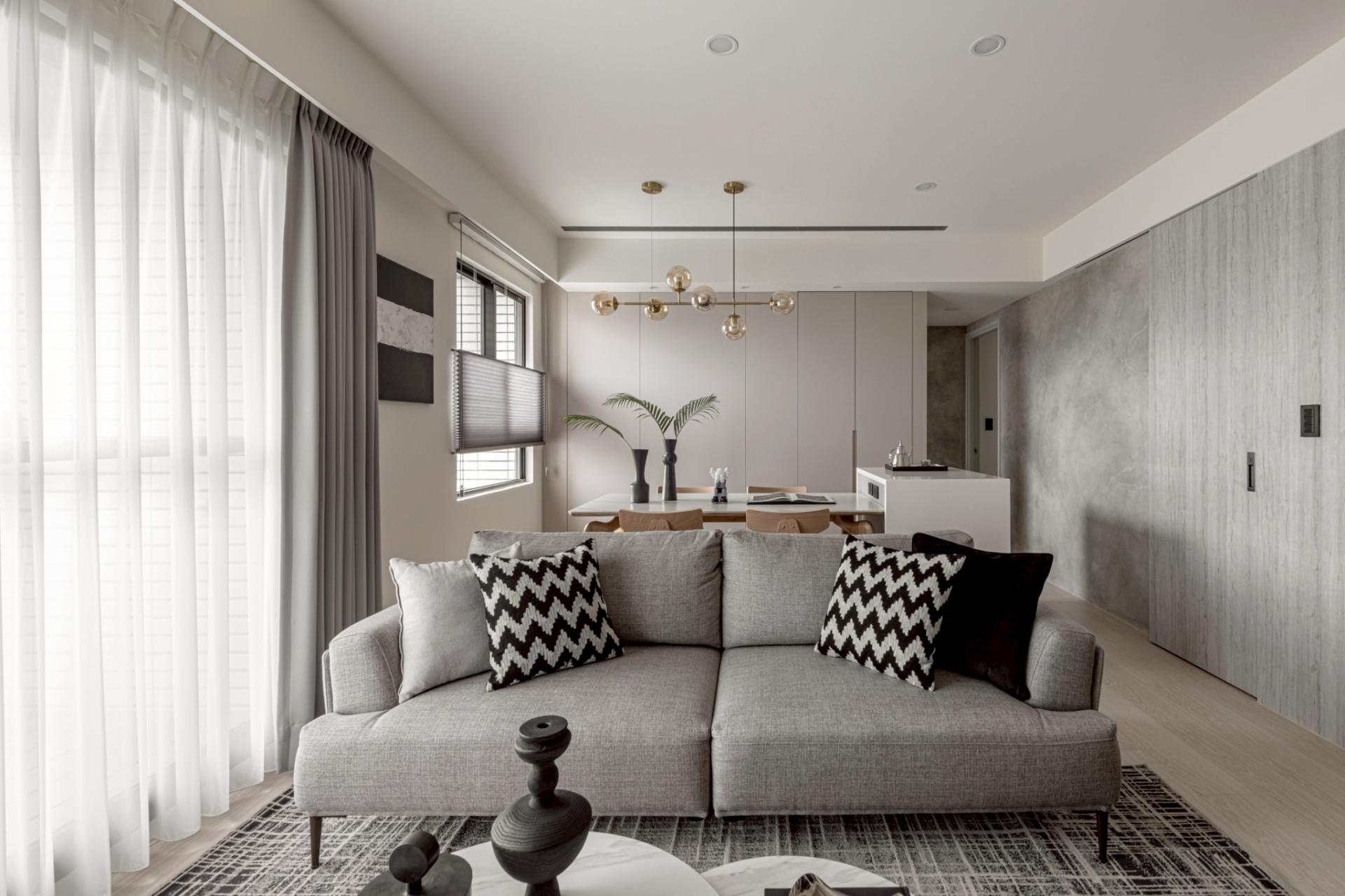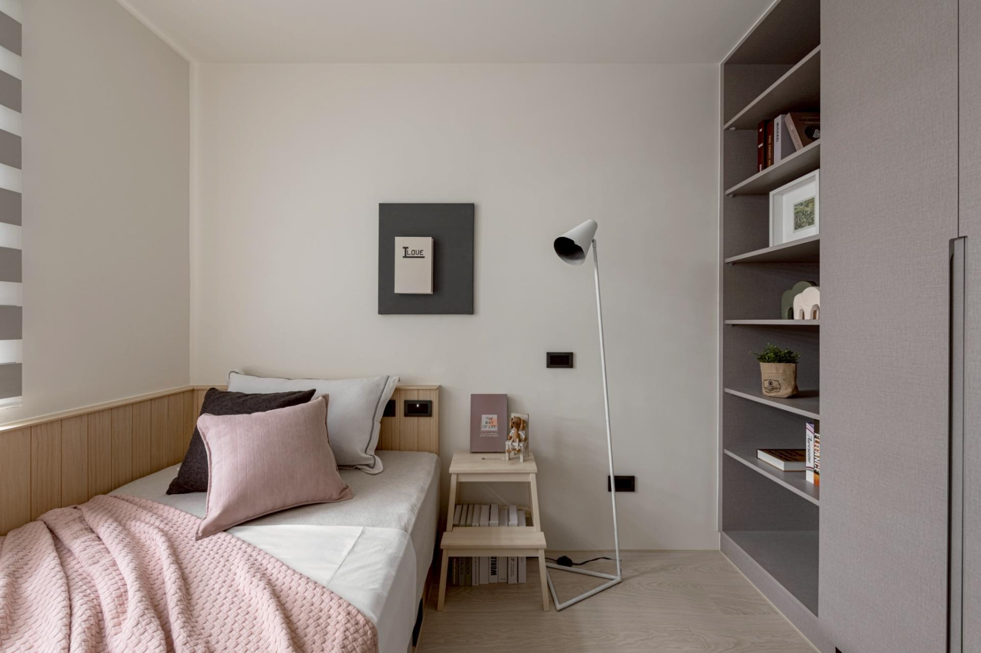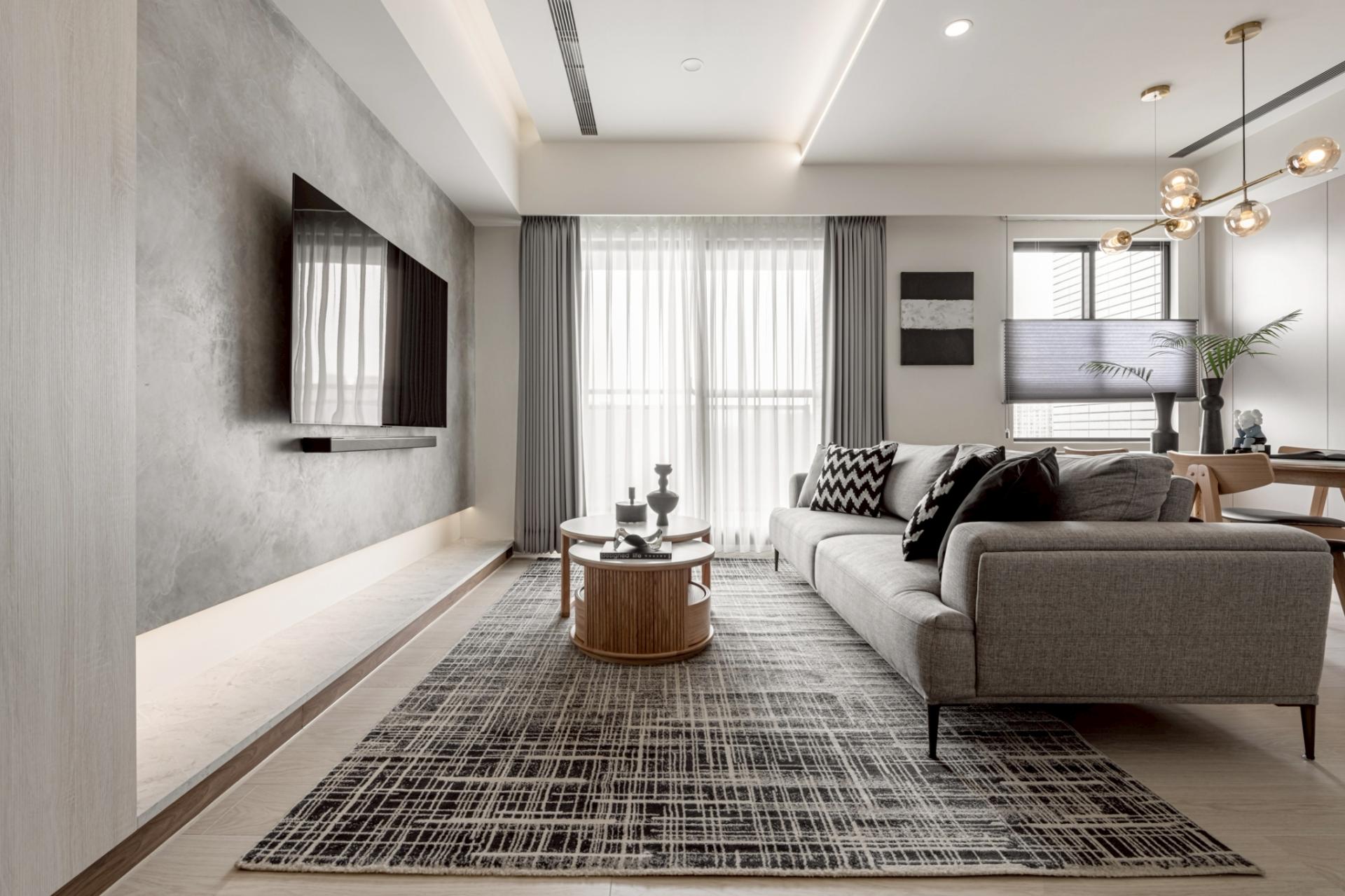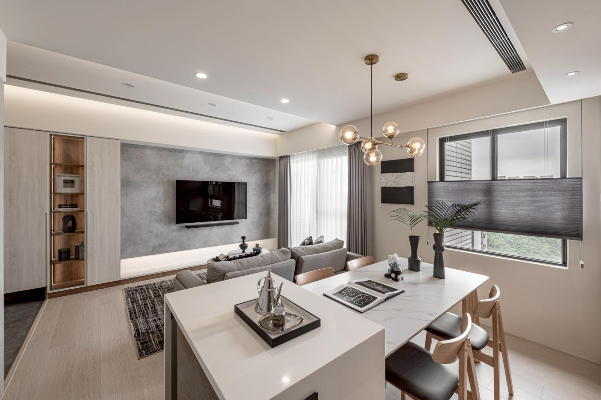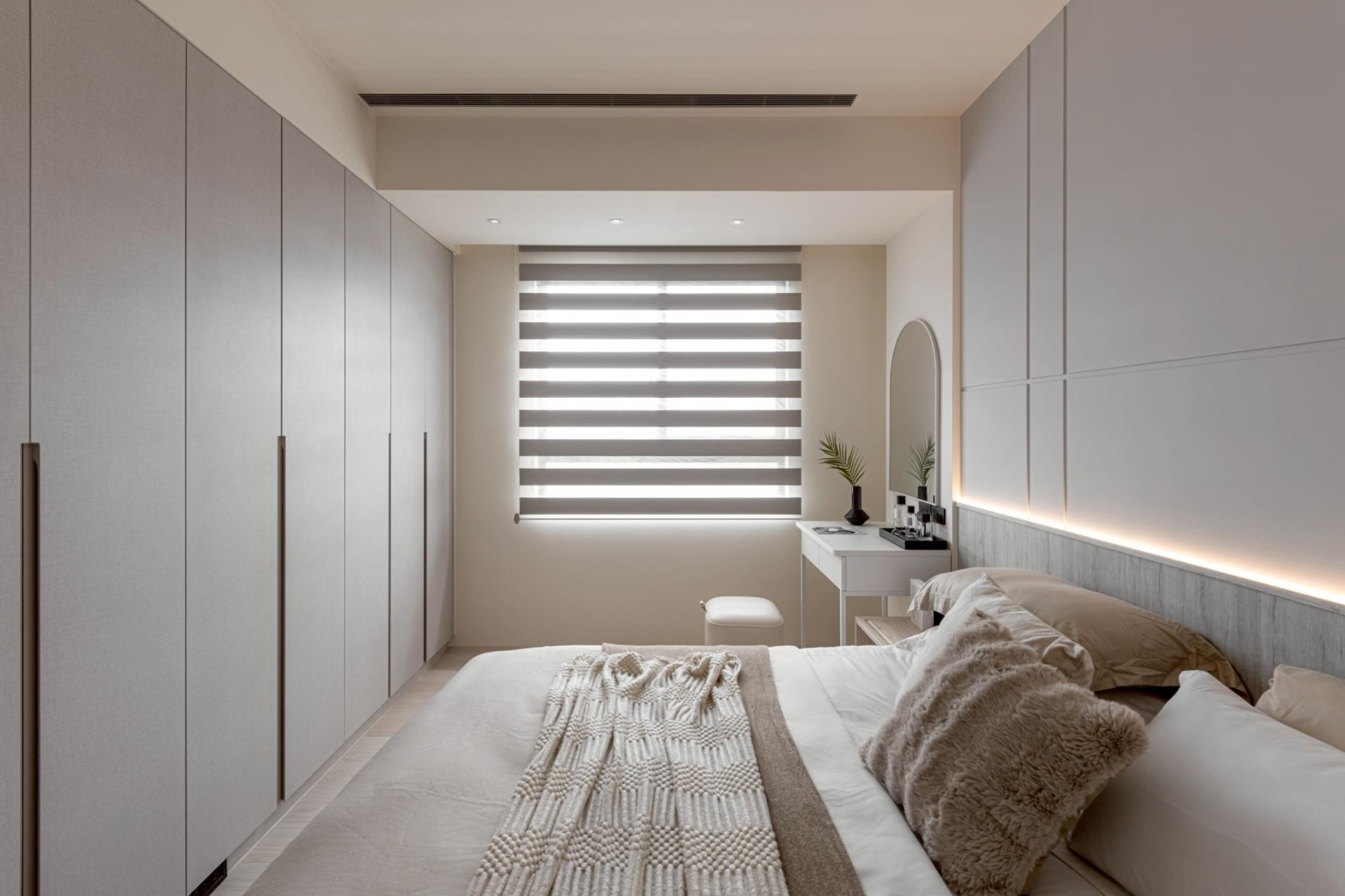 This expansive public domain not only maximizes natural light from the high-rise setting, but also allows the kitchen island and living room to function as a continuous platform for family interaction. The primary visual axis extends from the TV wall to the corridor’s end view. Instead of heavy natural stone, handcrafted artistic coatings create seamless, cloud-like stone pattern. Through layered processes that trace mineral veins, joint lines are eliminated, allowing the walls to express calm, grounded textures under shifting light. Curved ceiling forms mitigate the visual pressure of beams and equipment, while wood flooring weaves balance into the overall composition.