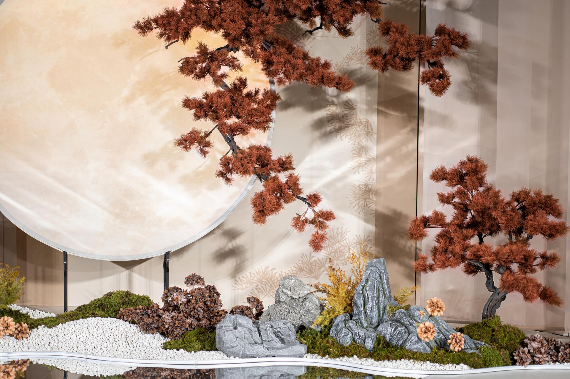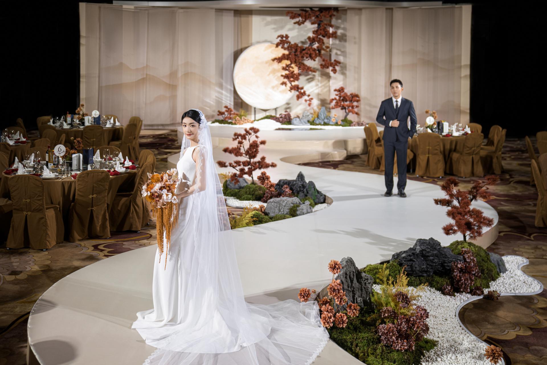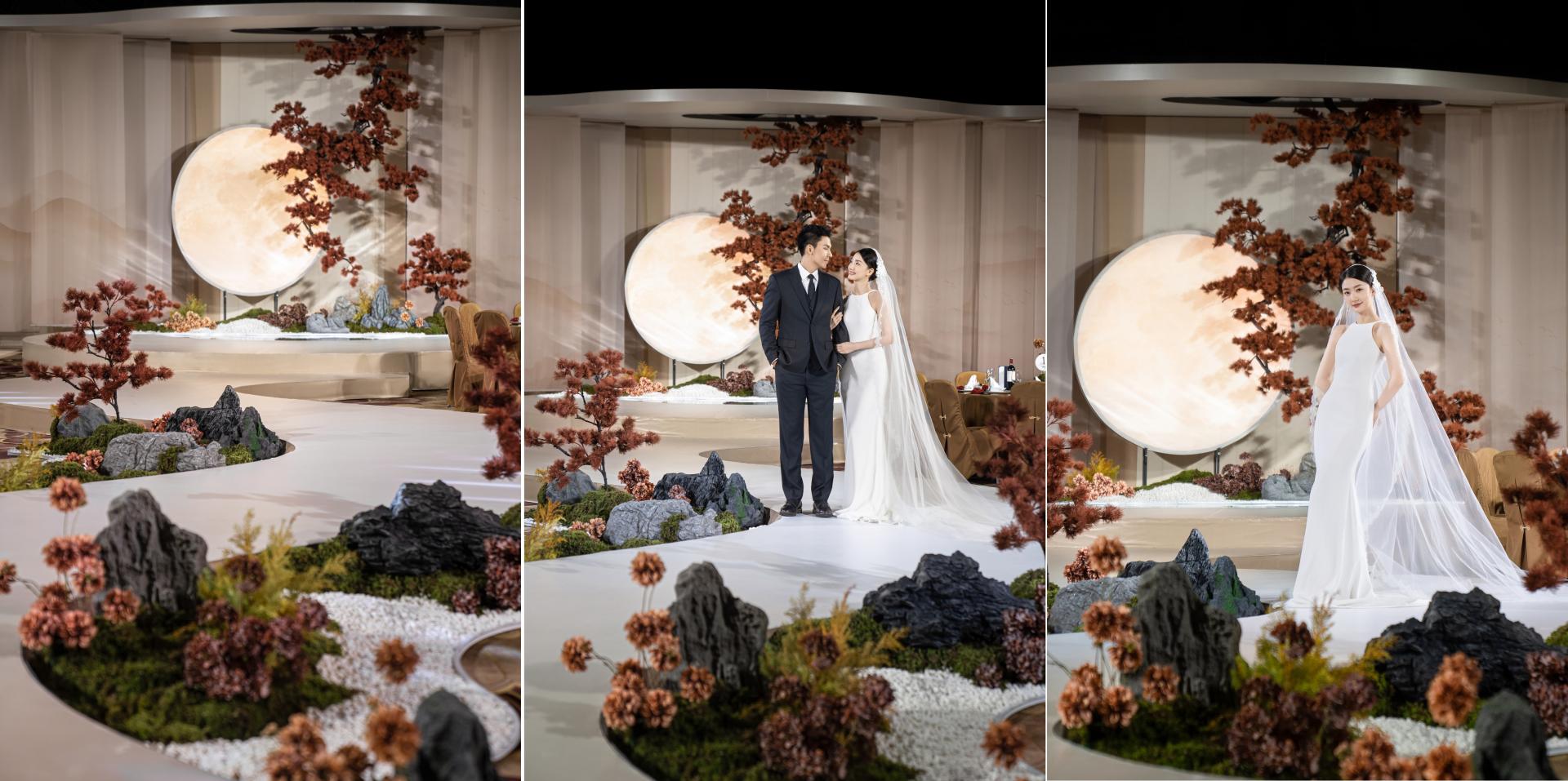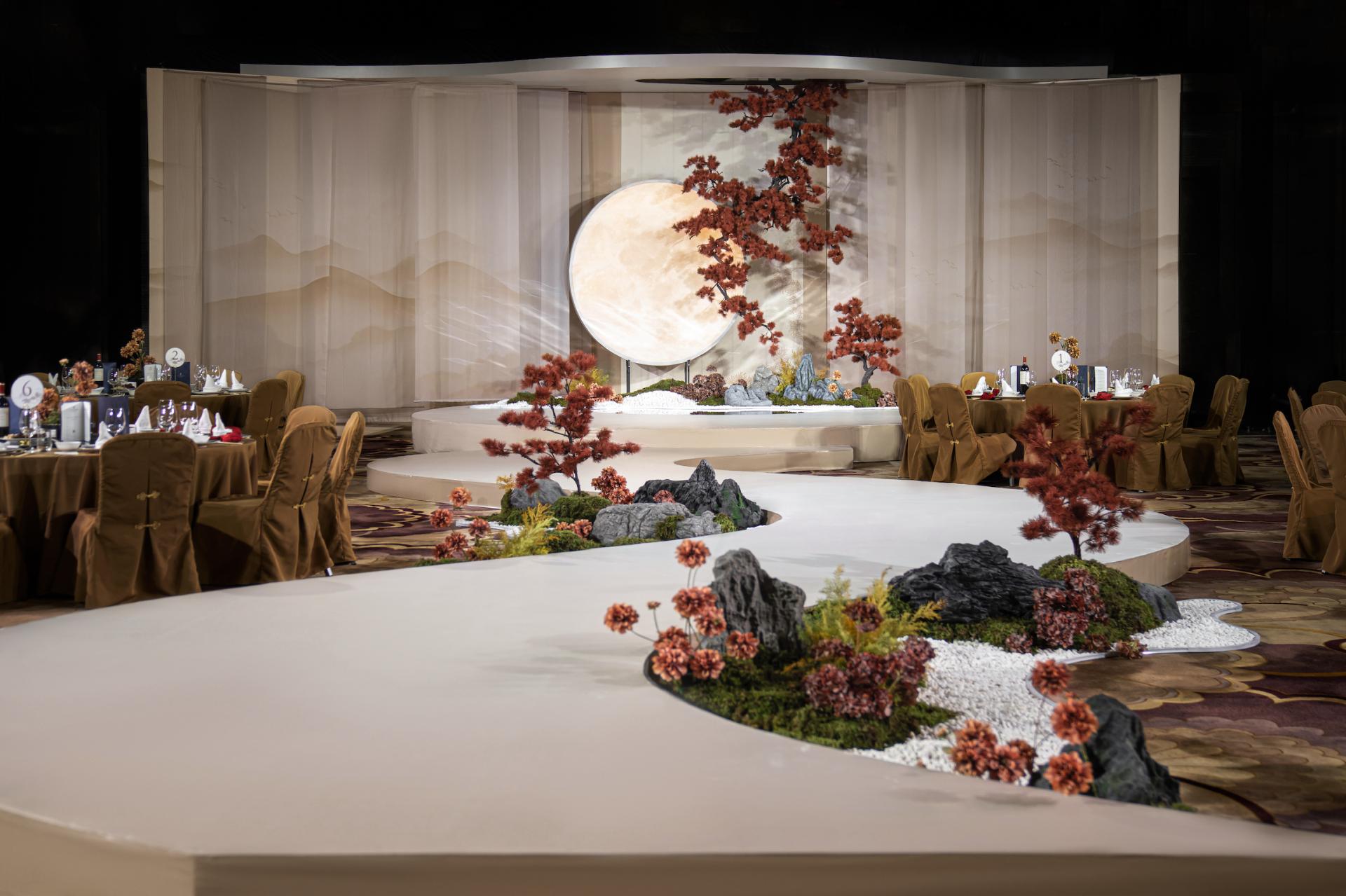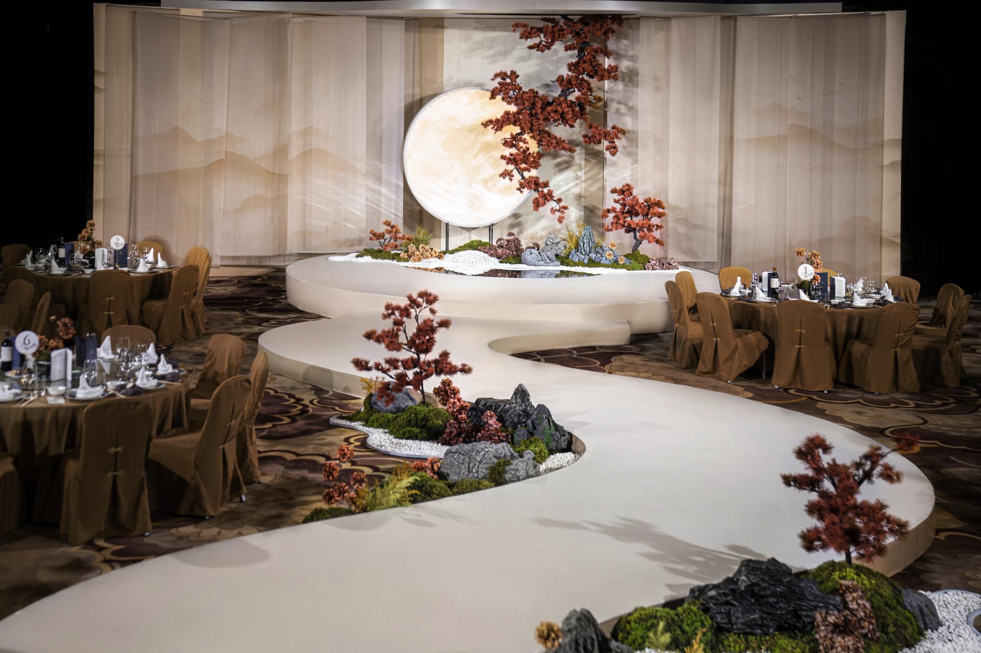 The winding runway mimics a mountain spring, lined with scattered white pebbles, gray stones, and moss—echoing "clear springs over stones" to hint at a gentle, smooth married life. Rejecting ornate decor, the design focuses on core elements: stones, pines, moon, and flowers. Through balanced warm-cool hues and rigid-soft forms, it recreates Jiangnan's elegance while interpreting Chinese weddings’'cultural core—subtle profound affection and a fulfilled, lasting union.