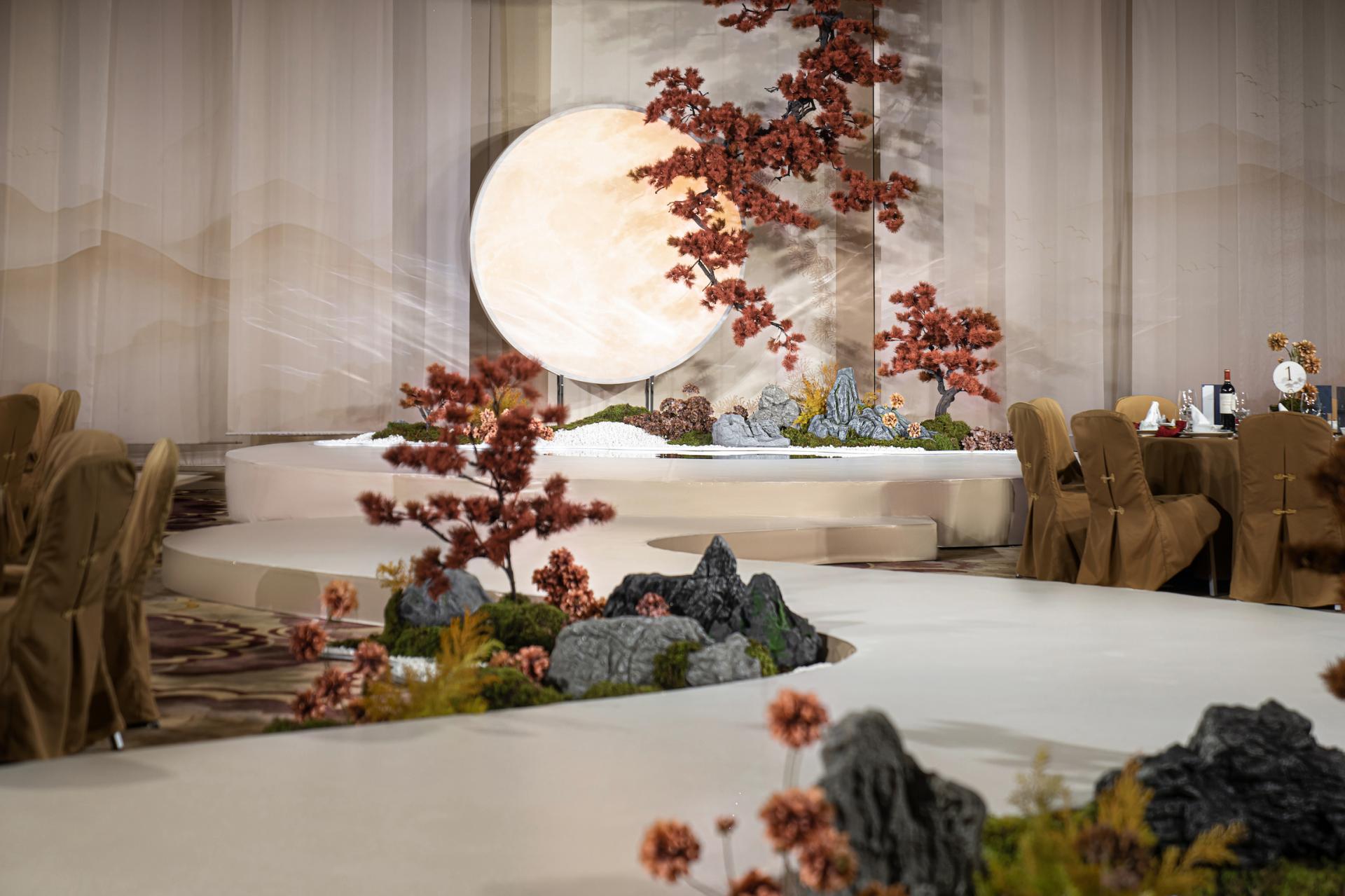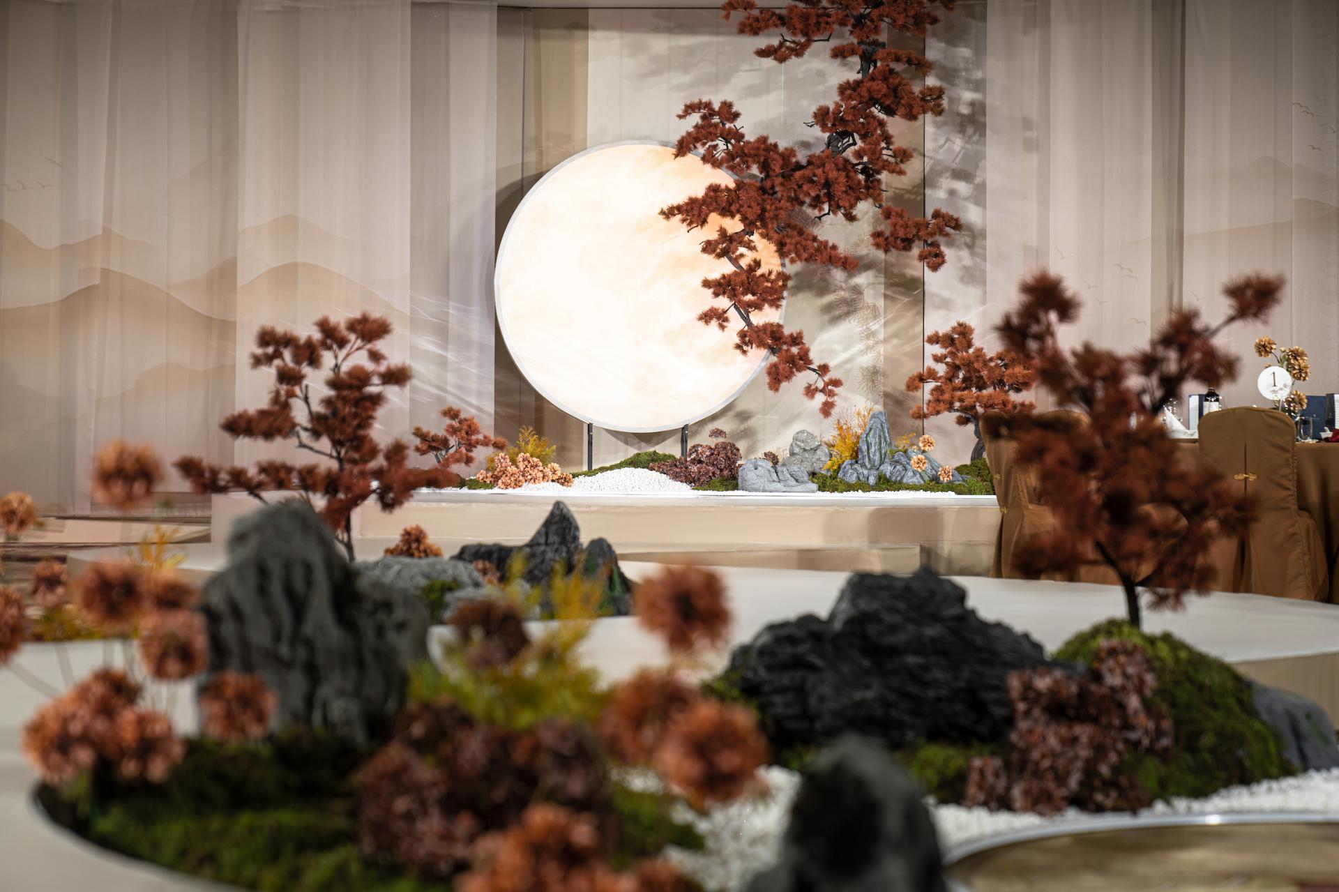 Inspired by the couple's names ("bright moon" and "pine"), the circular stage symbolizes wholeness. Suspended orange-red pine branches and a full moon create a "pines-moon interplay": the moon represents pure, enduring companionship, while pines signify the couple’s unwavering, evergreen bond.