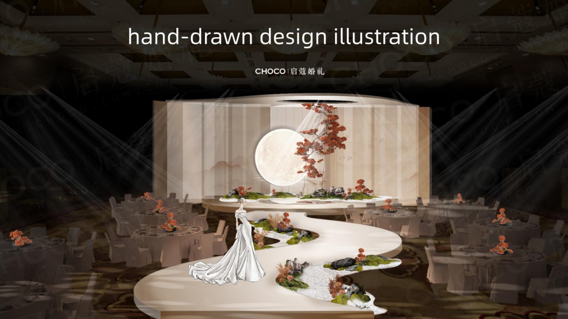 This wedding design embodies Eastern aesthetics and Jiangnan charm, drawing from Tang-Song garden culture and Wang Wei's poem "Autumn Evening in the Mountains." Blending the poet's "Moonlight Shines Through the Pines, Clear Springs Flow Over Stones" with Chinese wedding romance, it turns poetic tranquility into a tangible scene, letting love settle in "natural Zen-inspired blank space"—the design's essence.