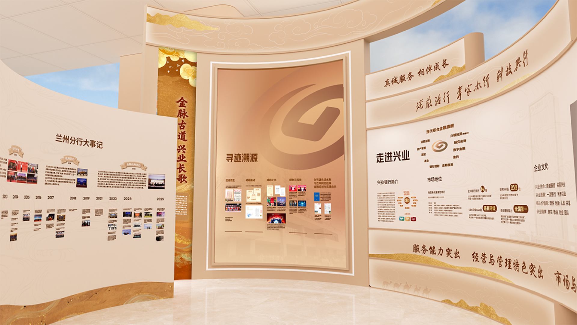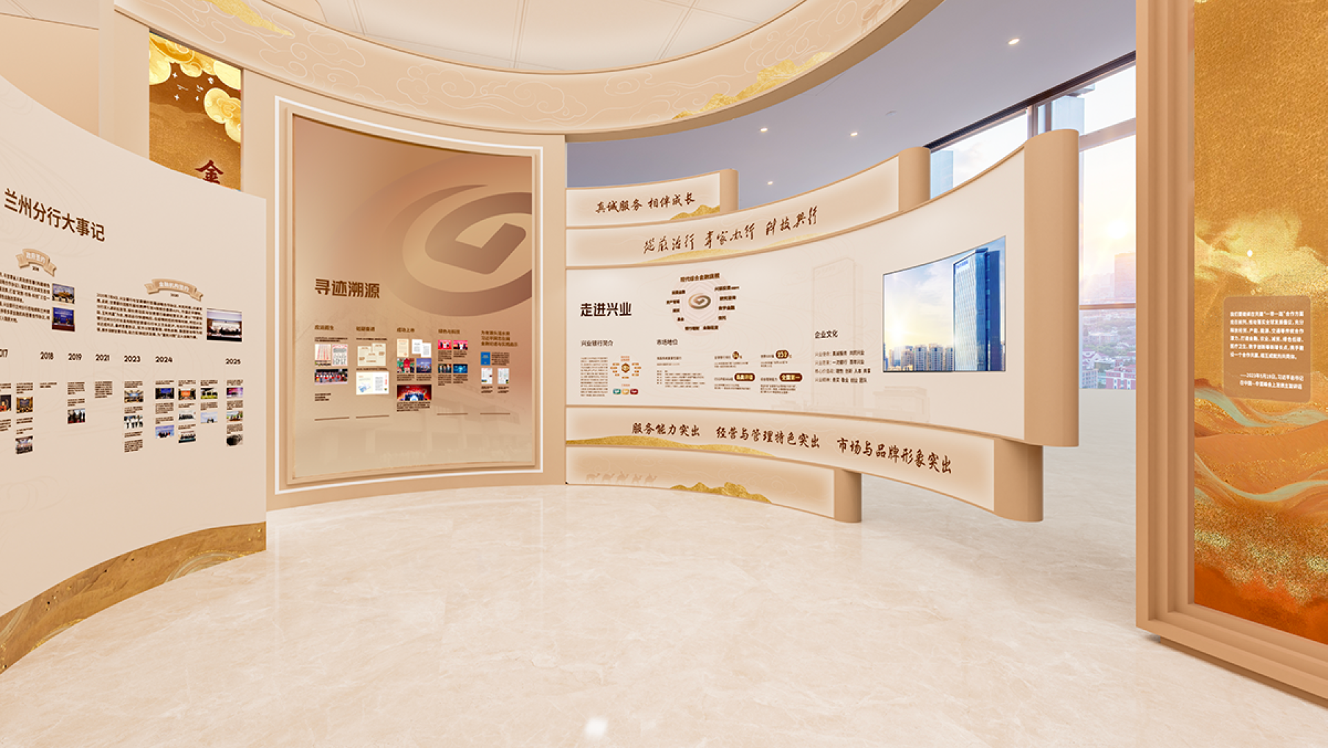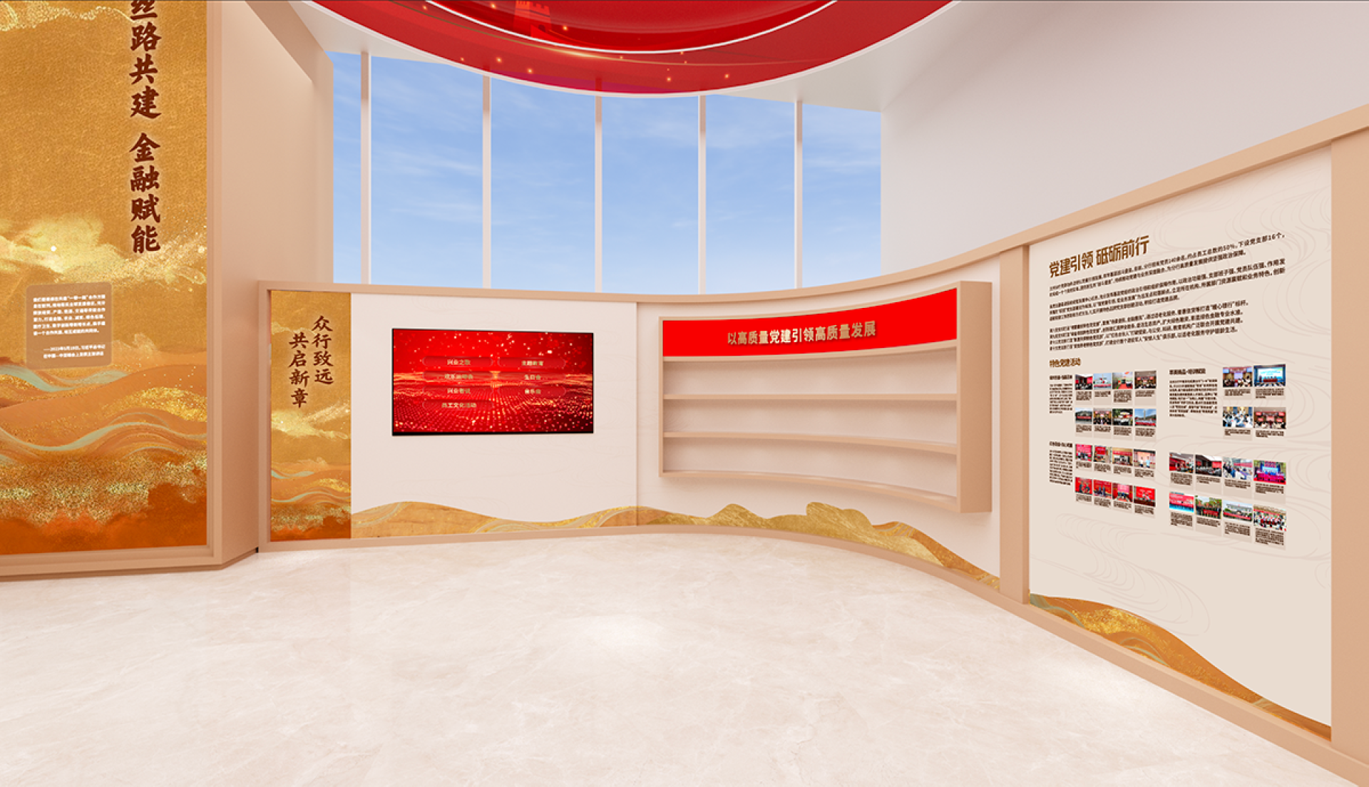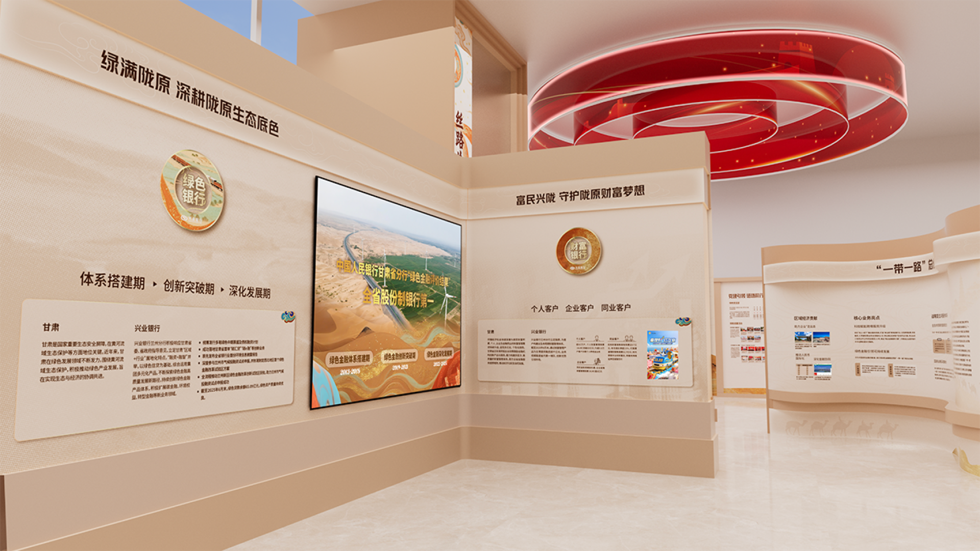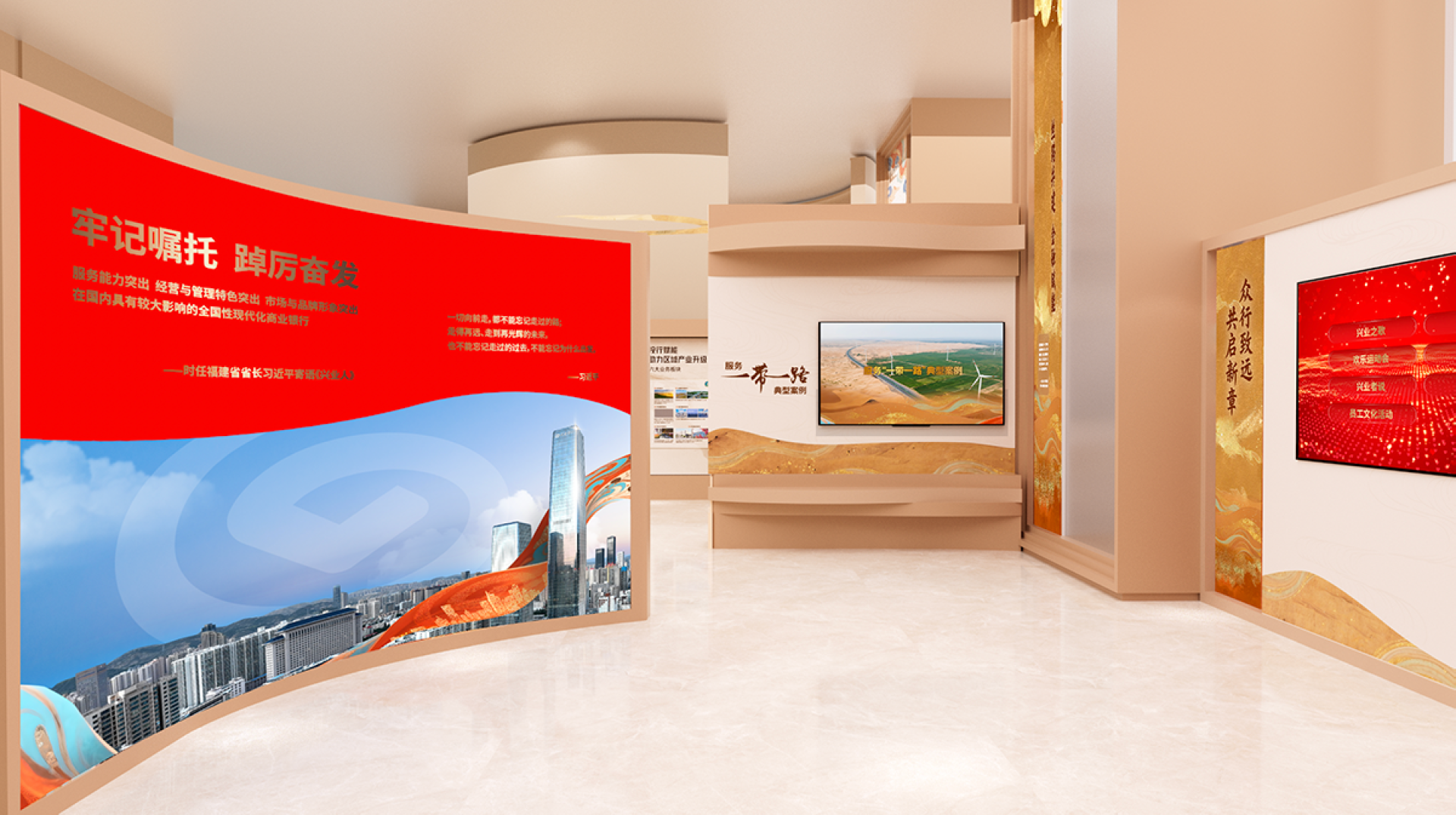 This exhibition hall is centered around the core design concept of "Financial Mission · New Chapter of the Silk Road," skillfully integrating Industrial Bank's development narrative guided by Party-building, the cultural heritage of the Silk Road, and the modern financial brand image to create a unique and innovative Party-building cultural space.