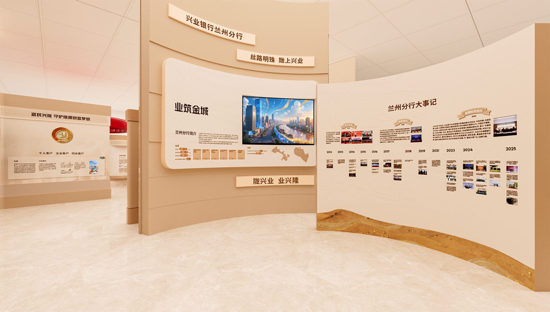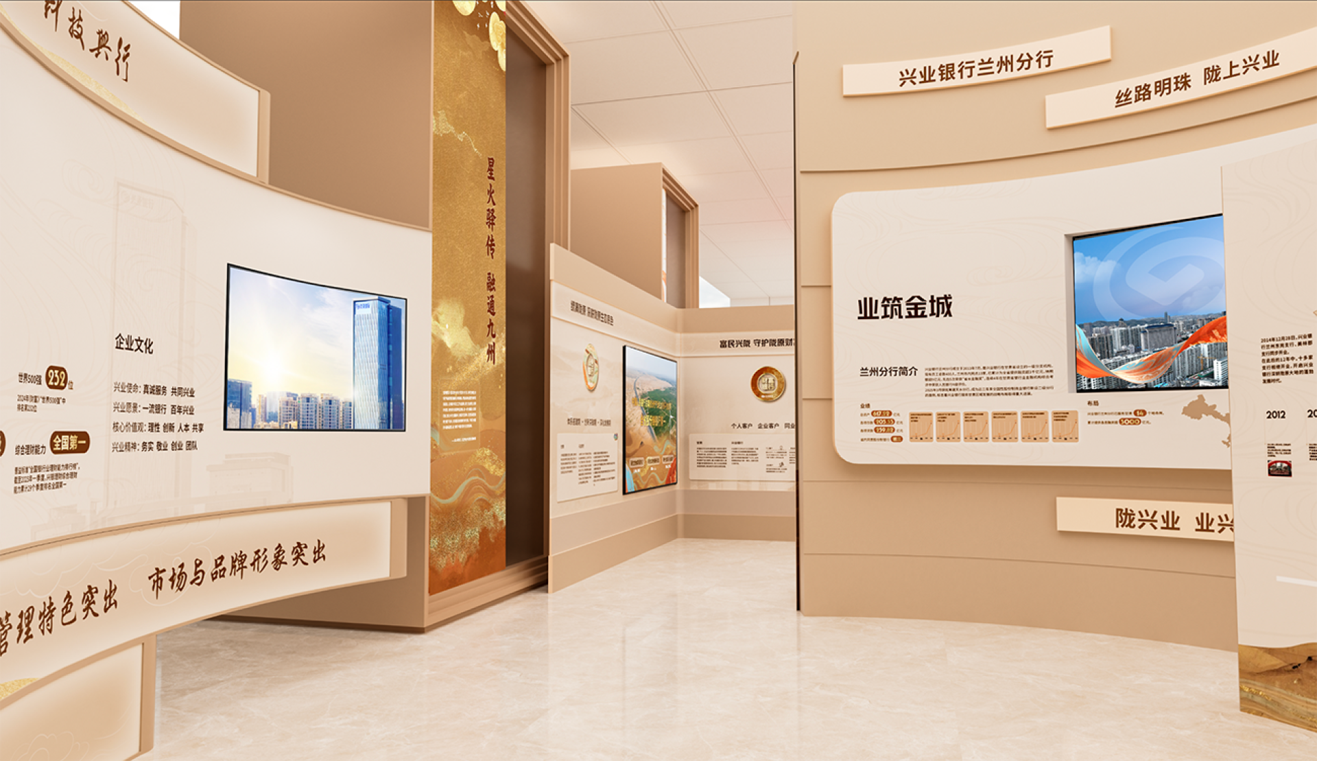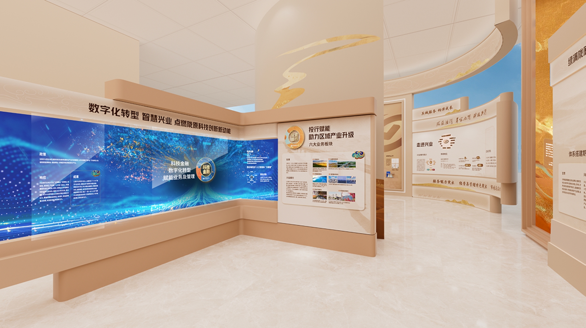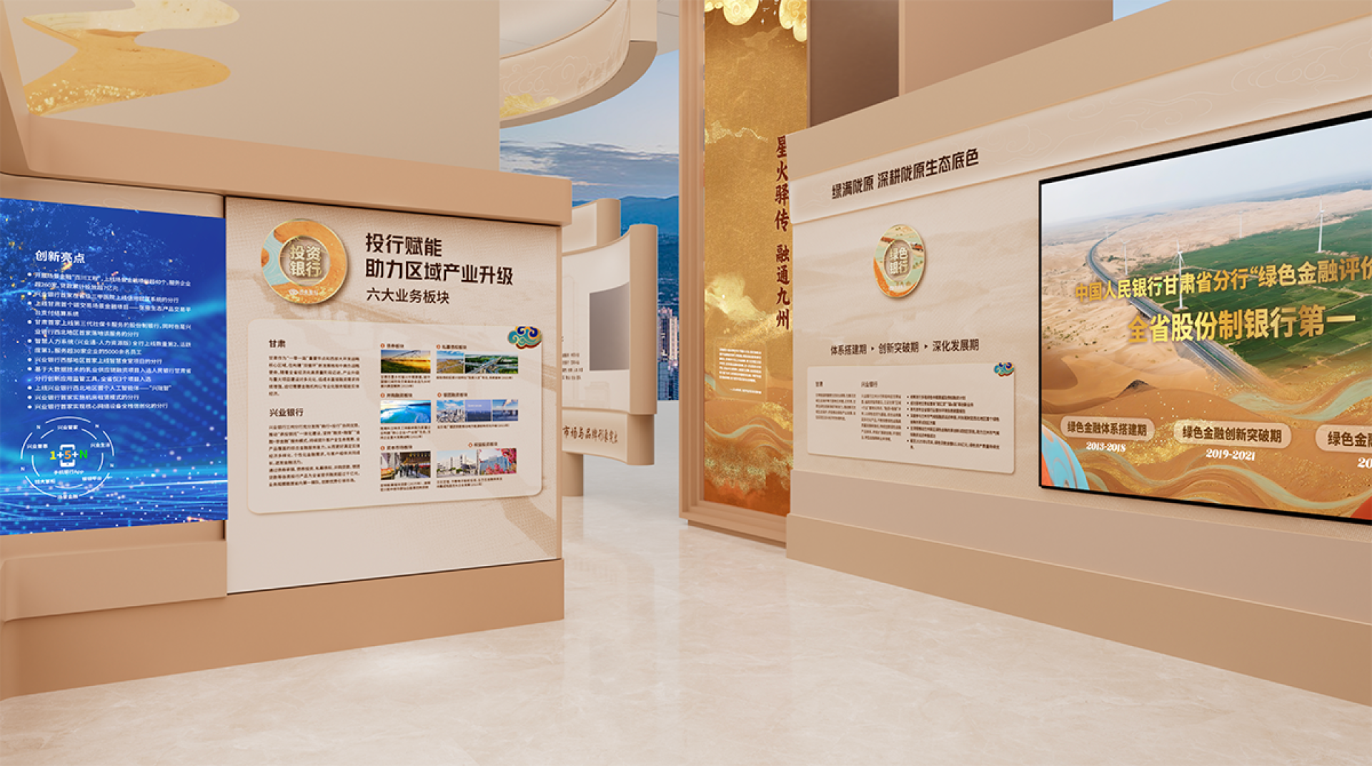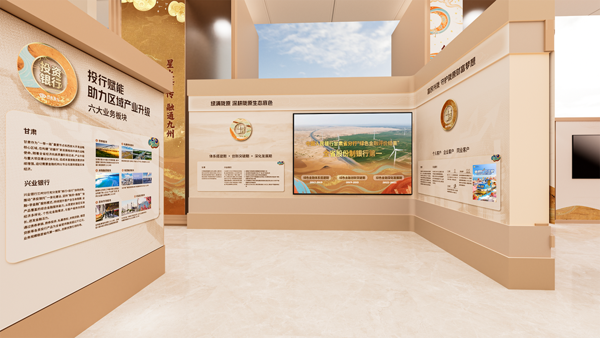 This exhibition hall is centered around the core design concept of "Financial Mission · New Chapter of the Silk Road," skillfully integrating Industrial Bank's development narrative guided by Party-building, the cultural heritage of the Silk Road, and the modern financial brand image to create a unique and innovative Party-building cultural space.