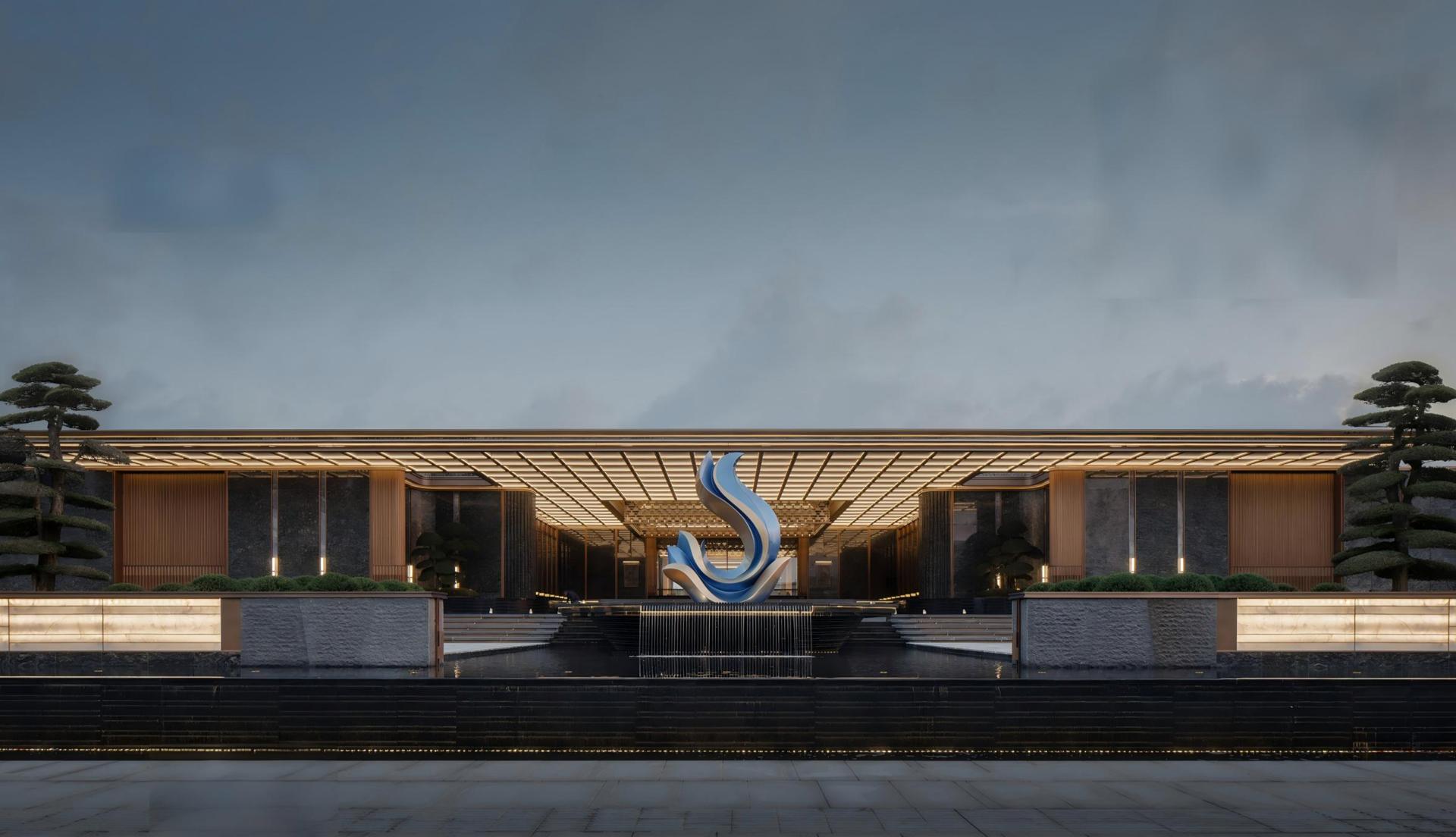 Aesthetically, the project harmonizes modern Eastern elegance with layered spatial composition. A refined color palette anchors the design: platinum luxury stone offers a restrained metallic luster, offset by sapphire-blue accents and warmed by champagne-gold metal detailing. These elements evoke the shifting coastal light, balancing cool serenity with subtle warmth. Each material is selected for its expressive narrative: platinum and sapphire luxury stones convey distinction and preciousness; bronze and champagne-gold metals impart richness and solidity; tempered glass and glass blocks introduce transparency and lightness. Every surface is meticulously finished to ensure enduring quality. Complementing this palette is Zelkova serrata, a Chinese endemic species revered as a “living fossil,” whose sculptural presence adds botanical gravitas without overpowering the overall spatial atmosphere.