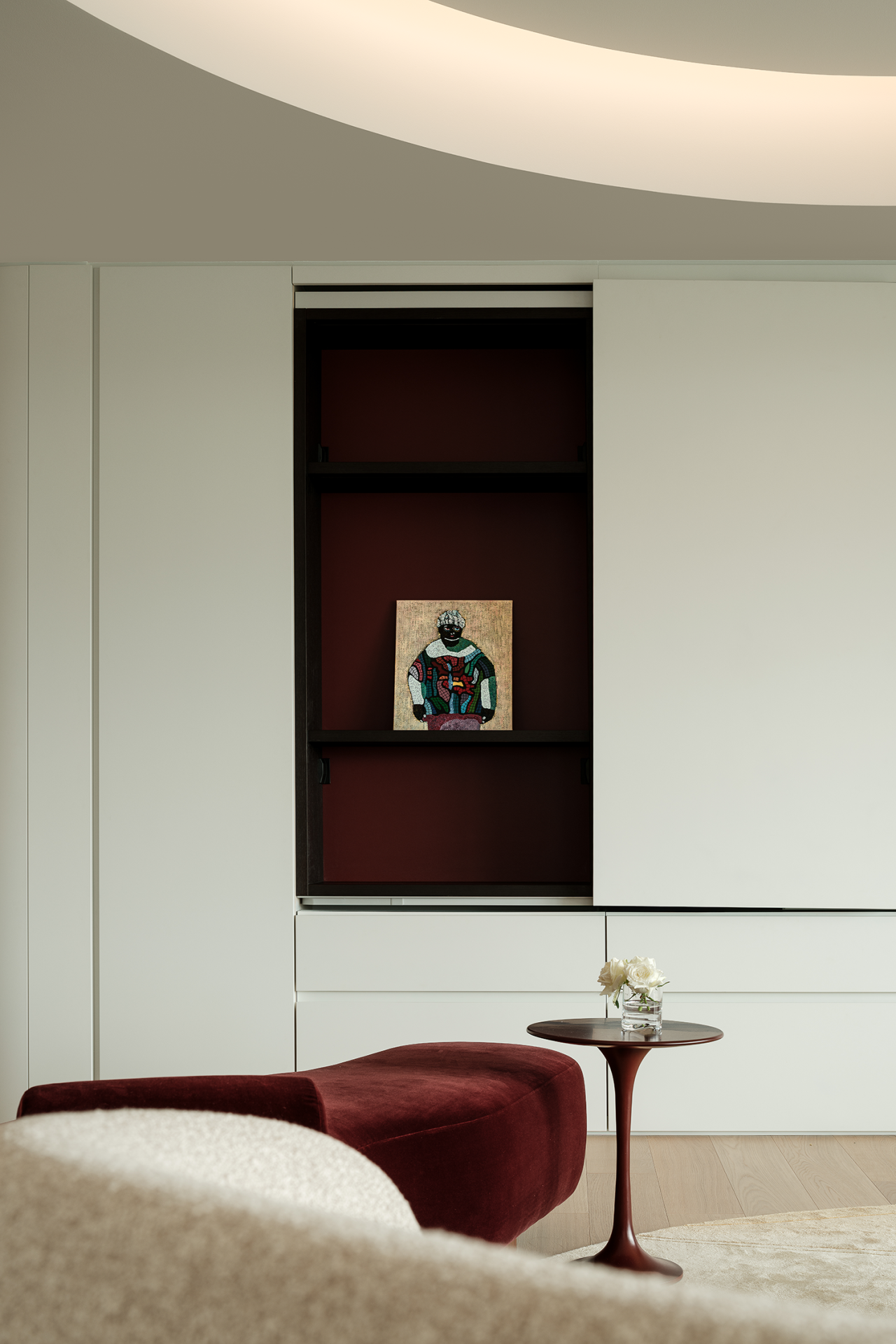 Artworks, each with a unique presence, enliven the tranquil atmosphere, weaving narrative and memory into the space. Natural branches and artistic paintings become a part of the space’s very essence. Furniture pieces, with their sculptural forms, orchestrate a symphony of strength and beauty—where rational structures support the gentle rhythm of daily life. Shifts in light—warm or cool, soft or intense—finely tune the spatial mood, breathing vitality into materials. Art sculptures become visual and spiritual focal points, their growing forms infusing vitality and deepening the home’s aesthetic resonance.