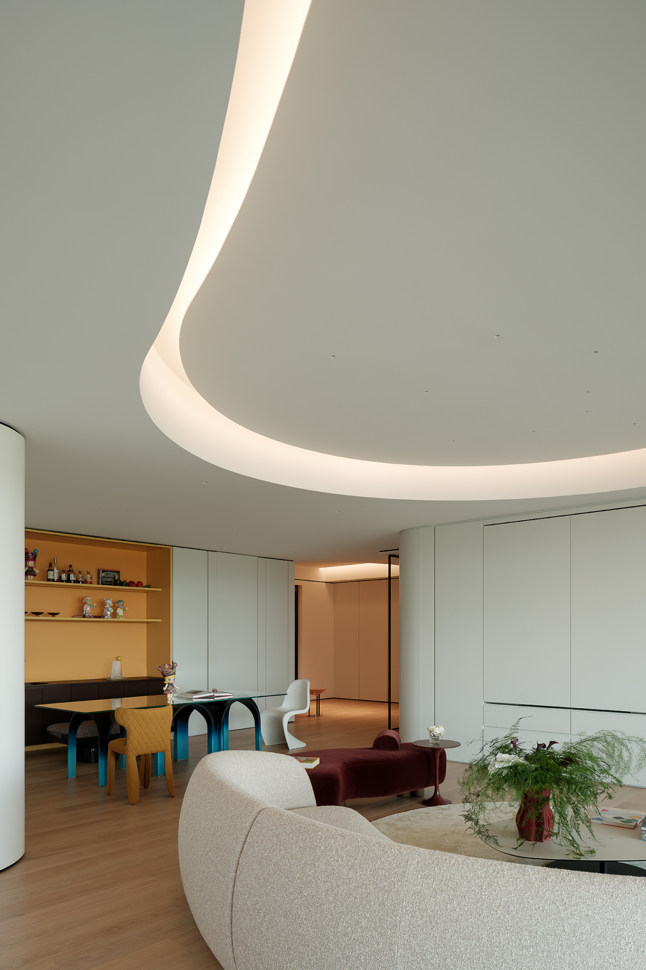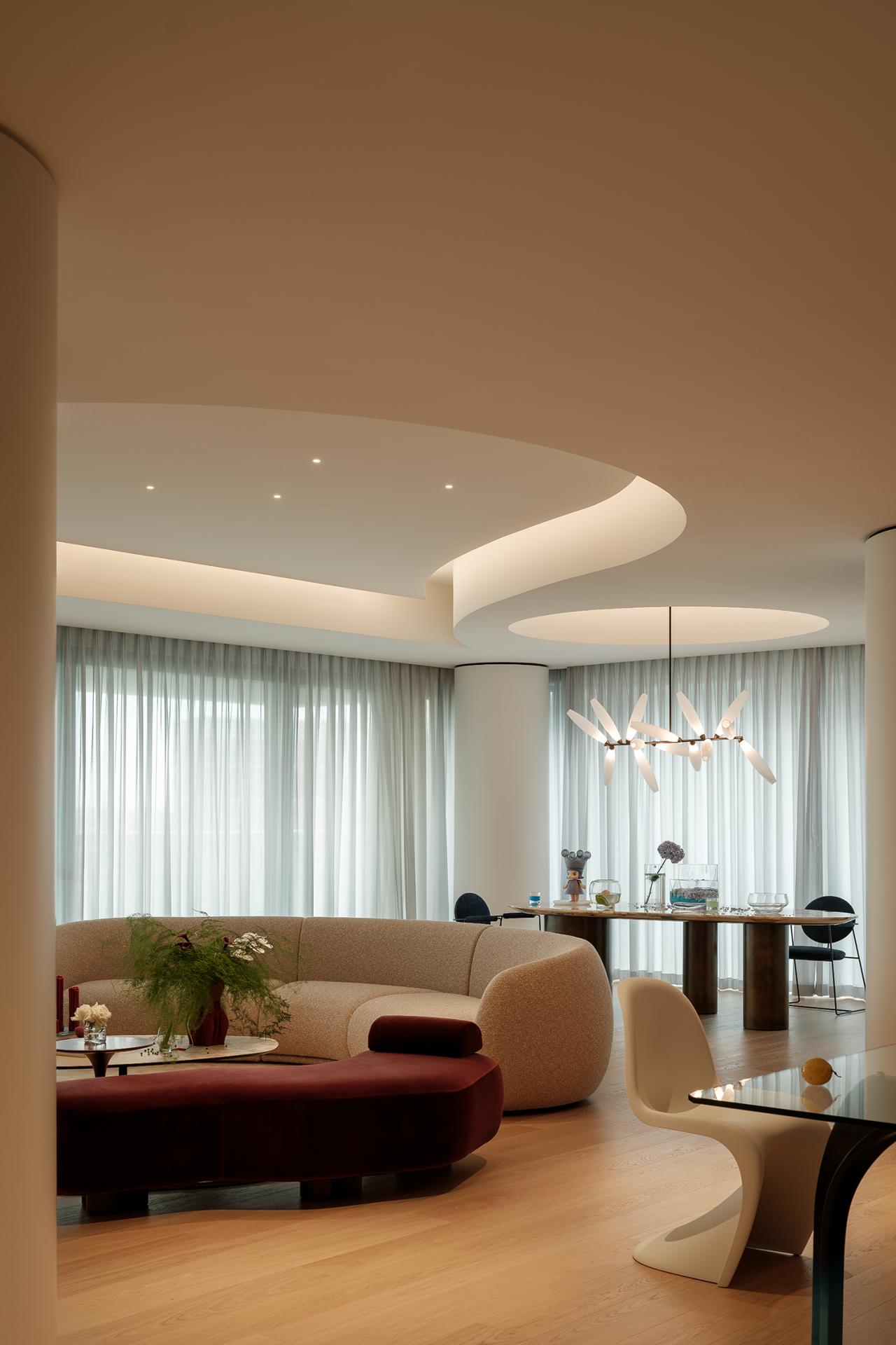 The living room, dining area, and bar counter unfold in an open layout, forming a vibrant, interactive hub. Light and sightlines flow freely across the space, while graceful curves generate striking visual tension. Vivid, saturated colors emerge from a calm, neutral palette, fusing with organic forms to establish visual anchors—articulating an optimistic and open spatial identity, and shaping an environment that invites relaxation and lively interaction.