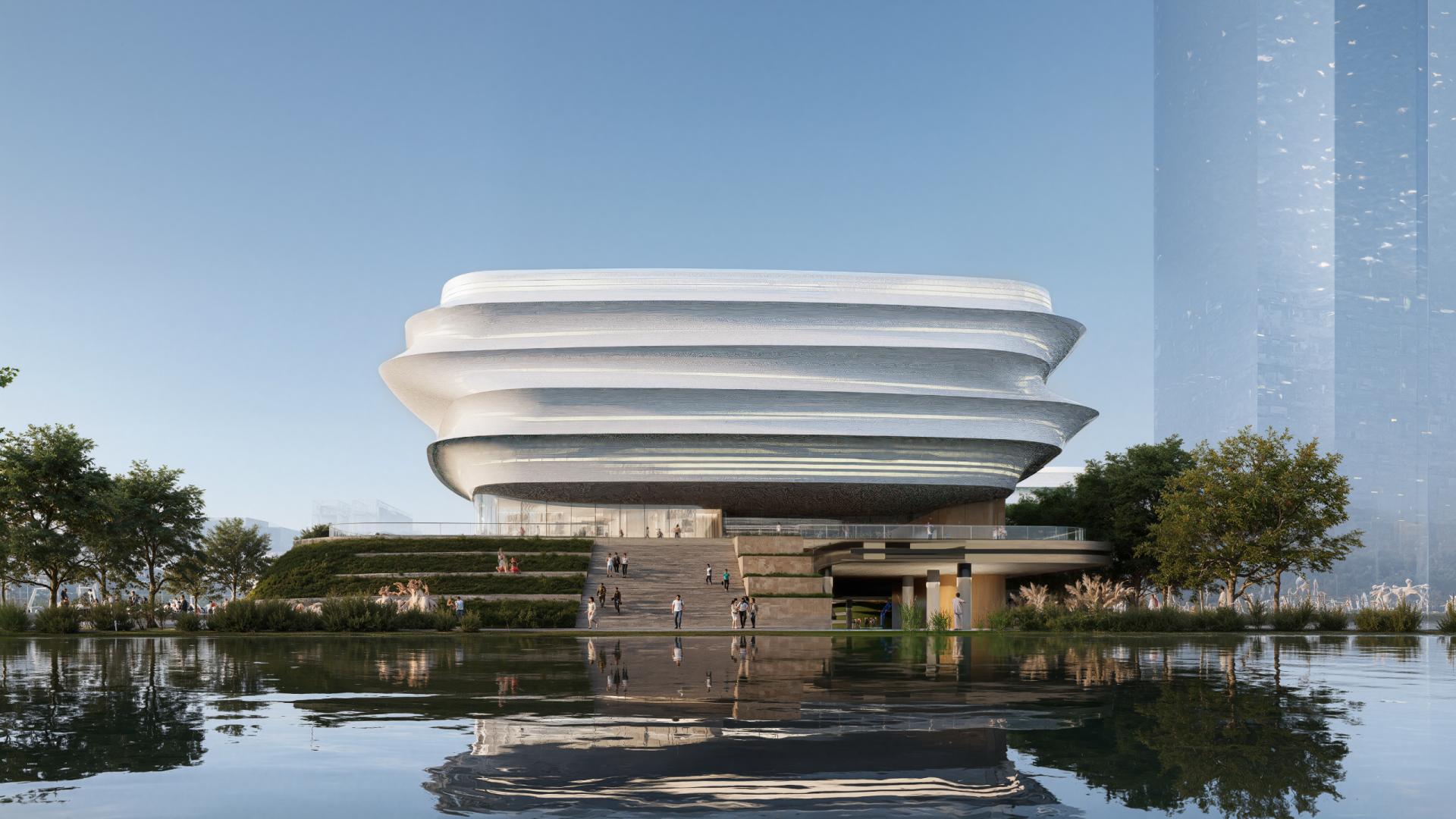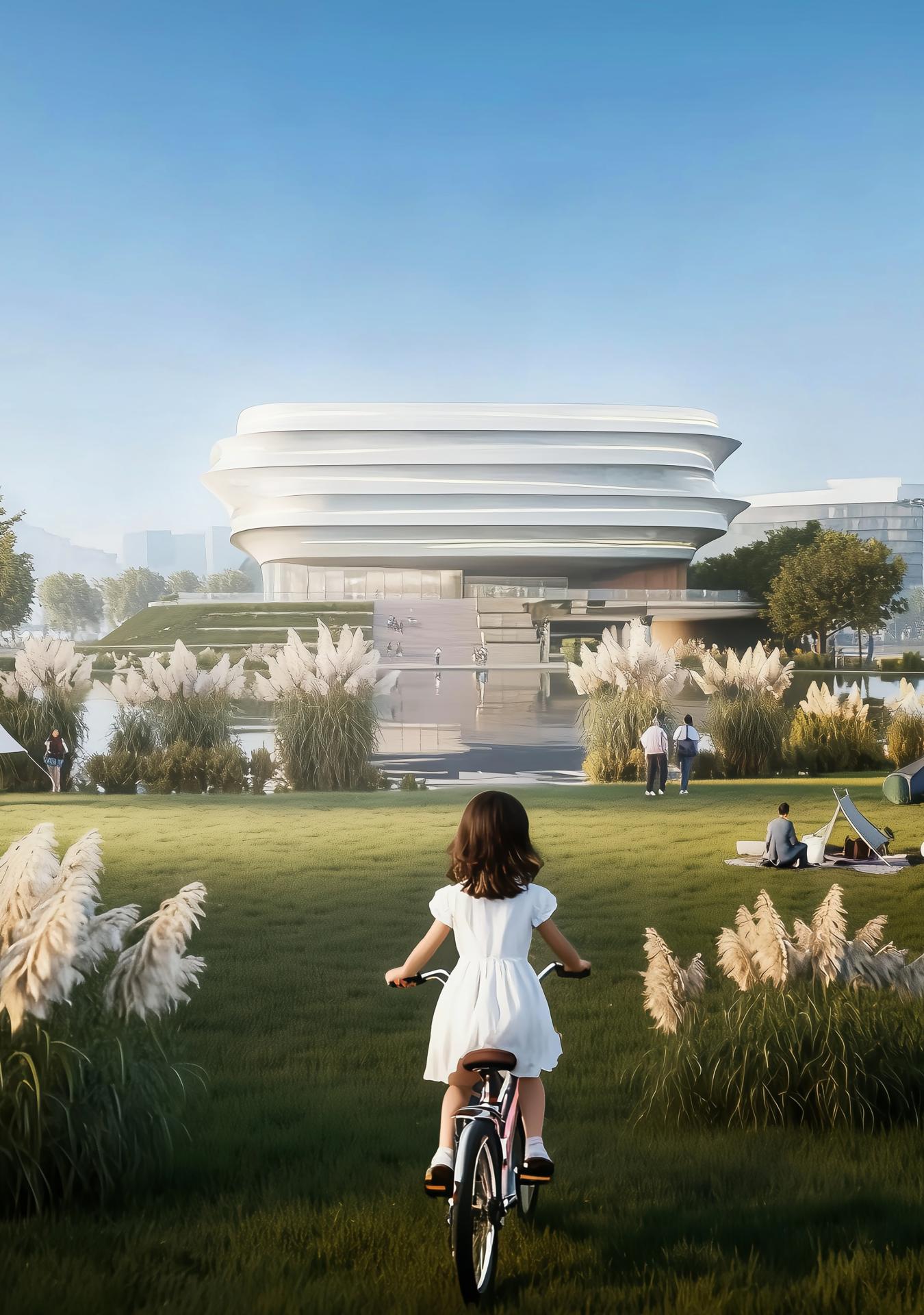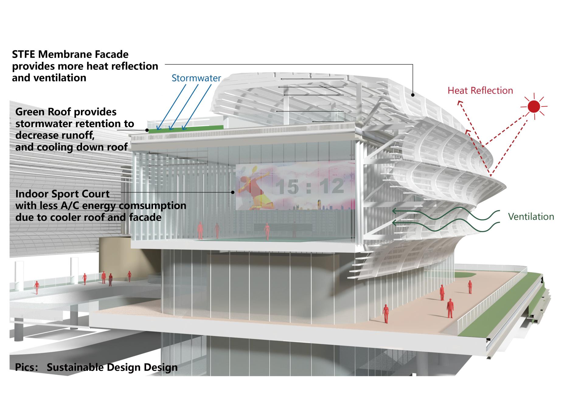 Addressing the client’s priorities for economy and sustainability, the original pool structure was retained and adaptively reused to minimize demolition and earthwork costs. Green roofs integrate with the surrounding lawn to form a tiered stormwater system, offering cooling and rainwater retention suited to the local hot, rainy climate. The double-skin façade combines a lightweight STFE membrane with conventional glazing system, achieving a distinctive aesthetic without complex supports. This also improves ventilation and shading, while the self-cleaning surface ensures low maintenance. The site reborn from an isolated grey infrastructure to a natural, sustainable, vibrant and cohesive community hub.