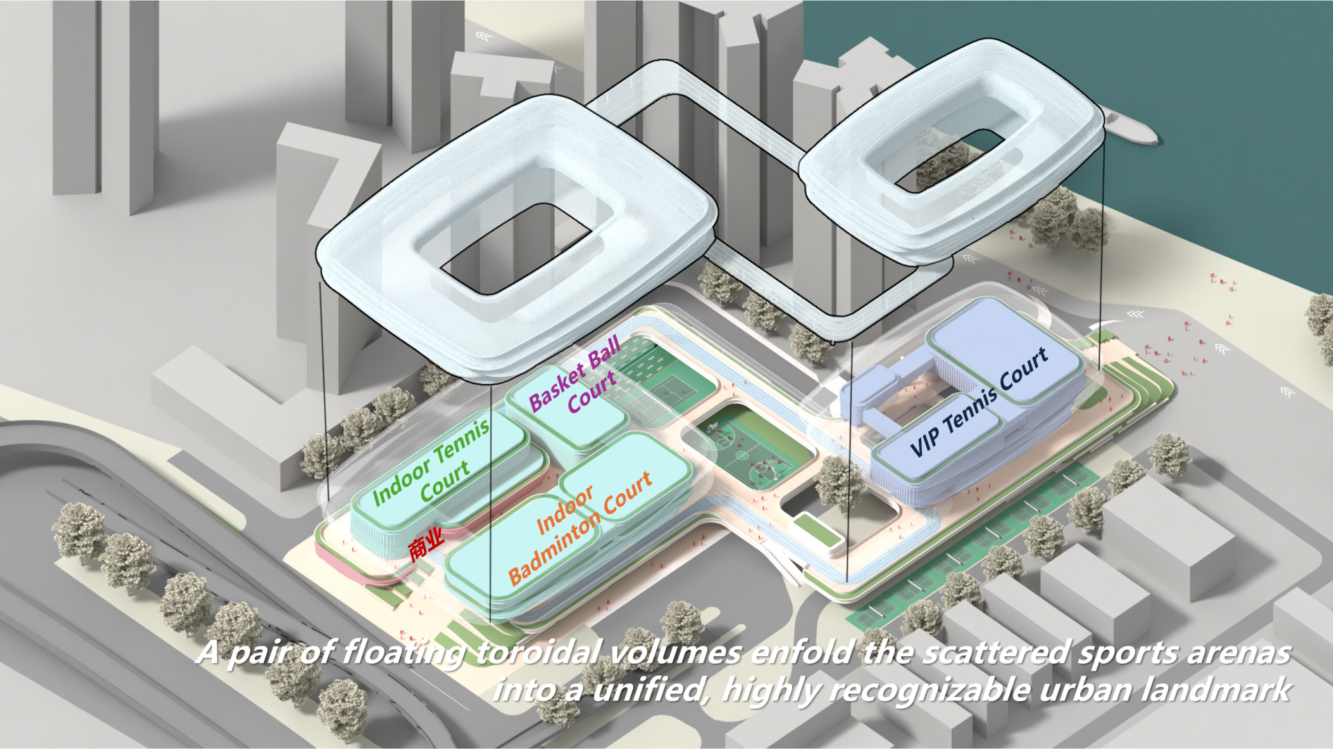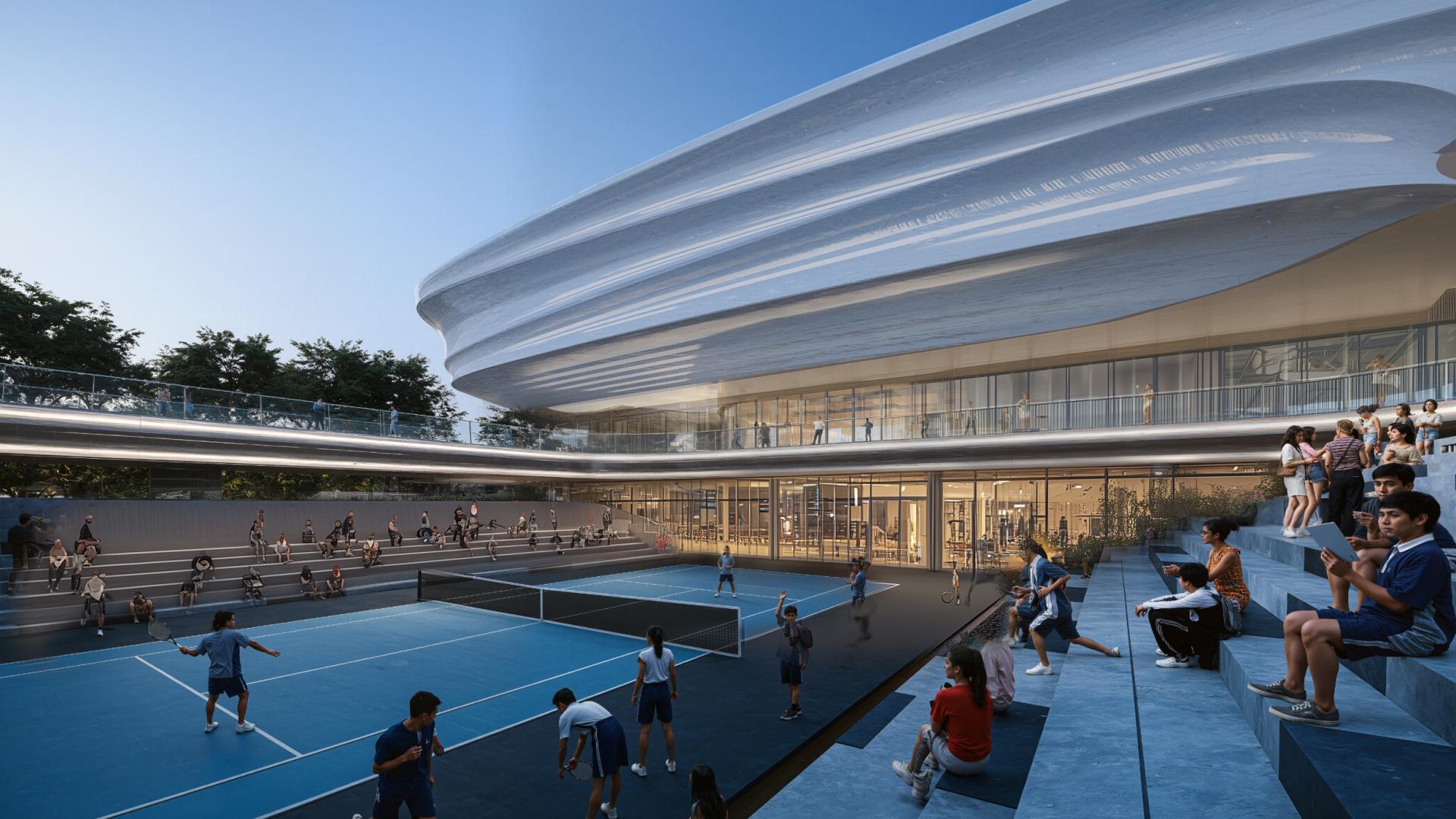 To change the local impression of a polluted, dark underground site, a new image of “lightness” and “purity” was introduced through cloud-like forms. Sustainable, lightweight white membrane cover the façade and roof over the sports fields. This “floating cloud” roof above a reflective water landscape, responses to the nearby Shenzhen River and Hong Kong wetlands, to craft an identity that is green, natural, and pristine. At night, the façade becomes an illuminated landmark capable of projecting sports imagery, transforming a once-isolated area into an engaging evening destination.