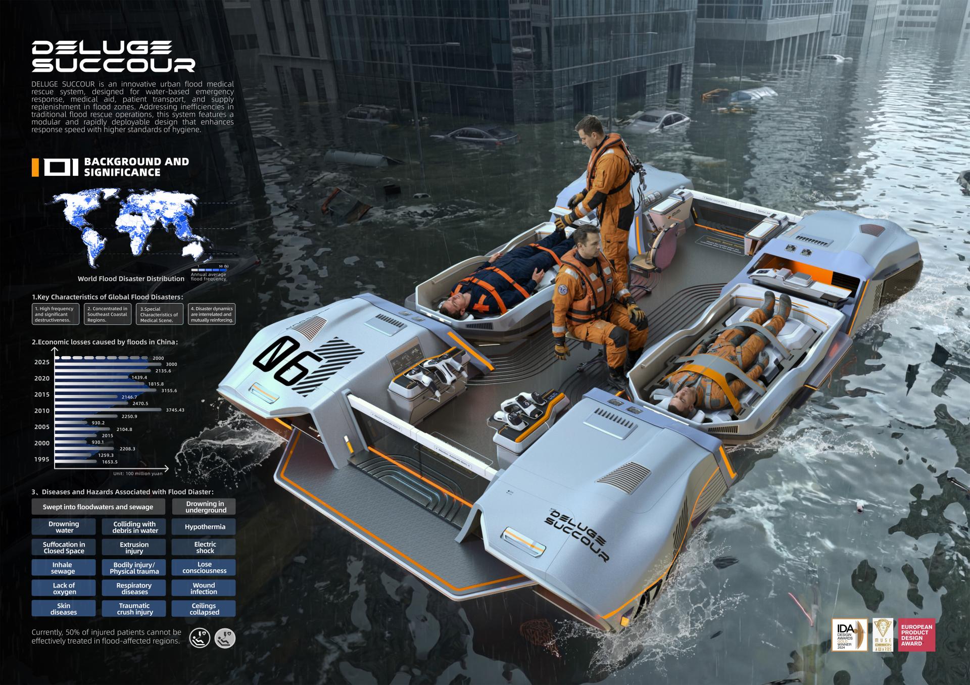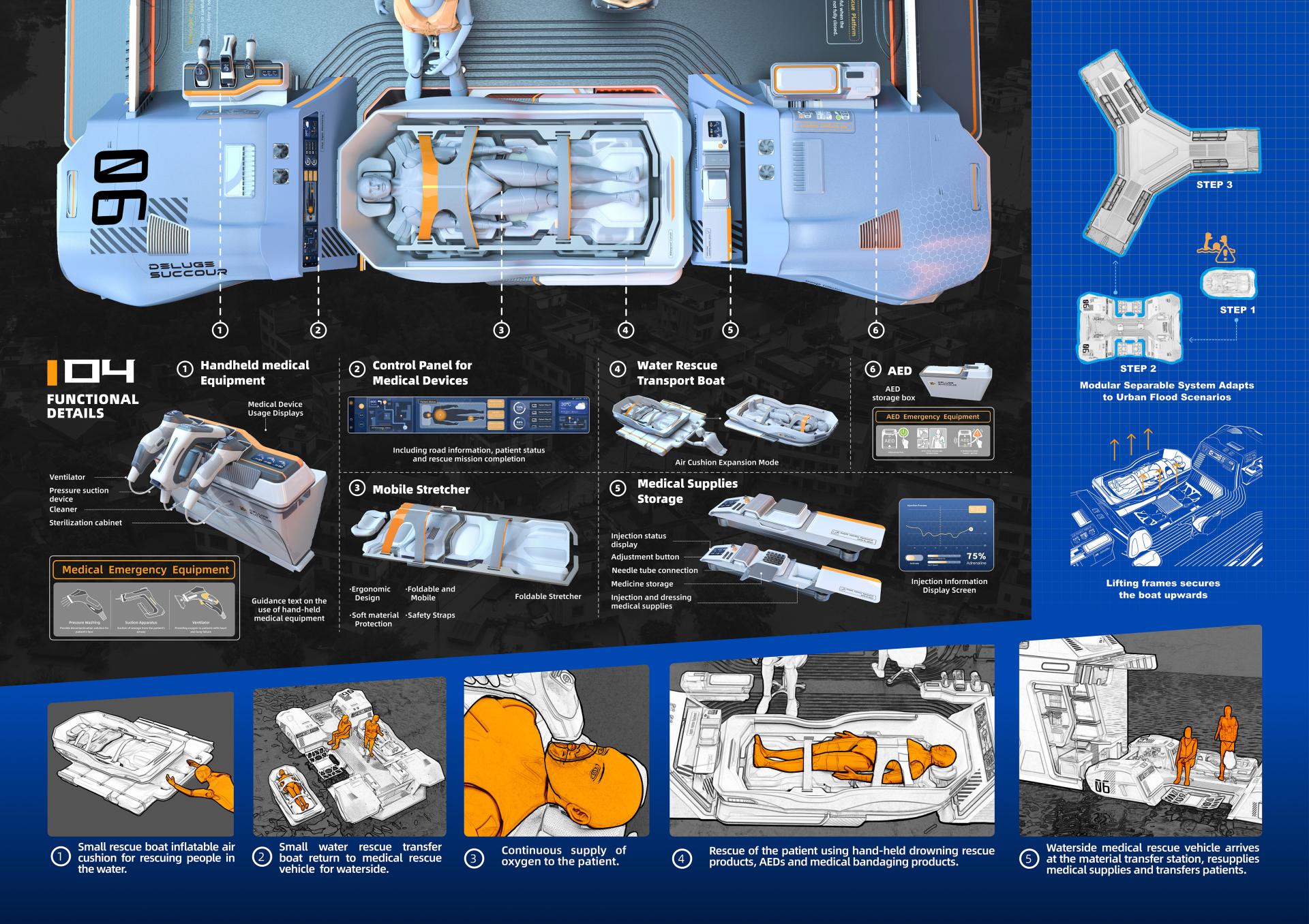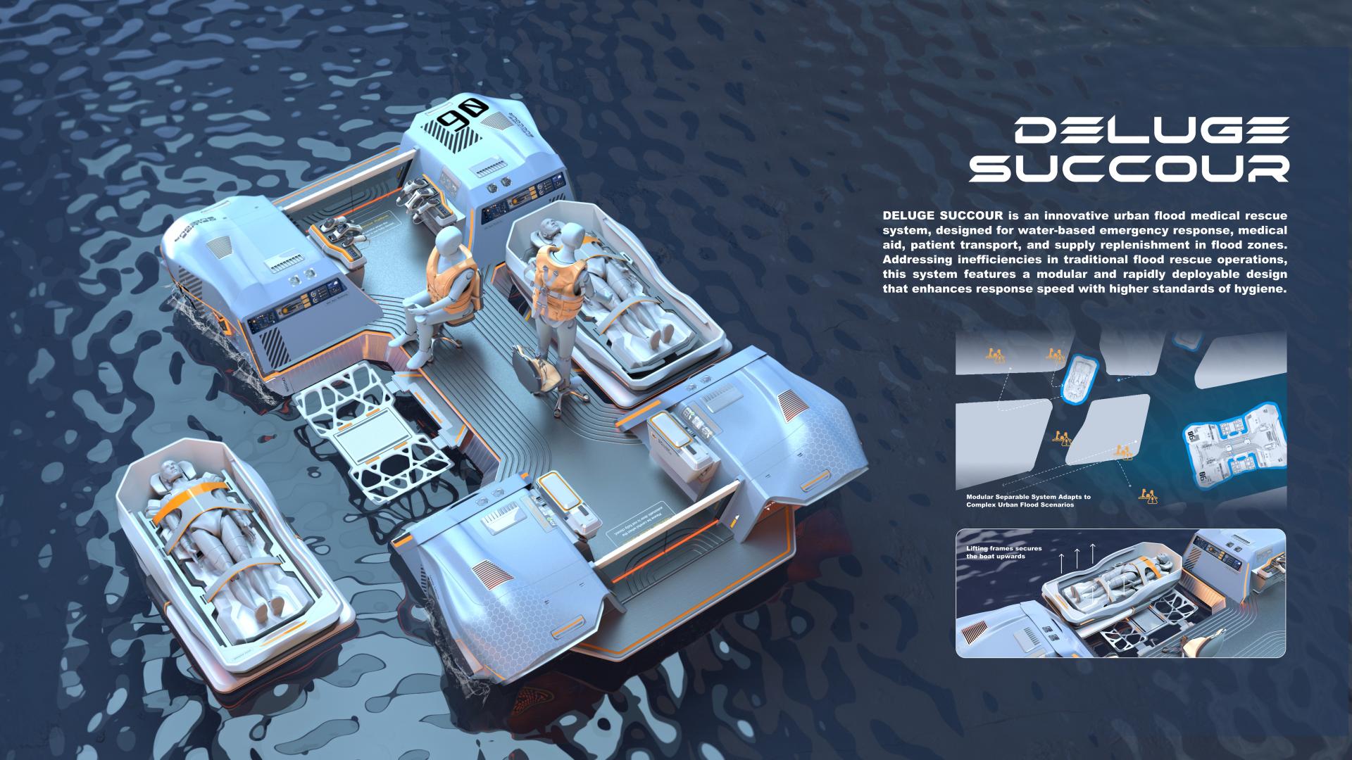 DELUGE SUCCOUR is an efficient medical rescue system specifically designed to address urban flood disasters. It includes three primary components: a waterborne medical rescue vessel, a small water rescue transfer boat, and a near-shore material transfer station. This system features a modular structure that can be adapted to various rescue scenarios by separating and combining as needed. It effectively supports the four critical phases of flood disaster response: water rescue, emergency medical treatment, personnel transfer, and supply replenishment.