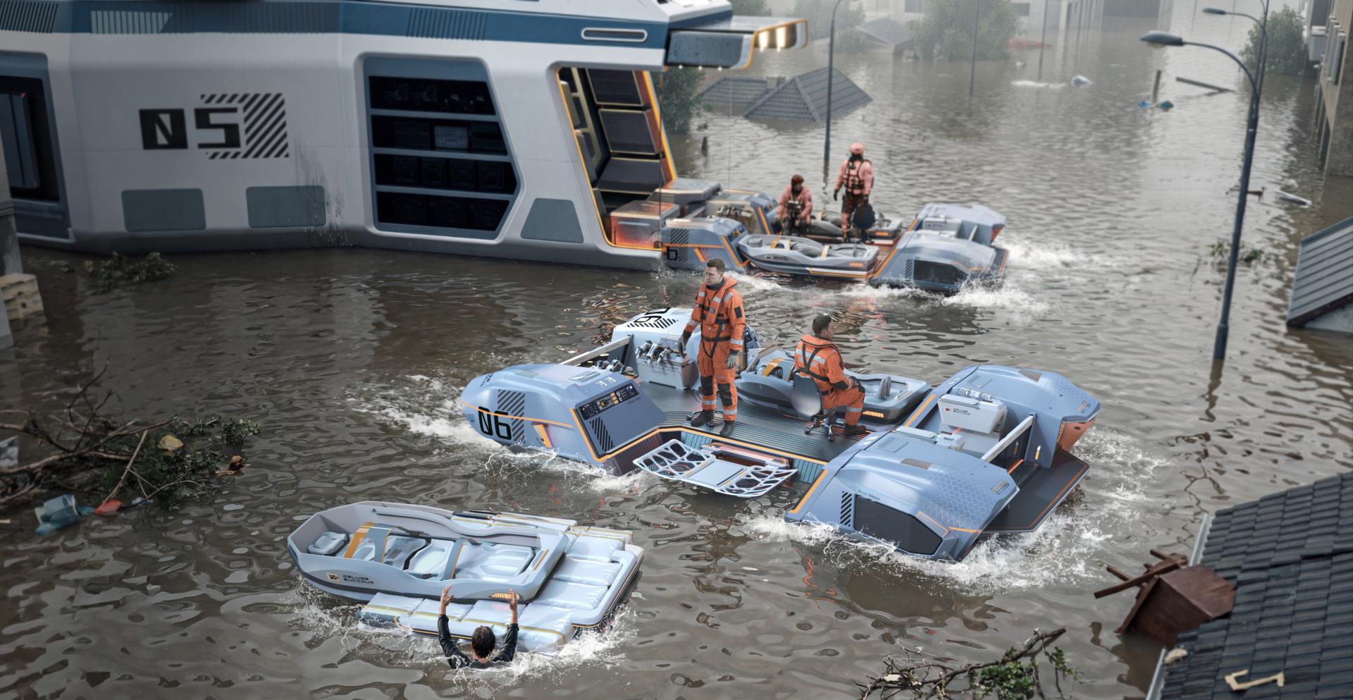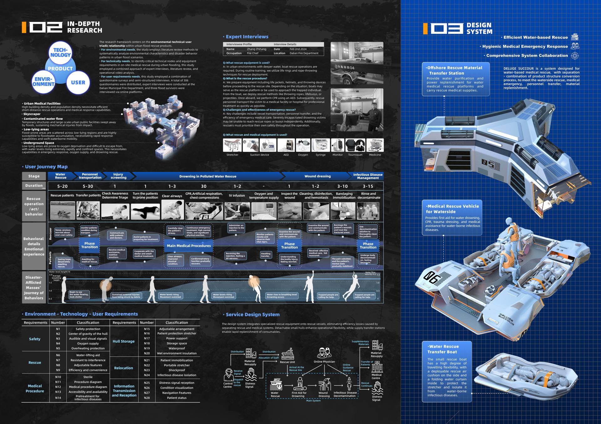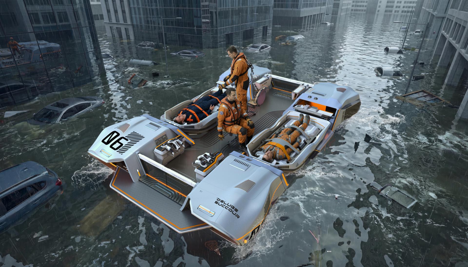 DELUGE SUCCOUR is an efficient medical rescue system specifically designed to address urban flood disasters. It includes three primary components: a waterborne medical rescue vessel, a small water rescue transfer boat, and a near-shore material transfer station. This system features a modular structure that can be adapted to various rescue scenarios by separating and combining as needed. It effectively supports the four critical phases of flood disaster response: water rescue, emergency medical treatment, personnel transfer, and supply replenishment.