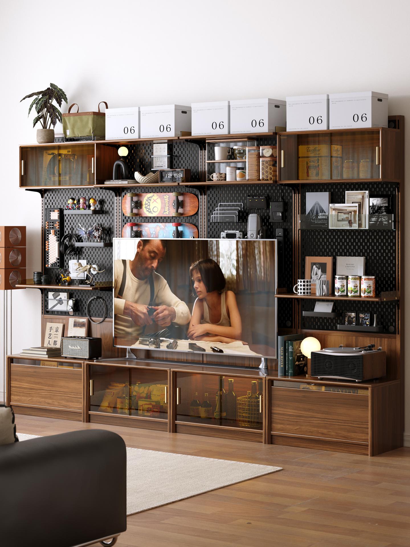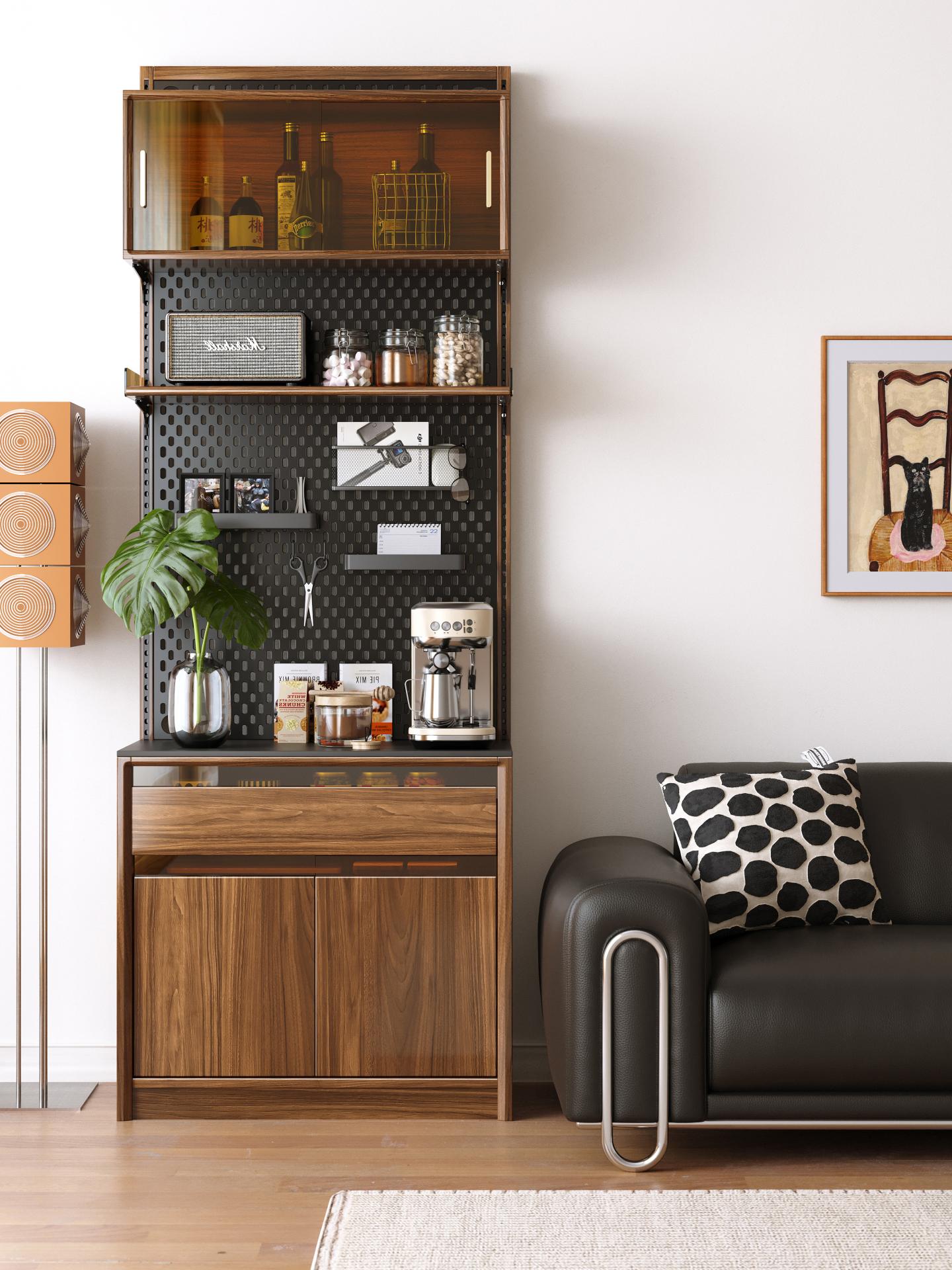 The cabinet body is crafted from walnut wood, selected for its natural anti-corrosion properties, high hardness, and stability. The surface undergoes multiple treatments with environmentally friendly nitrocellulose lacquer and plant-based wood wax oil. This forms an effective waterproof and stain-resistant protective layer while preserving the wood's warm and smooth texture. Furthermore, formaldehyde emissions are far below the national standard (<0.1mg/L), ensuring safety and environmental friendliness. The detachable solid wood base provides stable support and elevates the cabinet, aiding in moisture and dust prevention as well as daily cleaning. All edges and corners are smoothly rounded to prevent bumping hazards. The product integrates modular functionality, robust structure, and natural aesthetics, transforming storage from merely hiding items into a means of clear and organized display, and becoming a carrier that showcases personal interests and lifestyle attitudes.