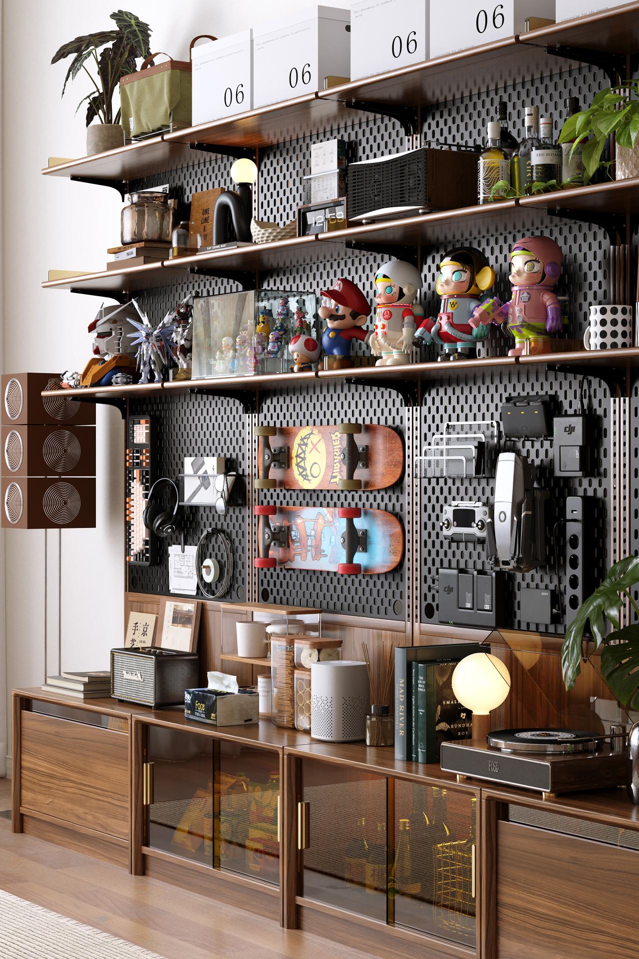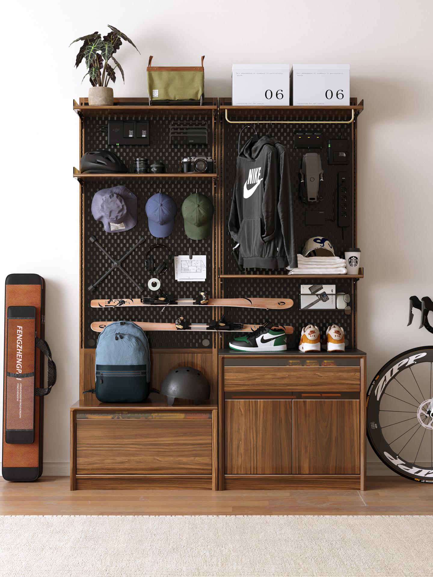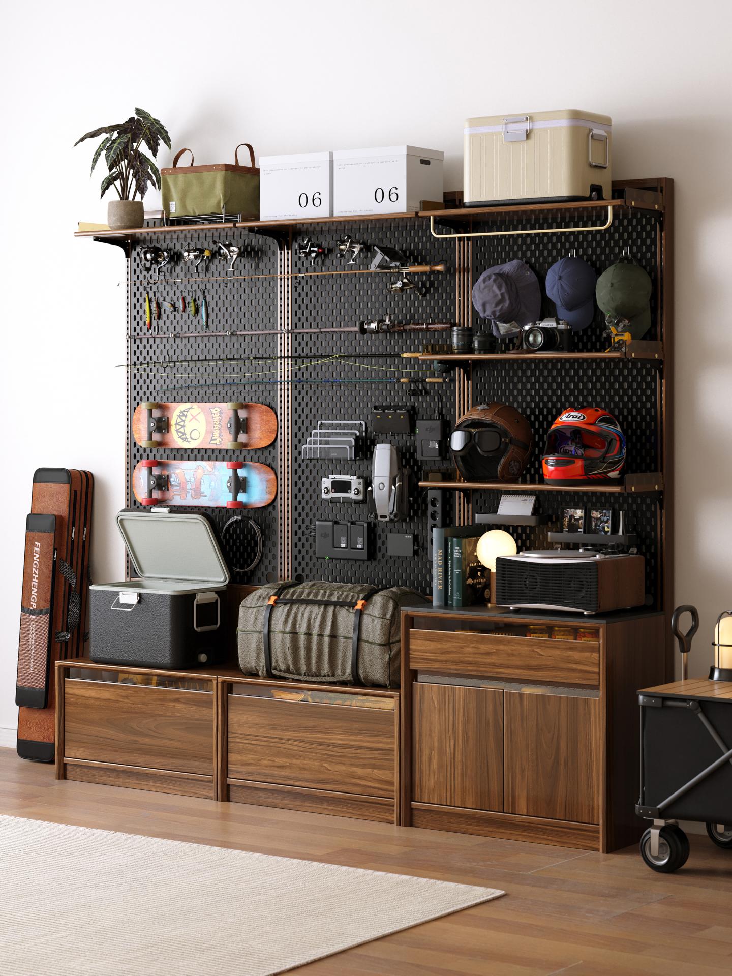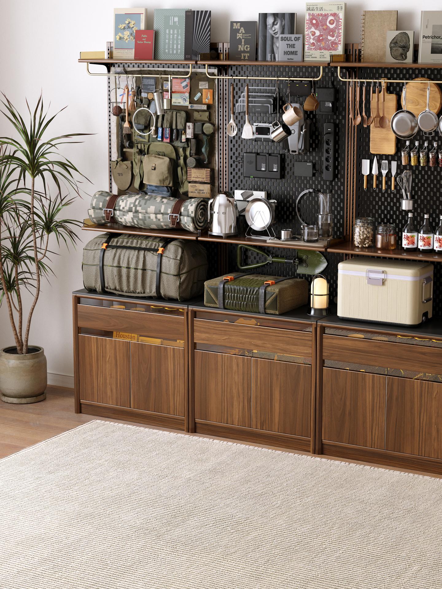 The Modular Wall System breaks through the limitation of traditional storage furniture which often serves a single purpose, and innovatively provides a highly modular and flexibly DIY professional integrated storage solution. It focuses on popular contemporary hobby scenarios such as camping, fishing, cycling, and fitness. Through a series of functional modules that can be freely combined, it addresses issues such as cluttered equipment, inconvenient access, low space utilization, difficulty in storing heavy-duty equipment, and insufficient specialized storage. For example, it configures a large-capacity main compartment for storing tents and hanging loops for cookware for outdoor scenarios, provides vertical rod-specific slots for fishing poles and moisture-proof bait drawers, and designs dedicated hanging rods for cycling jerseys and tool storage drawers for cycling enthusiasts. The robust 20mm solid wood structure can stably support heavy equipment like dumbbells, and enables vertical storage of large equipment such as exercise bikes, thereby efficiently saving floor space. This on-demand and multipurpose modular design allows users to flexibly build personalized equipment storage and display spaces according to their actual needs, much like building with blocks.