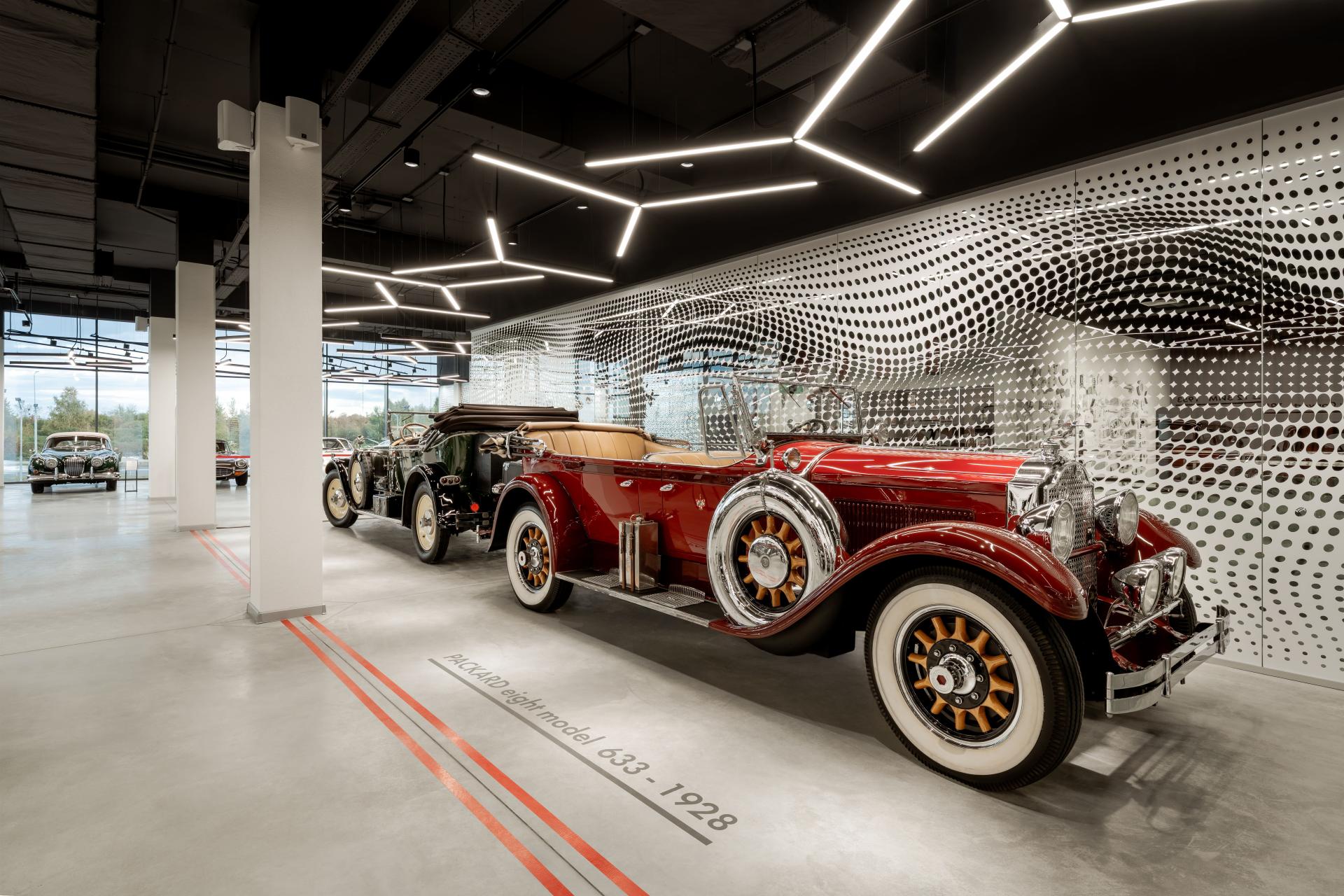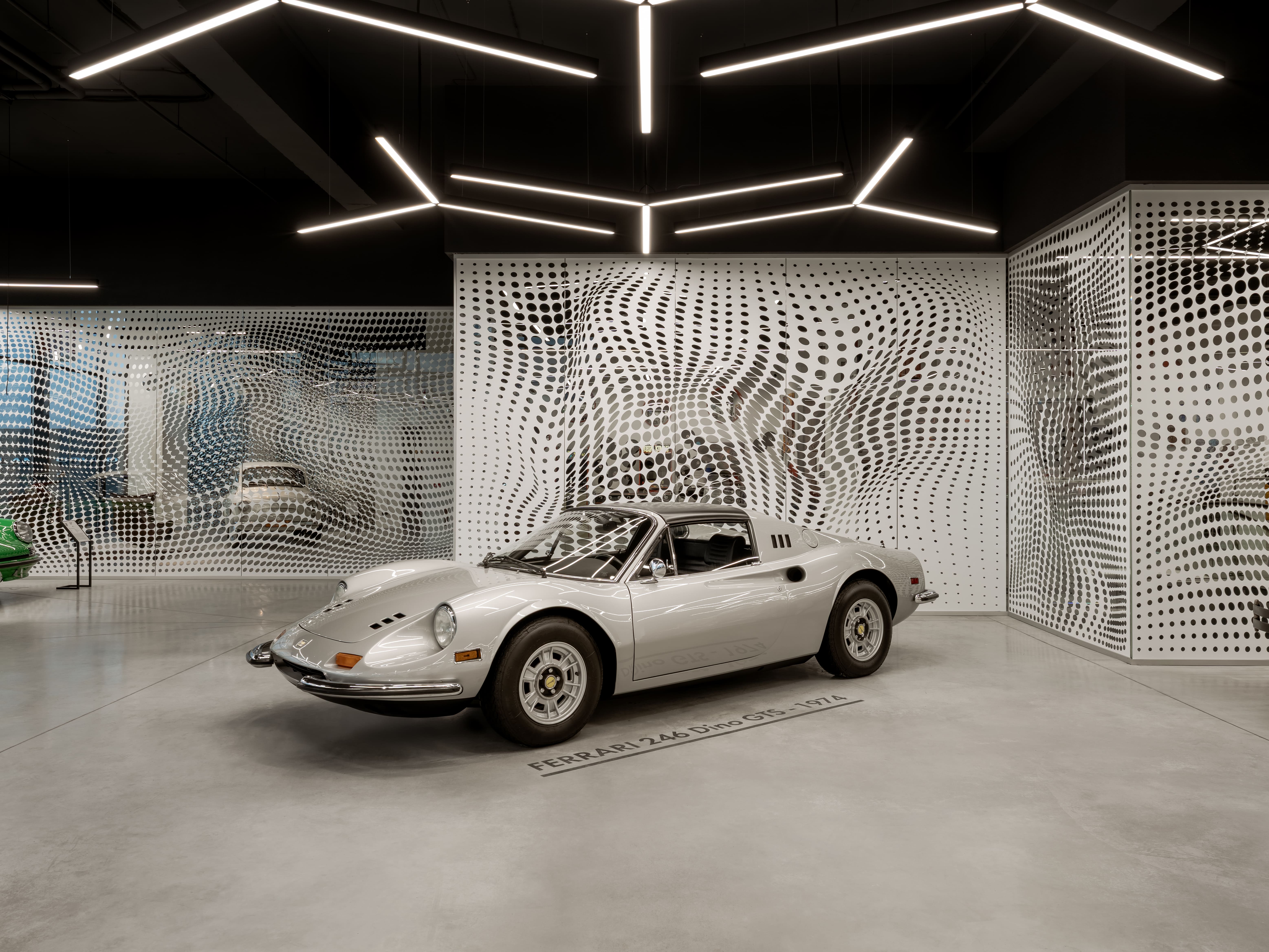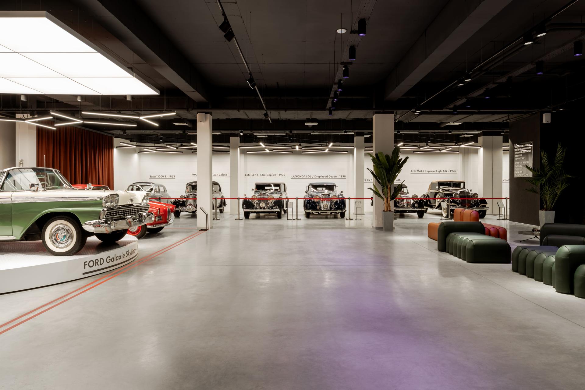 Light becomes the primary curatorial tool. Linear ceiling structures define circulation routes and create a rhythmic sequence of visual pauses. Carefully calibrated illumination interacts with bodywork, chrome details, and surface finishes, producing a cinematic perception without theatrical excess. Each car is granted its own moment of focus, clarity, and silence.