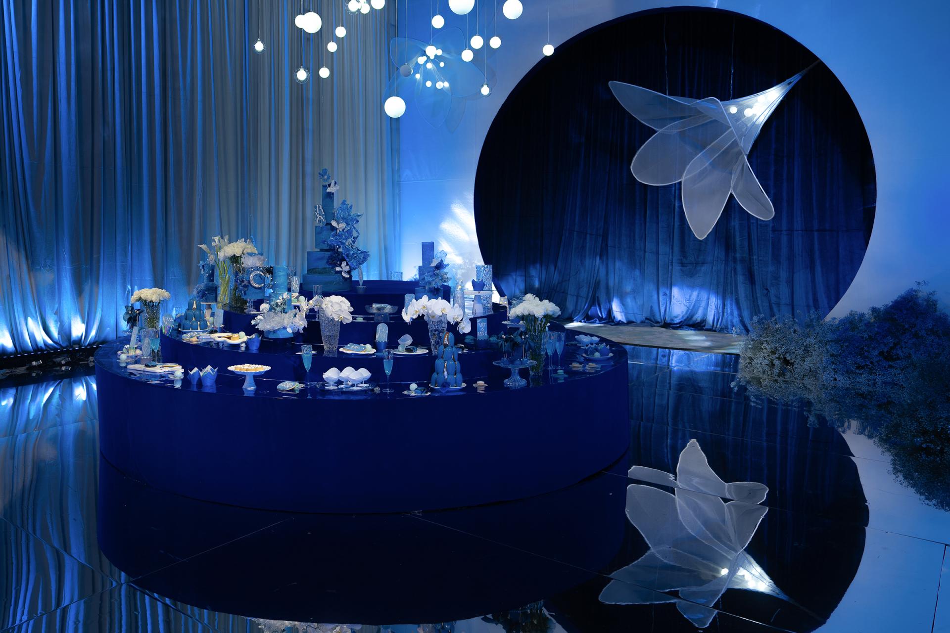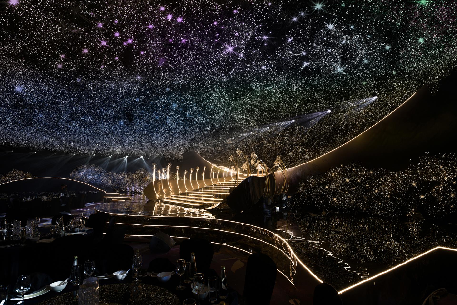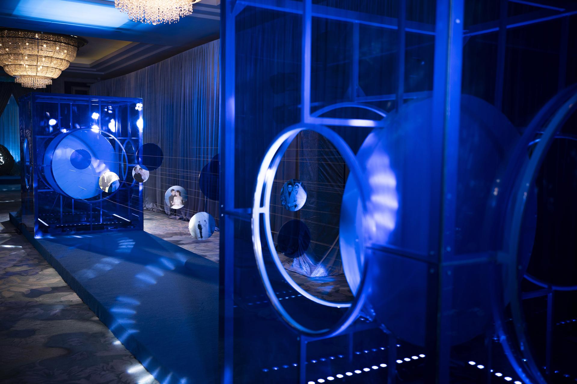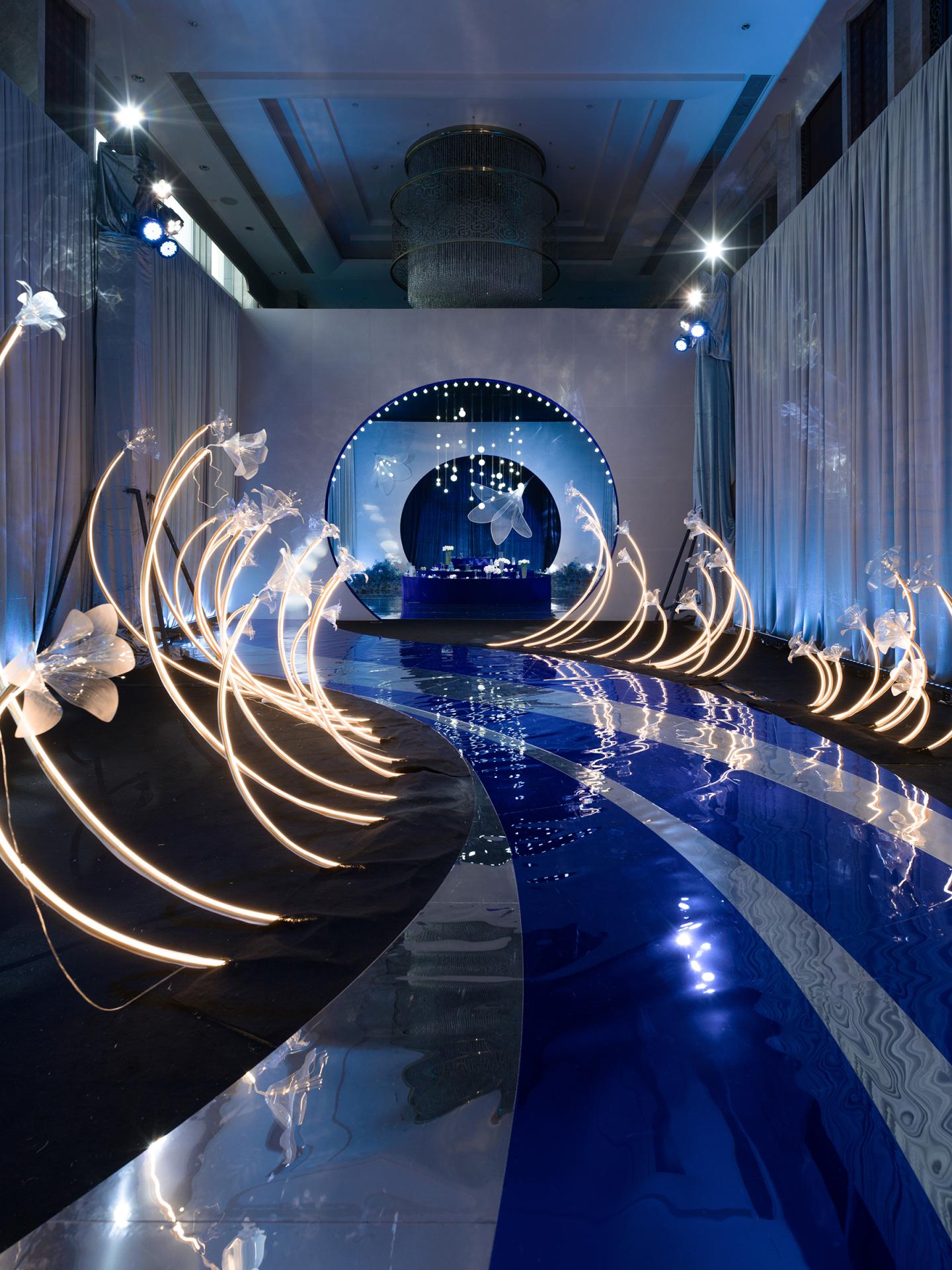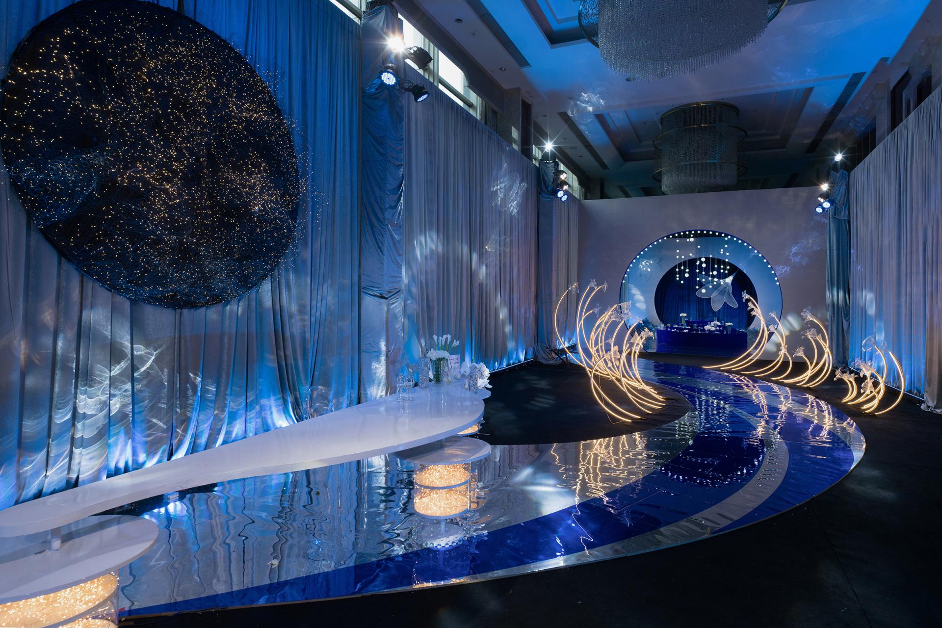 Taking “the vast galaxy” as its central theme, the design breaks away from the conventional linear runway and instead introduces a custom-shaped, flowing layout that responds to the curved architecture of the hall. The stepped stage is conceived as a metaphorical “embrace,” while layered starry lights and transformable nebula effects create a fully immersive cosmic atmosphere. In the welcome area, neo-Chinese aesthetics are blended with Klein blue and moon motifs, using a cosmic color palette to symbolize the passage of time and the eternity of love, achieving a balance between cultural expression and contemporary visual language.