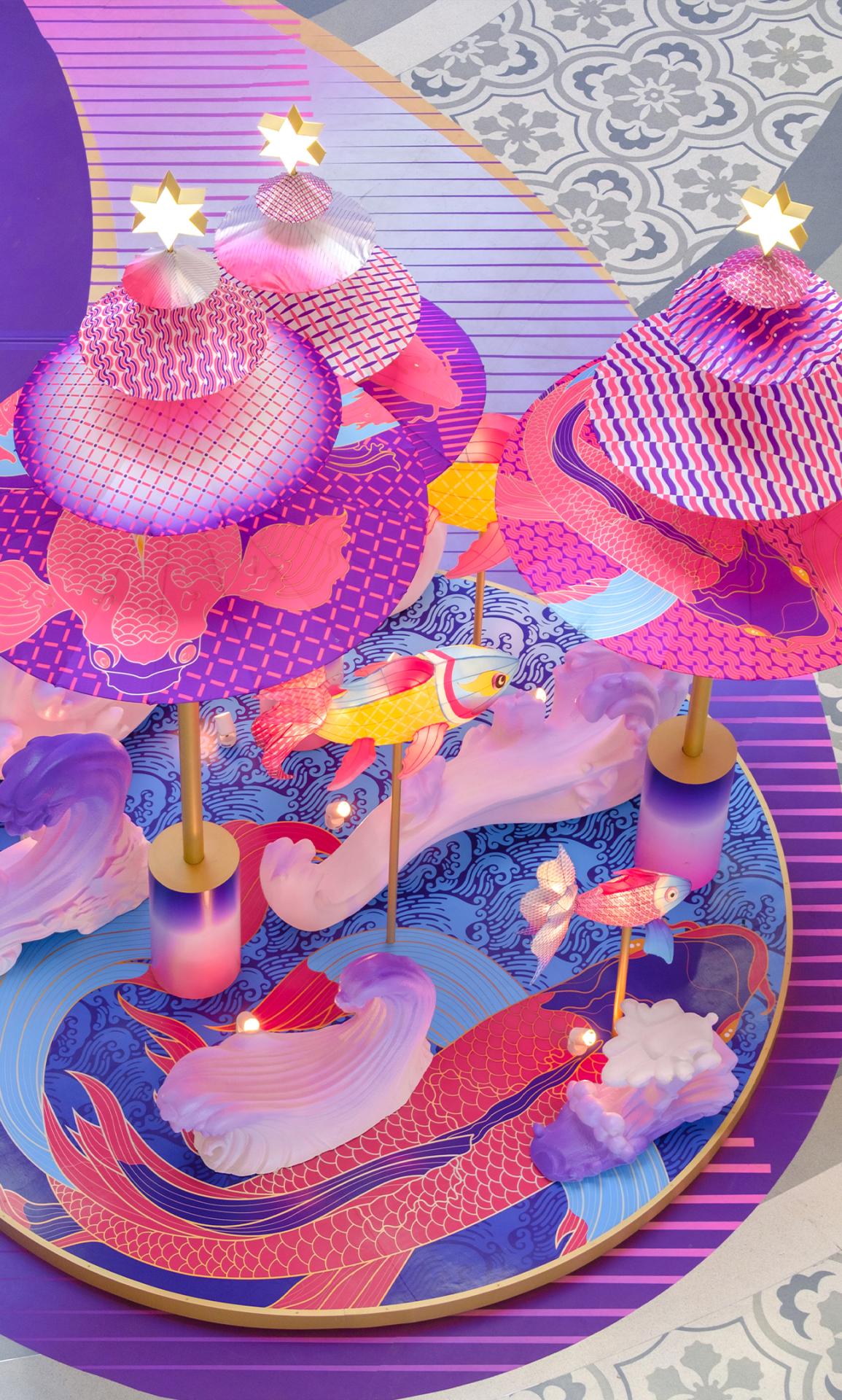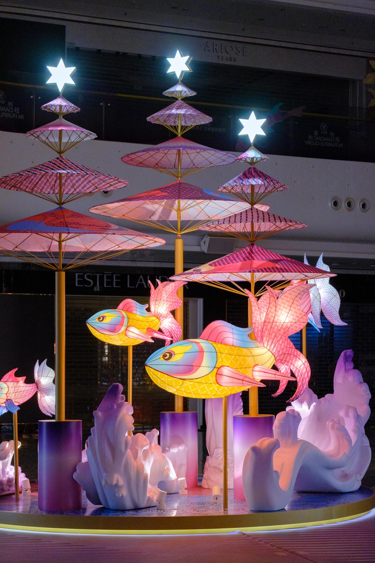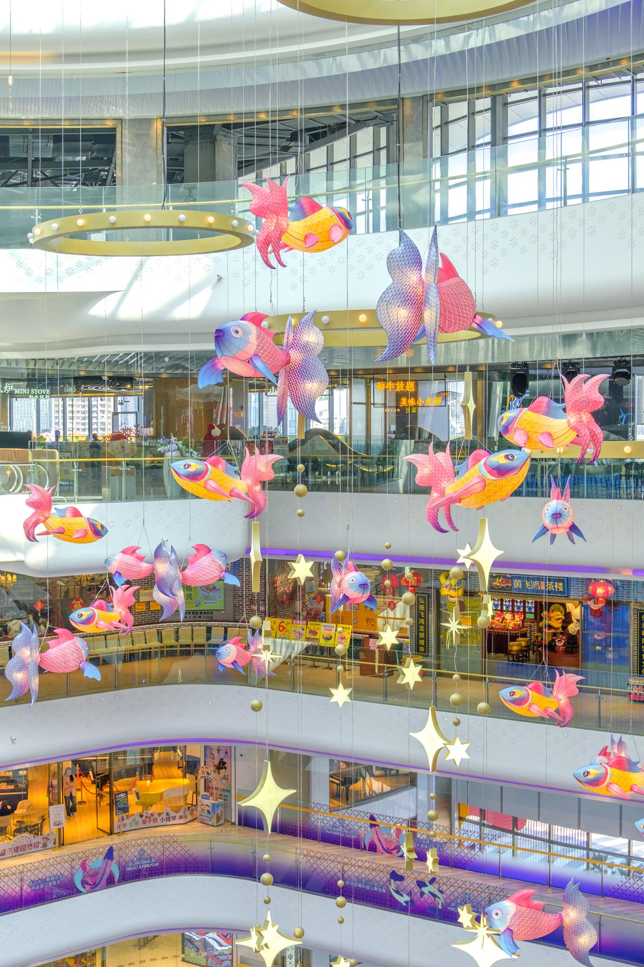 The design transforms this traditional craft into a large-scale contemporary installation by constructing a 30-meter-high vertical spatial structure within a commercial atrium. More than one thousand handcrafted fish lanterns, produced using traditional techniques, are suspended and assembled throughout the vertical space, forming a dynamic, immersive environment. The lanterns are arranged to suggest upward movement and fluidity, allowing visitors to experience the work through walking, viewing, and looking upward, rather than passive observation.