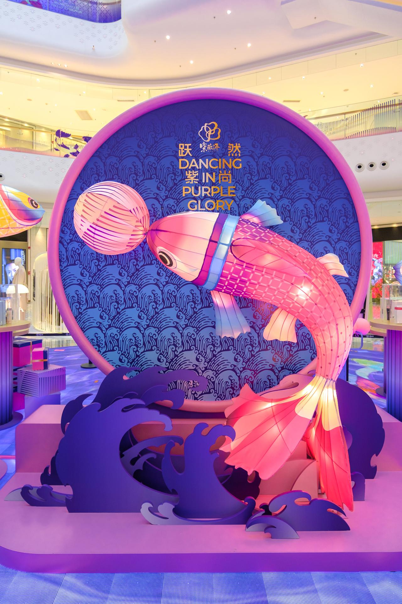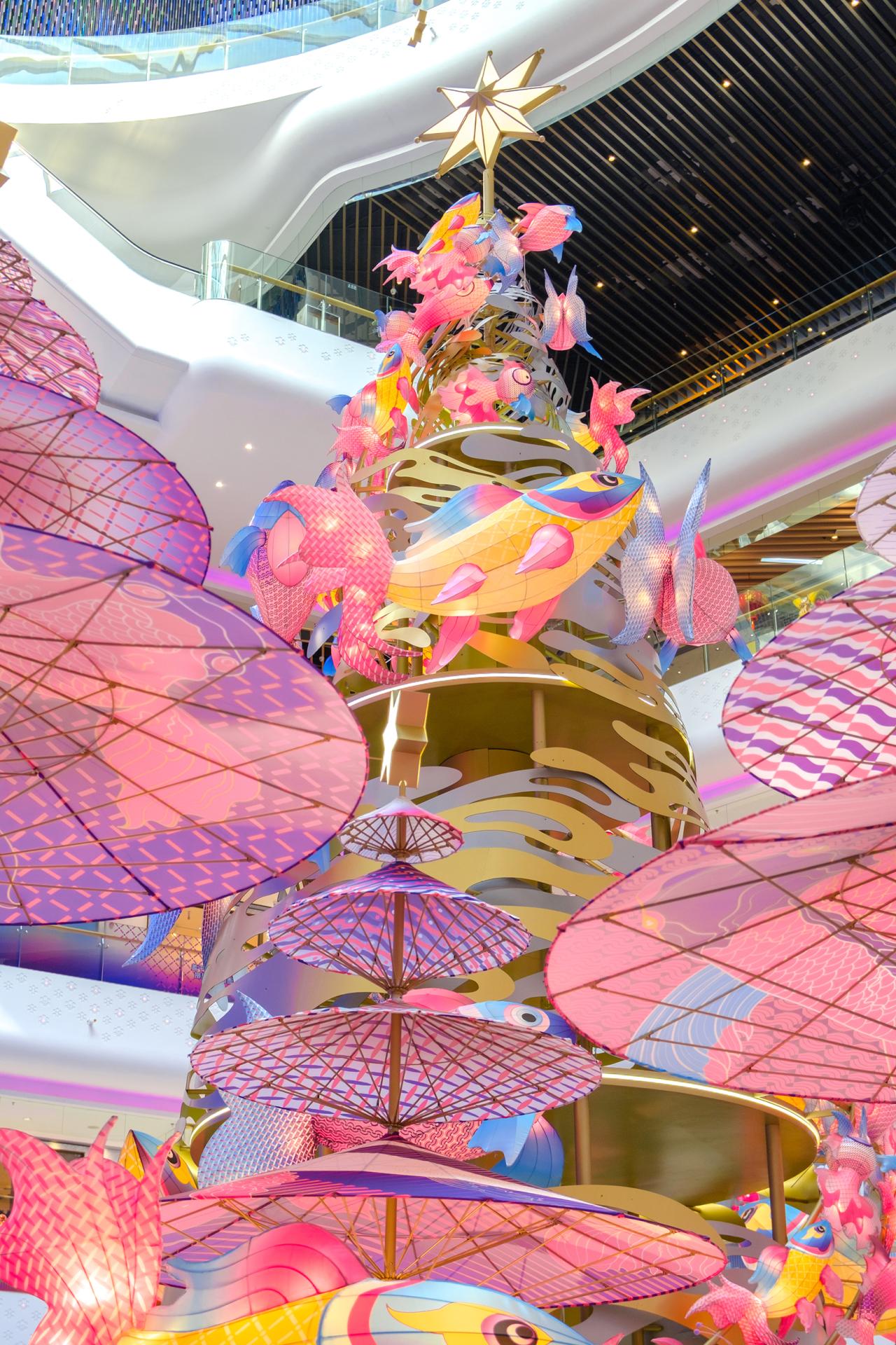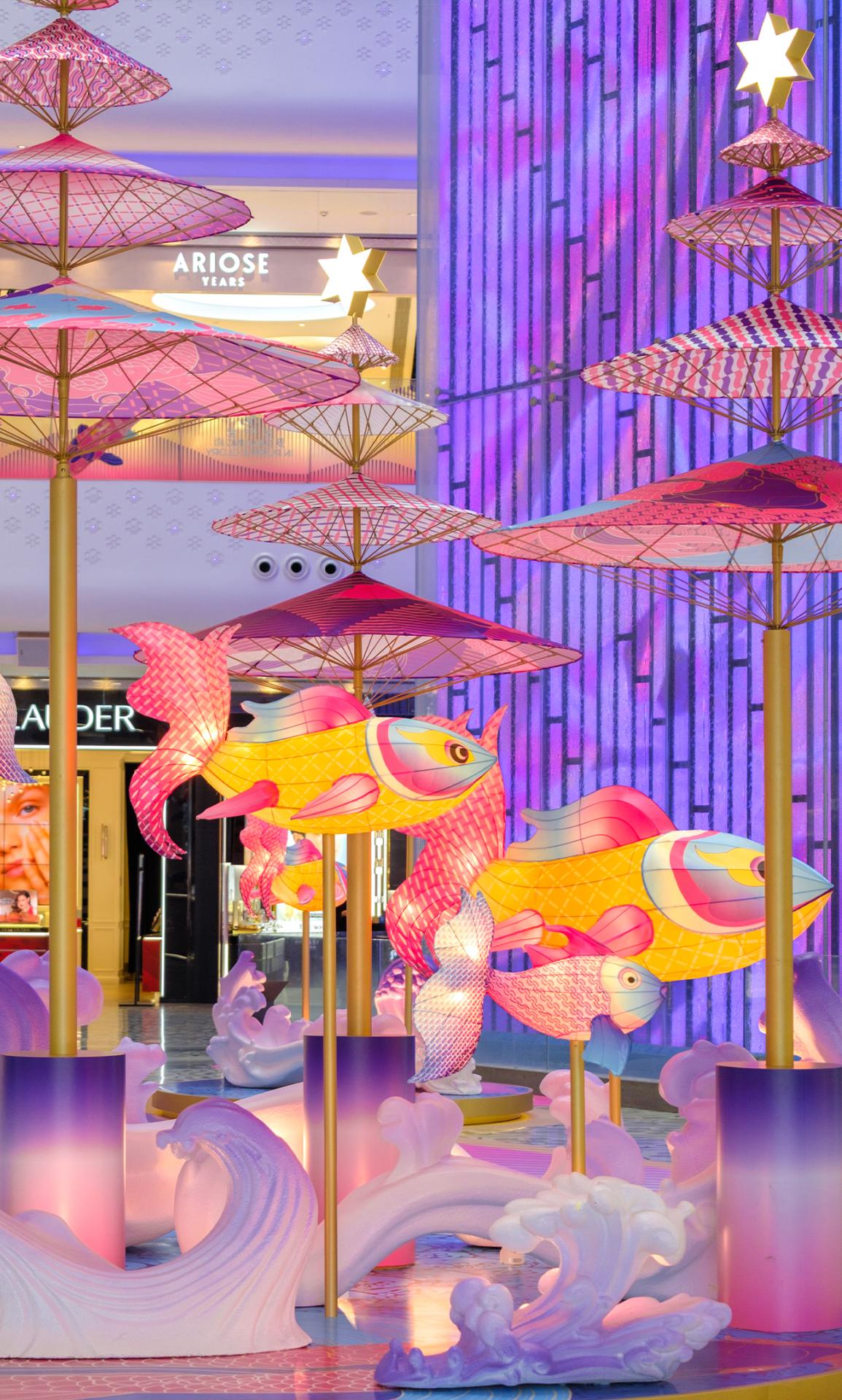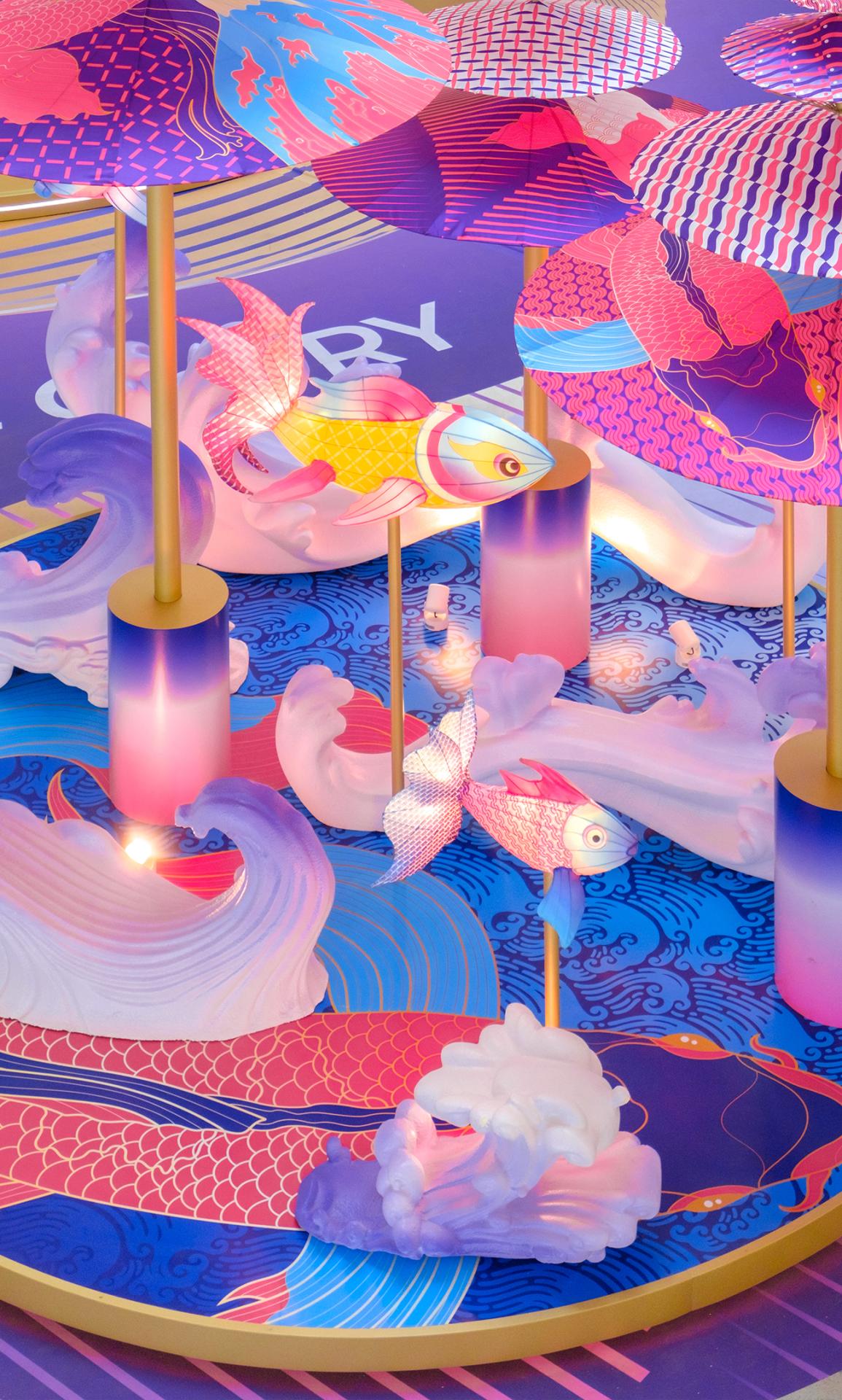 The design transforms this traditional craft into a large-scale contemporary installation by constructing a 30-meter-high vertical spatial structure within a commercial atrium. More than one thousand handcrafted fish lanterns, produced using traditional techniques, are suspended and assembled throughout the vertical space, forming a dynamic, immersive environment. The lanterns are arranged to suggest upward movement and fluidity, allowing visitors to experience the work through walking, viewing, and looking upward, rather than passive observation.