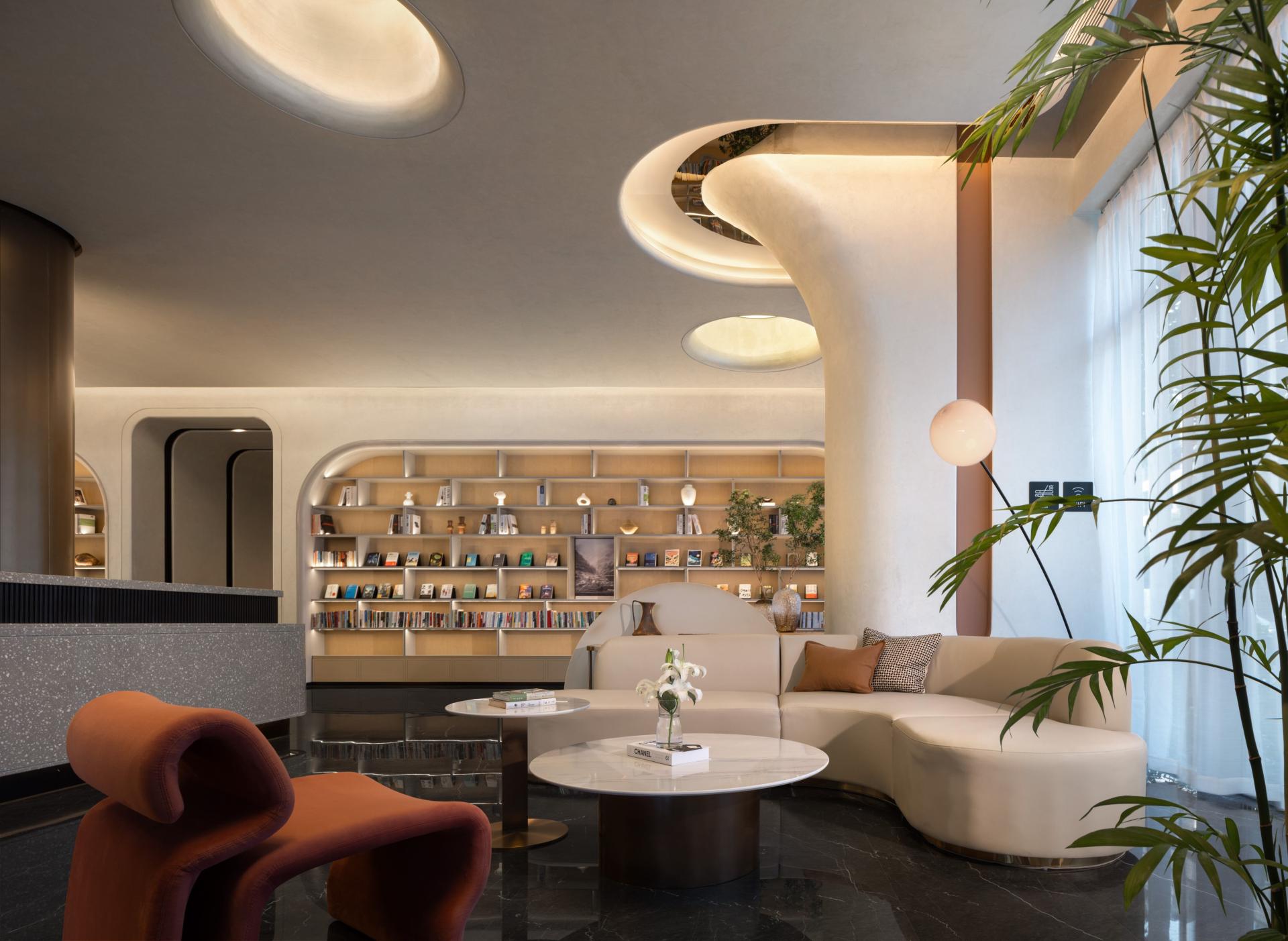 Step inside, and the energy shifts. The lobby blends soft off-whites with natural greenery and gentle curves, creating an immediate sense of calm. Two pathways guide your journey: one for quick check-ins, another leading to the book bar—a bright, inviting space where light draws people together naturally, reviving the simple joy of real conversation.