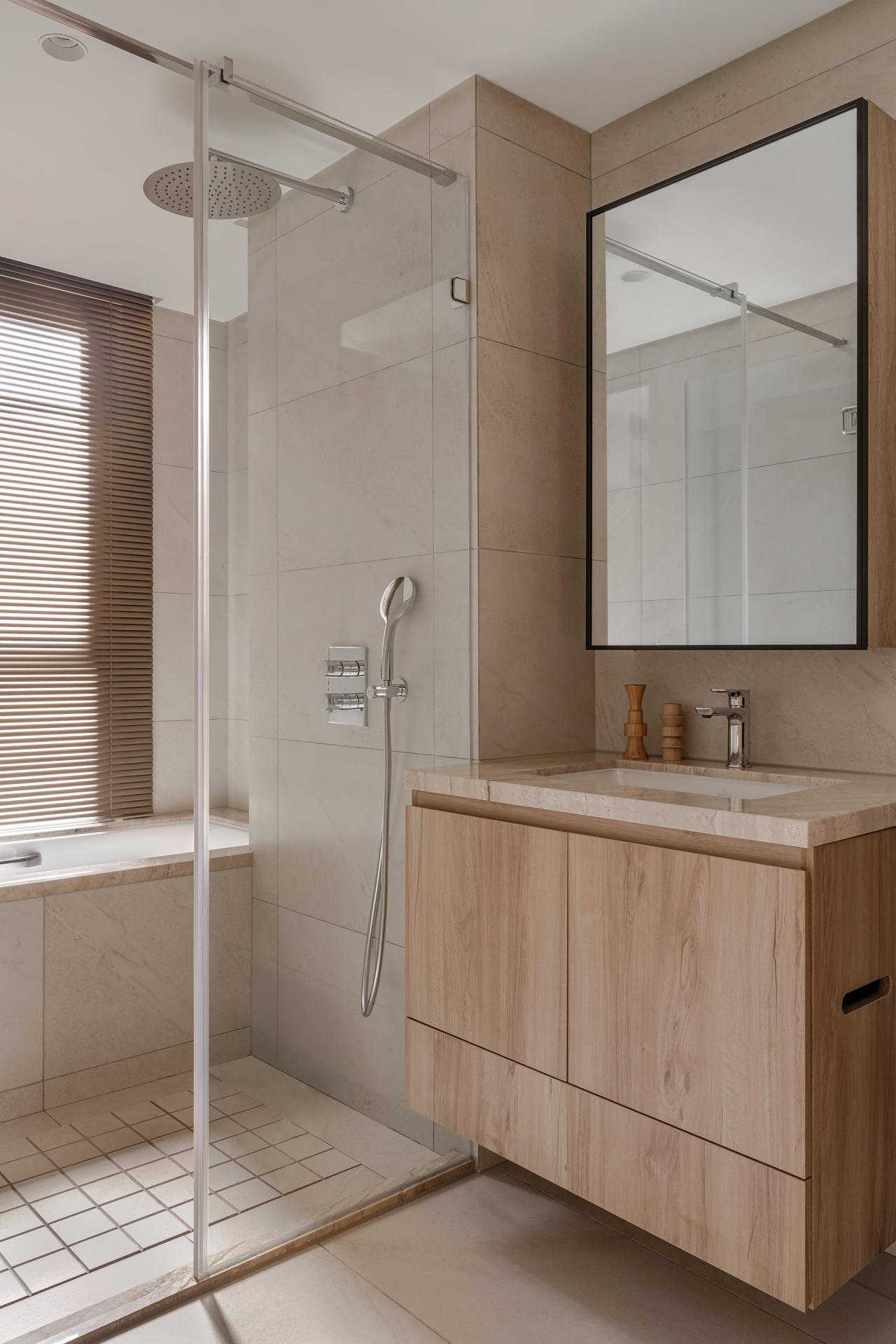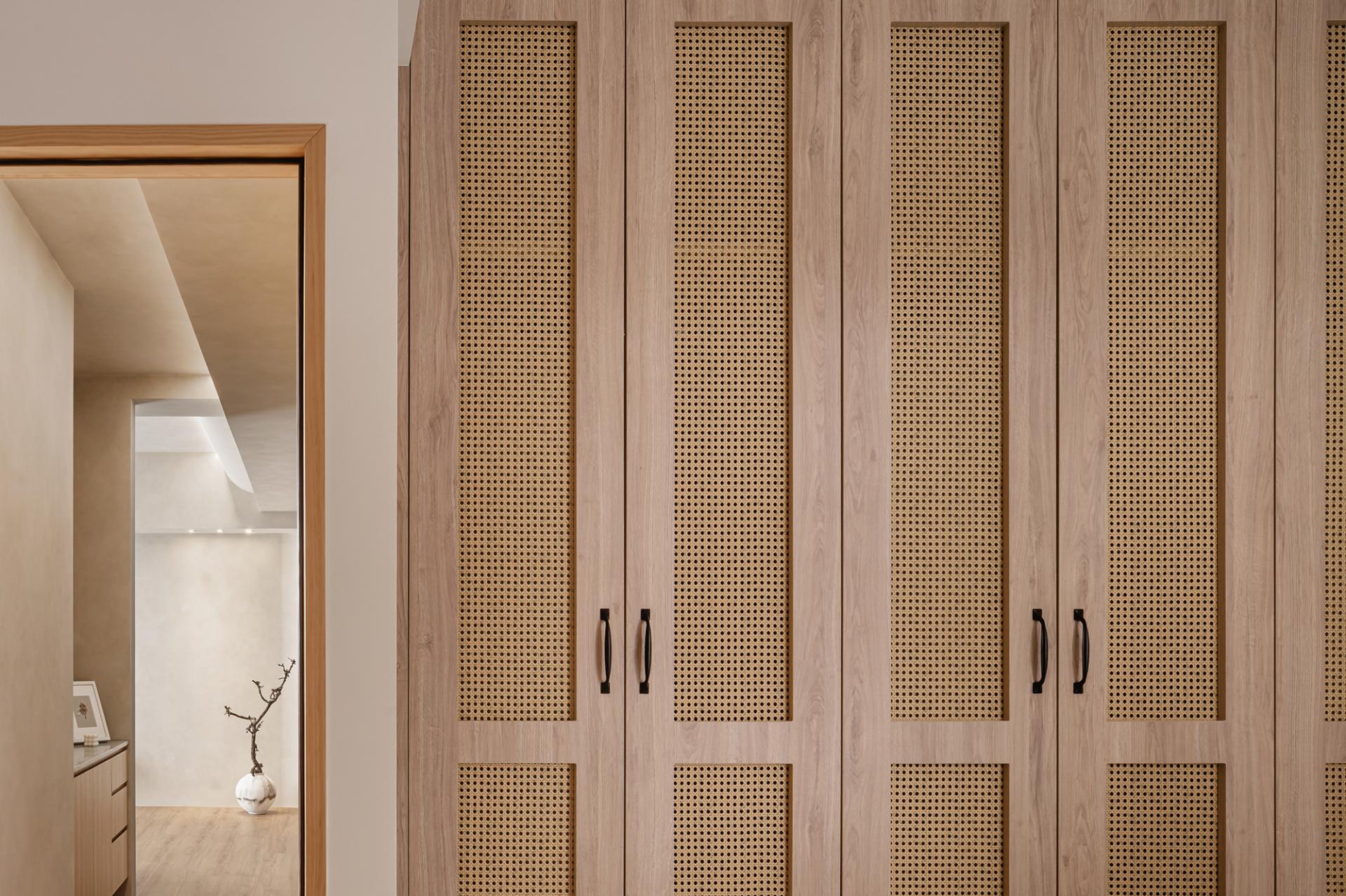As one steps into the foyer, their attention is immediately captured by the stunning silver-veined glass, elegantly framed by gold aluminum, which creates a striking initial visual impact. The space is further enhanced by a low wooden cabinet with graceful, curved edges, seamlessly transitioning between the interior and exterior realms. This thoughtful design not only adds warmth but also elevates the overall aesthetic. Moreover, the shoe area is artfully delineated by frosted glass panels that interact beautifully with light, showcasing two distinct textures that produce mesmerizing layered refractions. This enchanting display fosters a misty ambiance, establishing a serene buffer that invites the bustle of daily life.