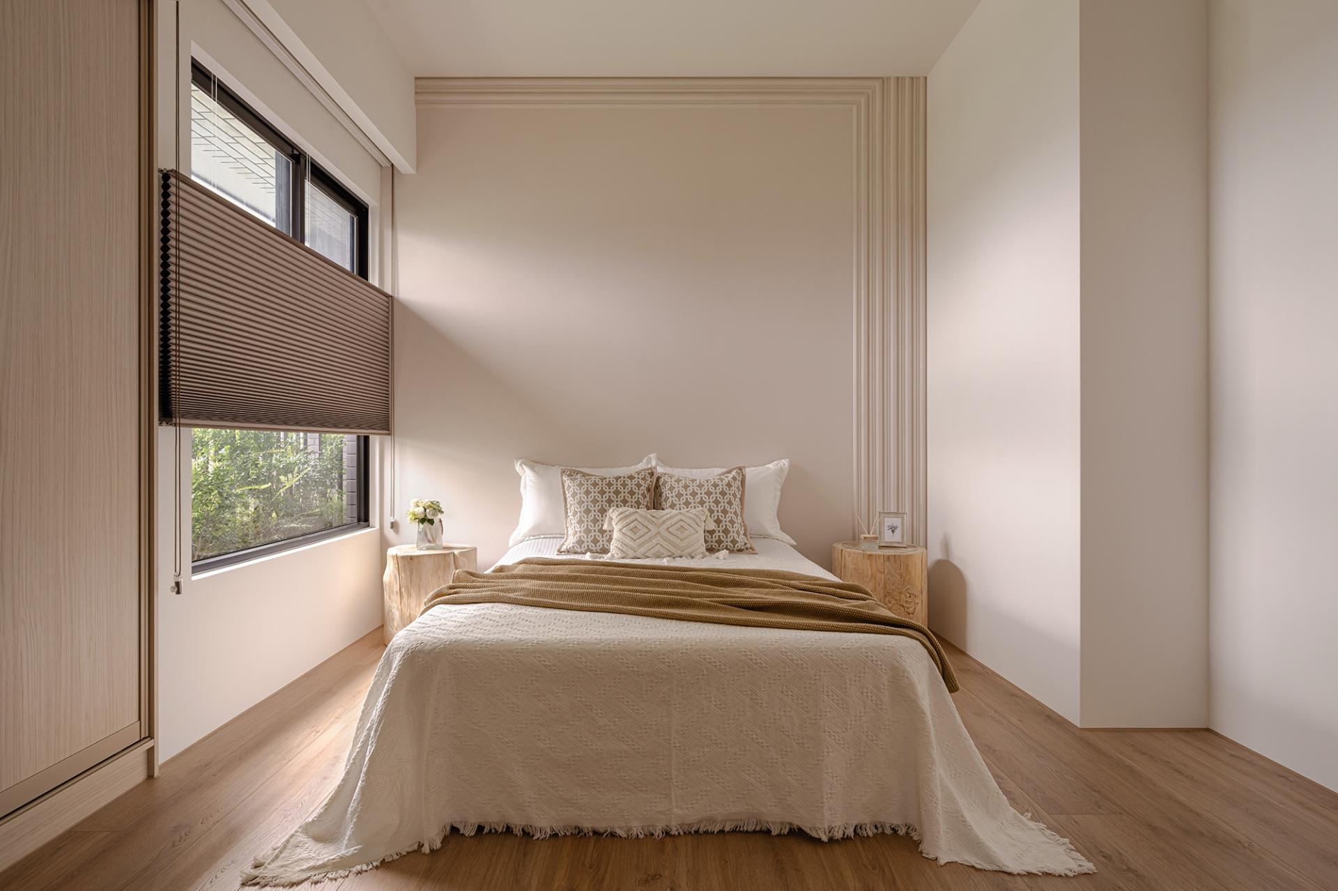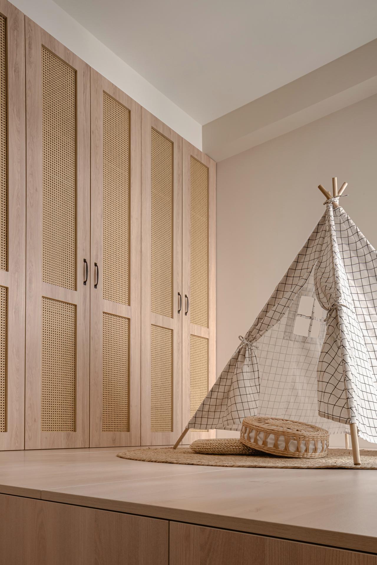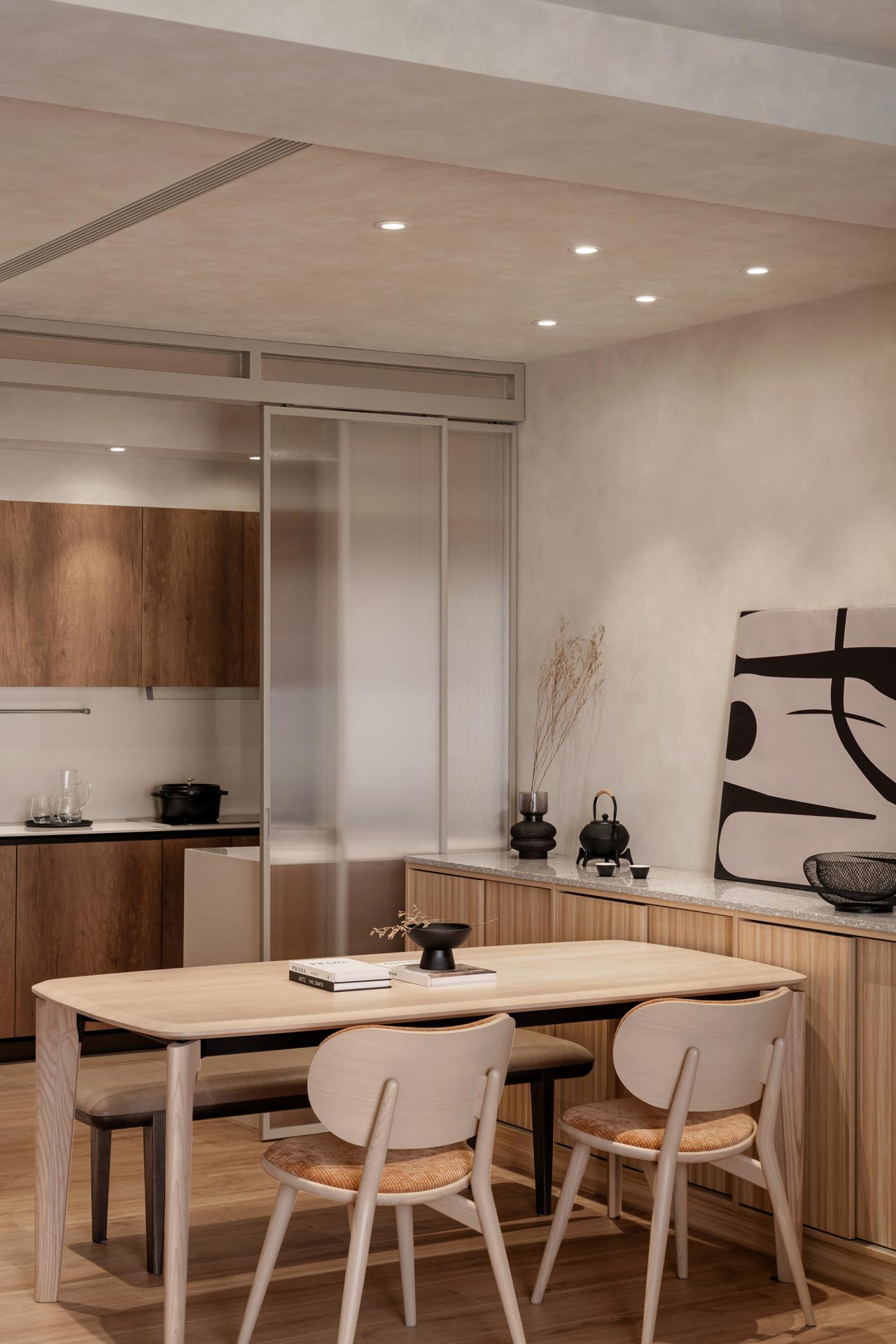 As guests move into the public area, they will be greeted by walls adorned with artistic coatings that reveal an array of intricate textures, particularly as the light shifts throughout the day. This captivating feature lends remarkable depth to the negative space, enriching the overall experience. Additionally, the kitchen is cleverly separated by a sleek glass sliding door, allowing for uninterrupted sightlines and an abundance of natural light to flow freely. This design choice not only reinforces the cohesive aesthetic throughout the home but also enhances the sense of openness and connectivity between the spaces. Furthermore, the cabinetry and desks reflect a consistent language of light wood tones, which enhance the room’s cohesive flow.