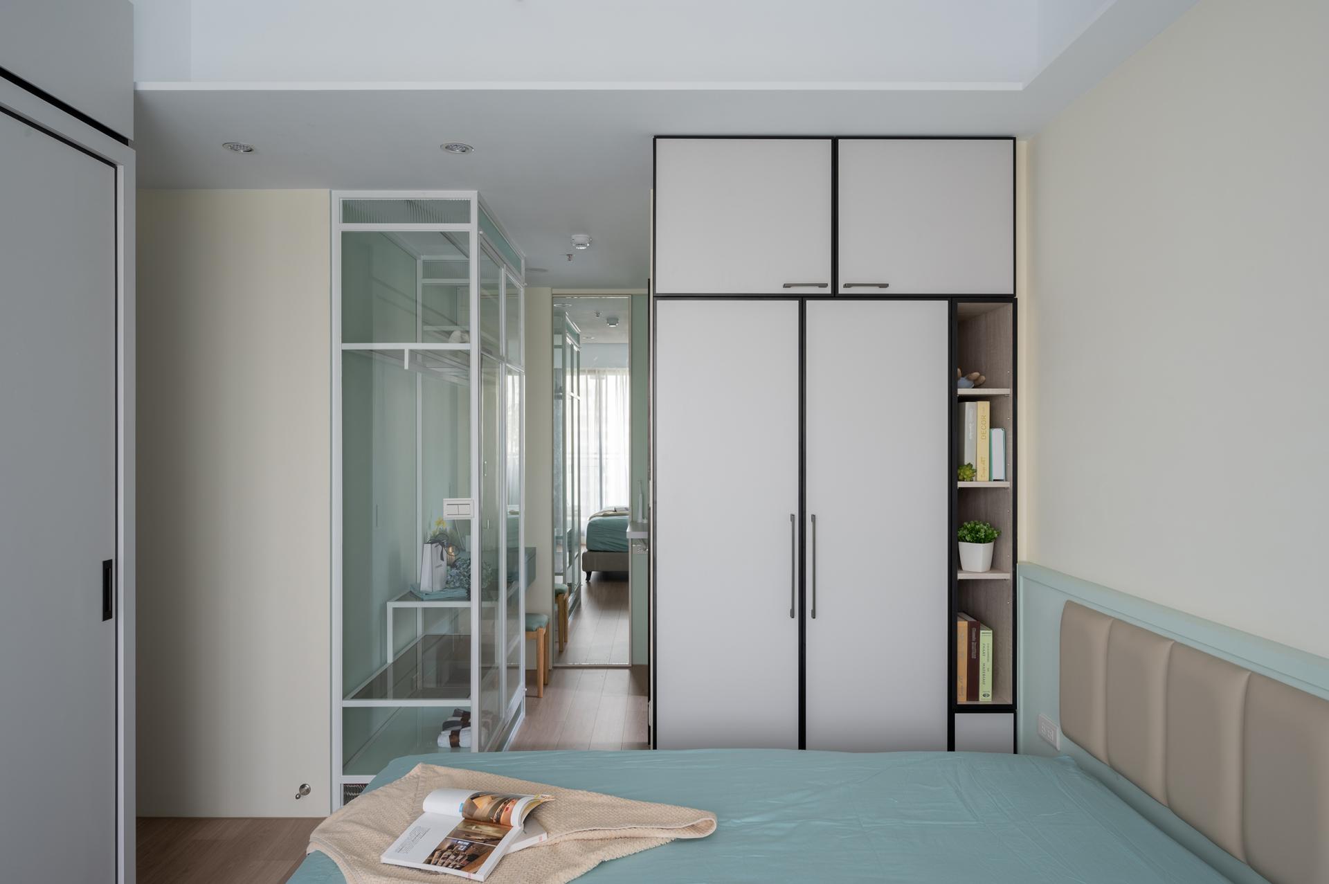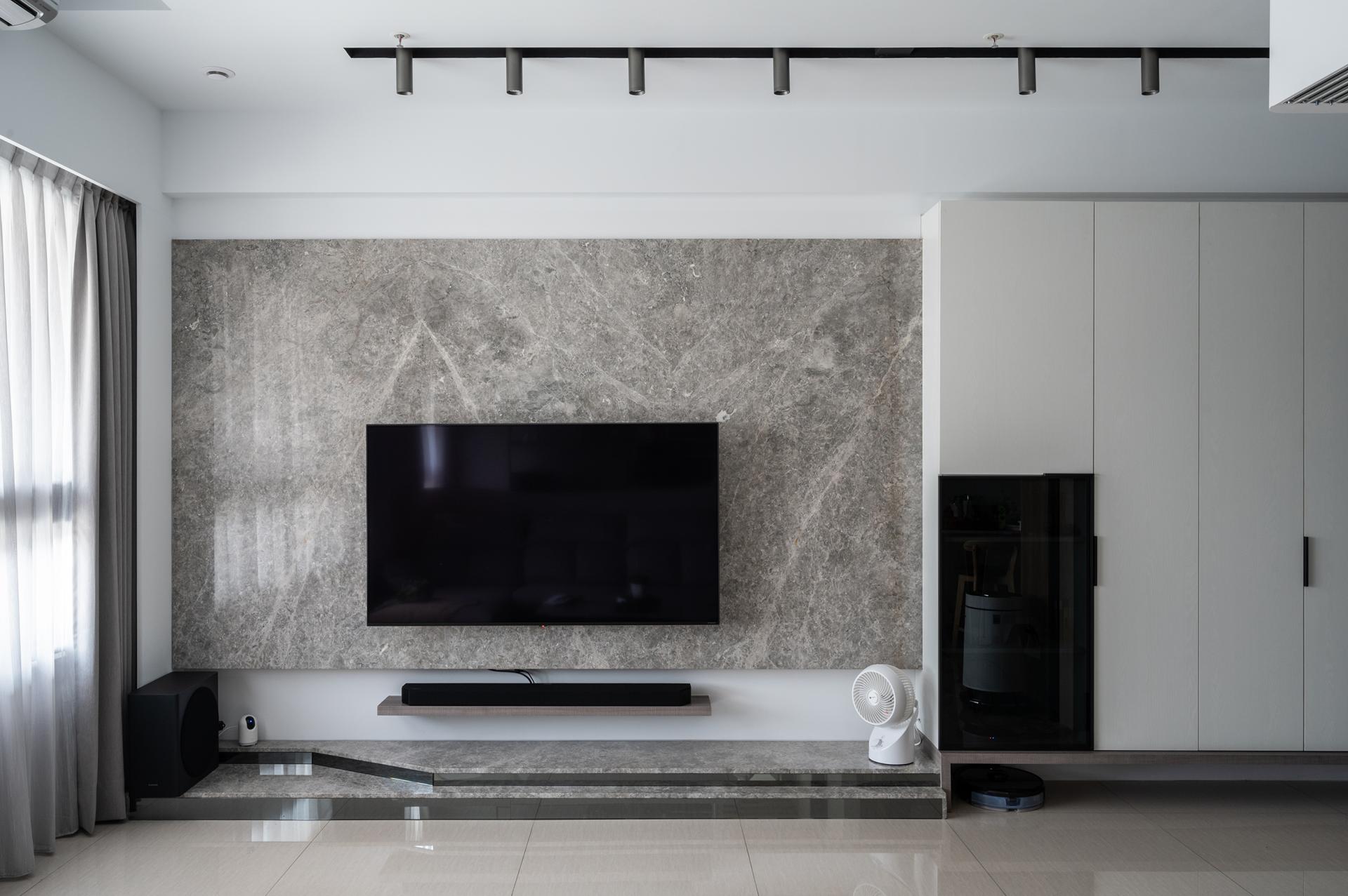 Material selection combines a stone-pattern TV wall, light wood veneer, and black metal elements to create a layered yet warm composition. In the master bedroom, a white metal-framed wardrobe resembles a display cabinet, presenting storage with clarity and order. The overall space reveals a relaxed and flowing lifestyle within abundant daylight and clean architectural lines.