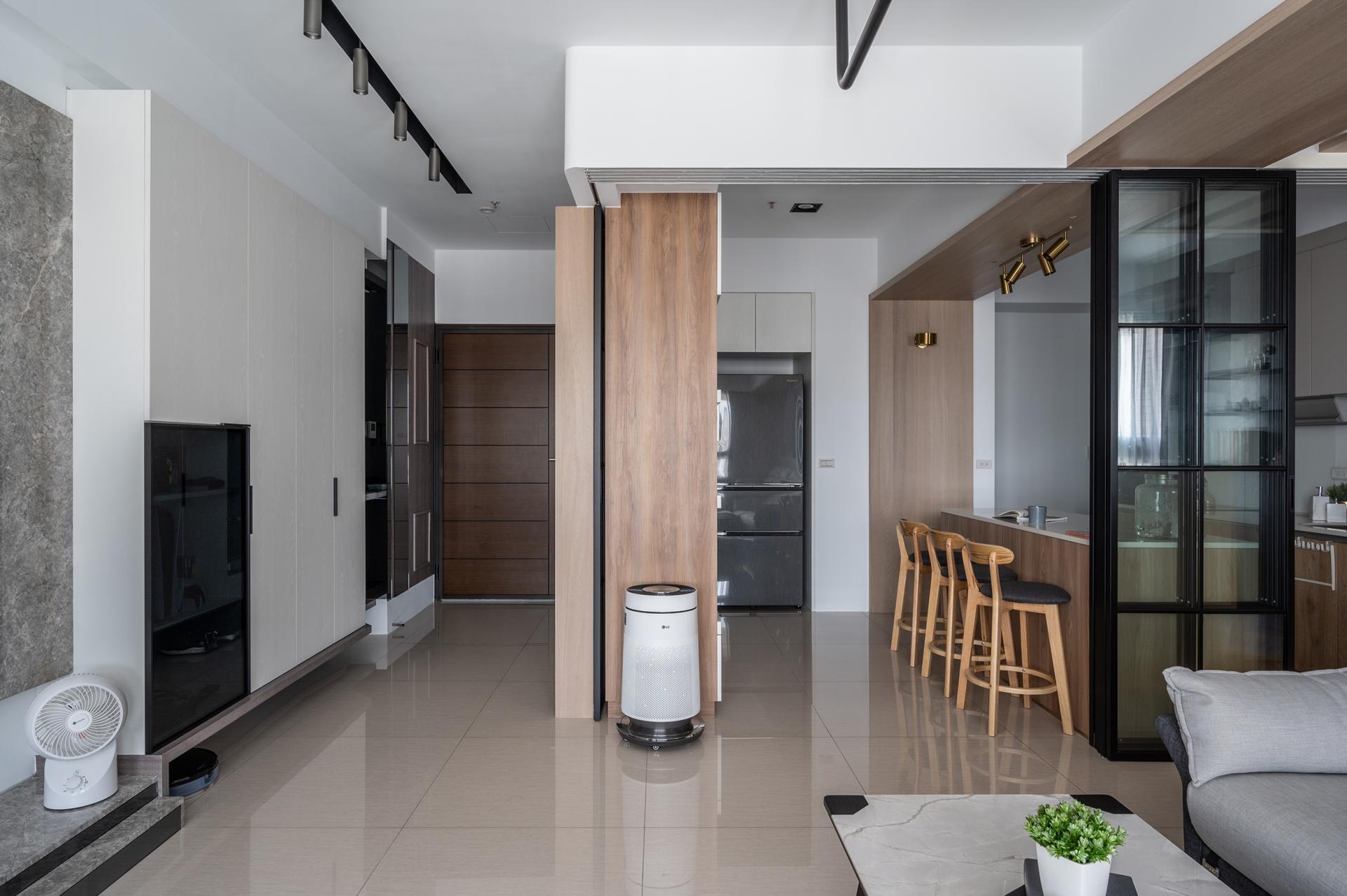 Located on the eighth floor, the residence enjoys expansive river views. The 178.5 square meters home is planned as four rooms, a living room, and a dining room. The design adopts a modern style, responding to the homeowner’s lifestyle of hosting gatherings and exercising at home by integrating social interaction, relaxation, and physical activity within a unified living space.