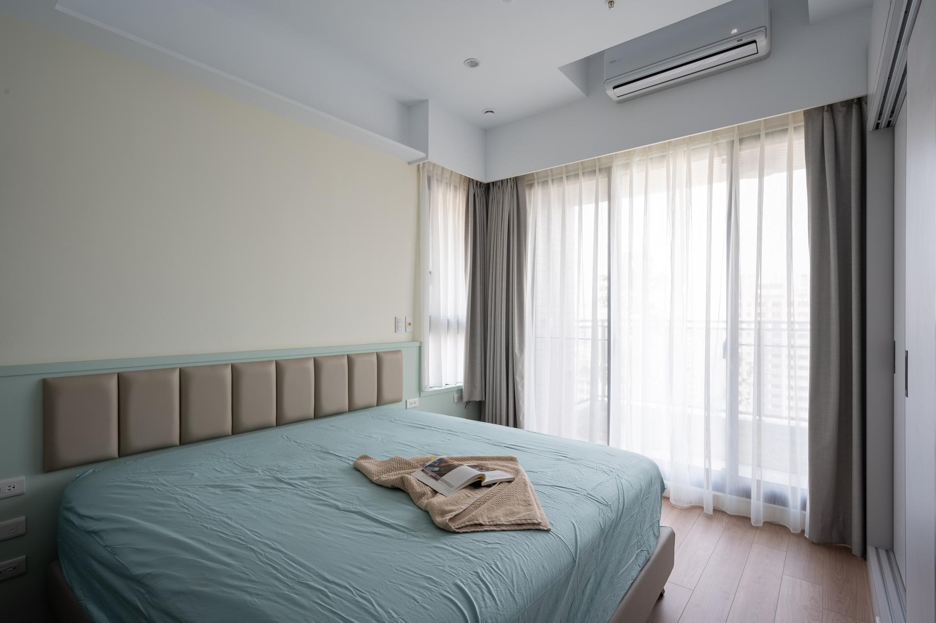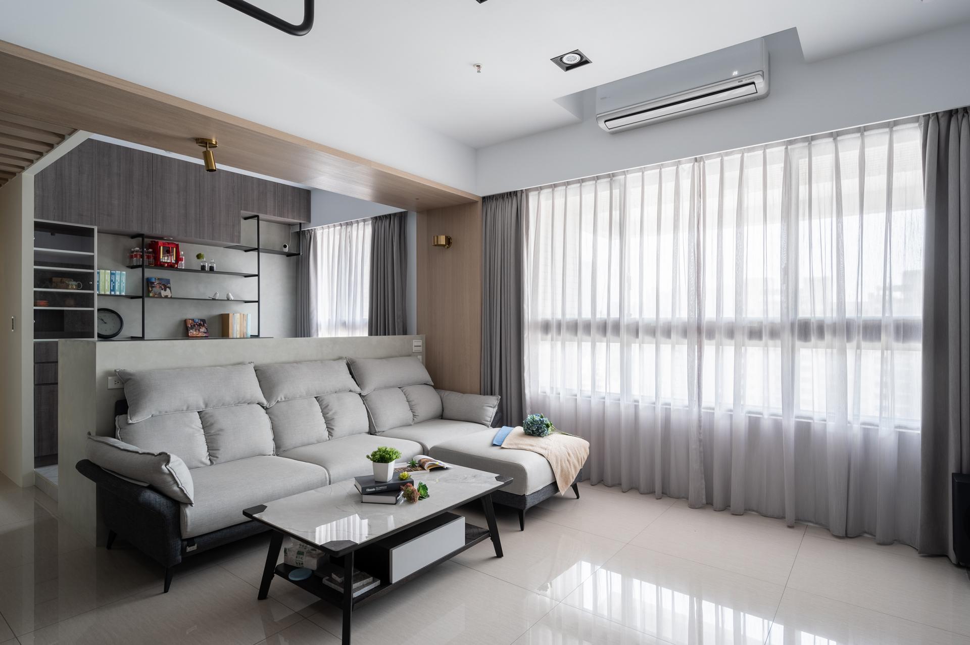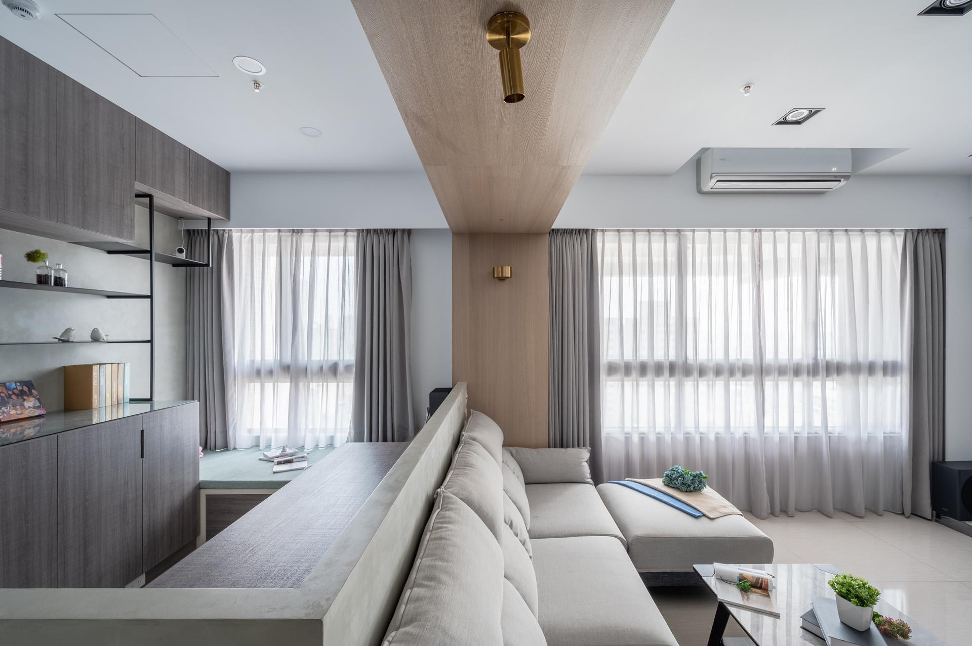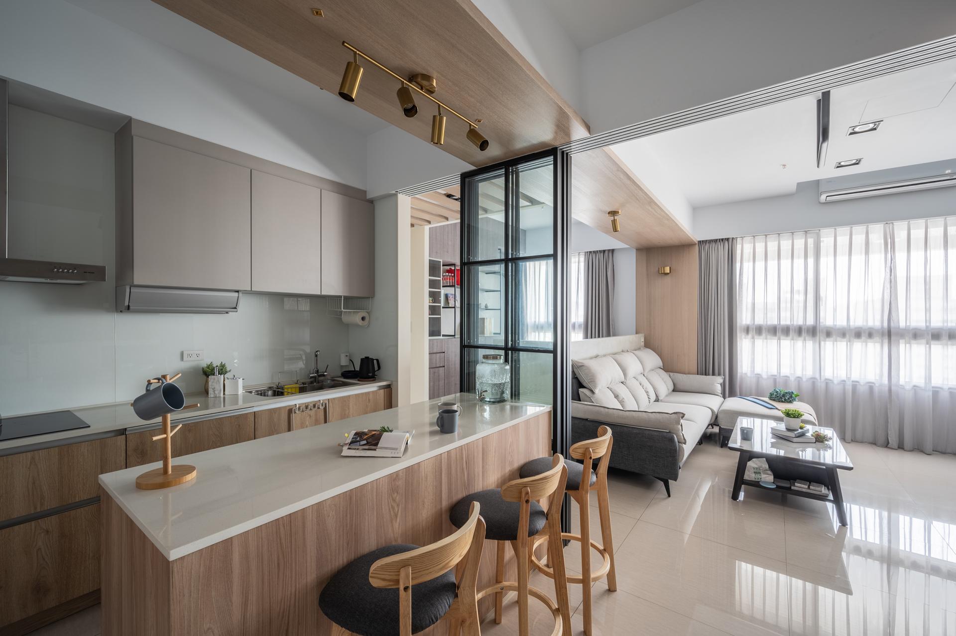 The social area follows an open layout so that the living room, dining kitchen, and open study share natural lighting along the long side of the plan. The window-side daybed becomes a quiet corner for reading and reflection. The dining kitchen includes an island table, while glass sliding doors provide flexible boundaries that maintain openness while controlling cooking fumes when necessary.