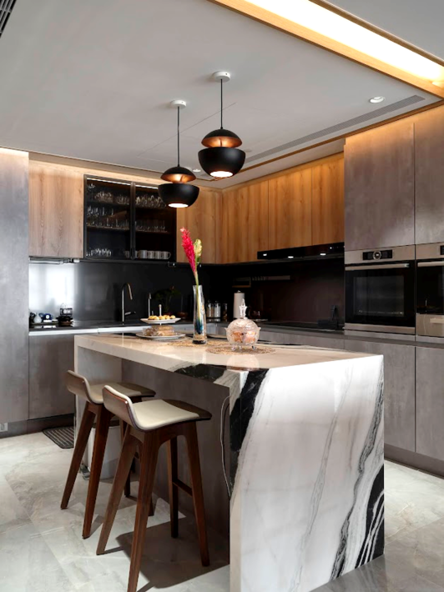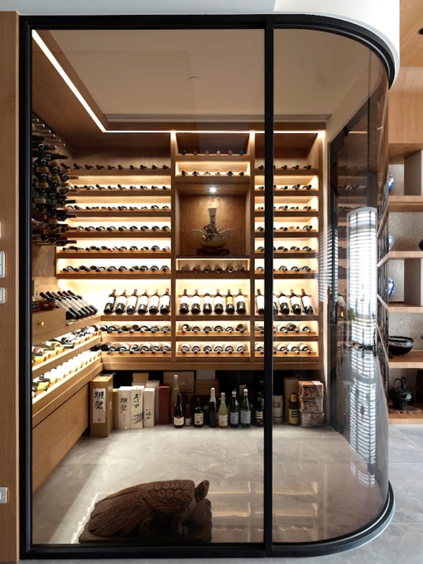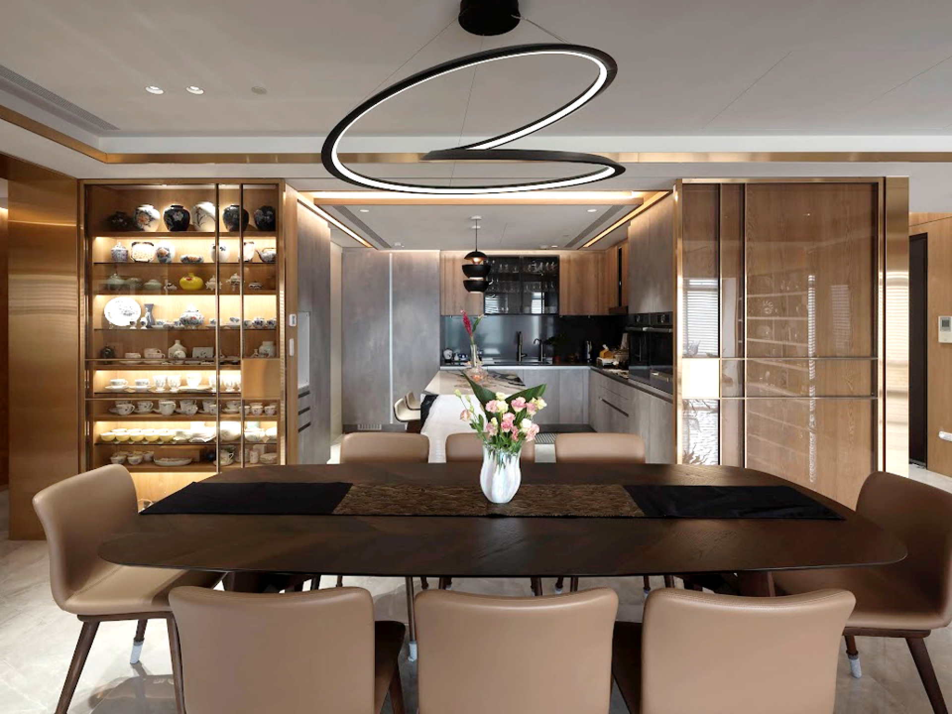 As one navigates through the open layout, the transition from solid walls to a striking open display wall behind the sofa and a chic glass wine cellar introduces a sense of transparency and flow. This rounded design language extends gracefully to the ceiling, linking sightlines and enhancing the overall sense of fluidity throughout the space. Positioned at the very heart of the home, the dining area presents a sophisticated dark wood table, artfully paired with a captivating circular pendant light. The combination of recessed lighting and thoughtfully designed display cabinets creates a dynamic living scene, seamlessly balancing the joys of social entertaining with the appreciation of art.