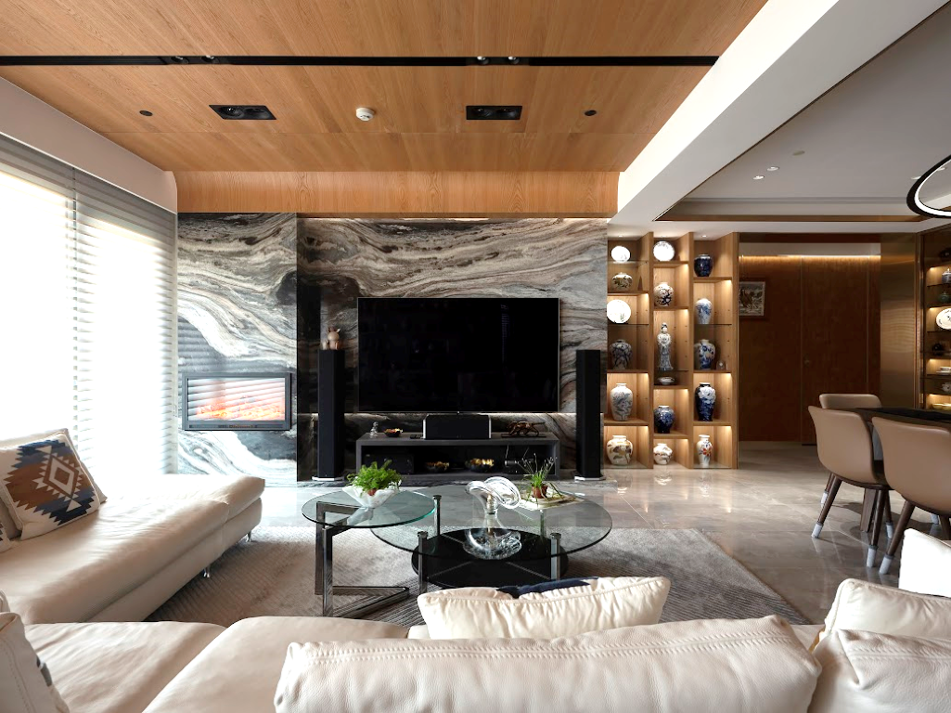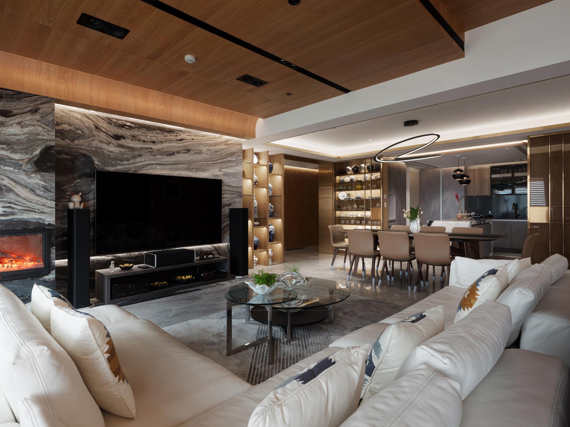 This project intricately explores the concept of the “interplay between form and void,” transforming the traditional residence into a captivating gallery-like living space. The circulation of the home begins with an inviting entrance hall, where a dedicated dust-settling zone showcases a stunning stone accent wall that serves as a striking focal point. The natural veining in the stone flows gracefully, reminiscent of elegant ink wash paintings. Meanwhile, the gently curved walls soften the visual impact of structural beams and columns, creating a seamless pathway that guides visitors into the public areas of the home. Upon entering the living room, one will be instantly captivated by the harmonious integration of the living and dining spaces. Here, a large-patterned stone TV wall and a beautifully crafted wooden ceiling define the area, setting an inviting scale for relaxation and communal gatherings. The electronic fireplace stands as an artistic centerpiece, elegantly bridging the contrast between warm and cool materials.